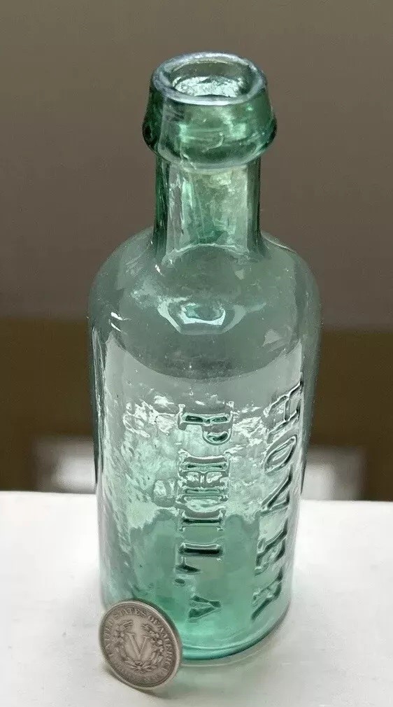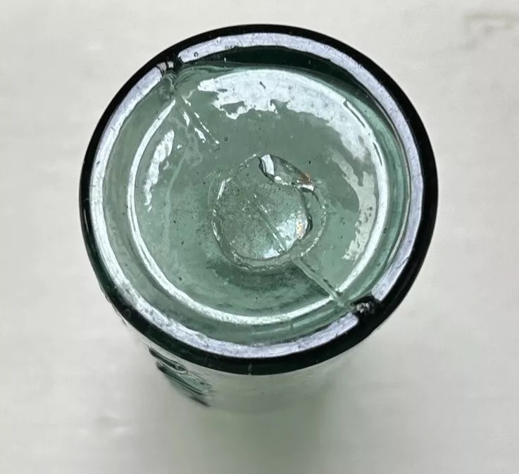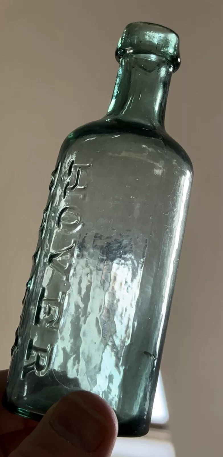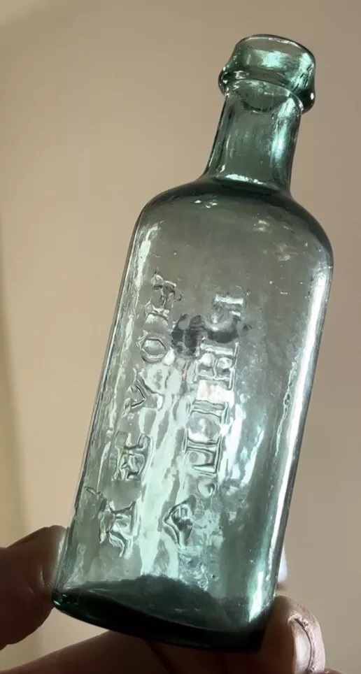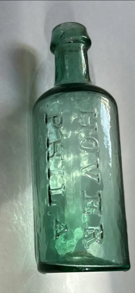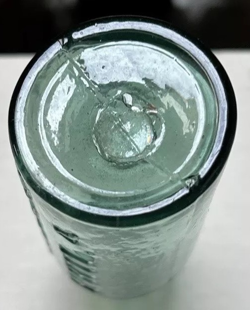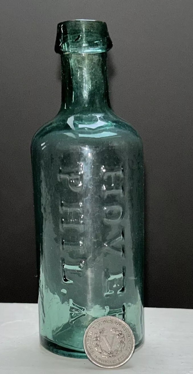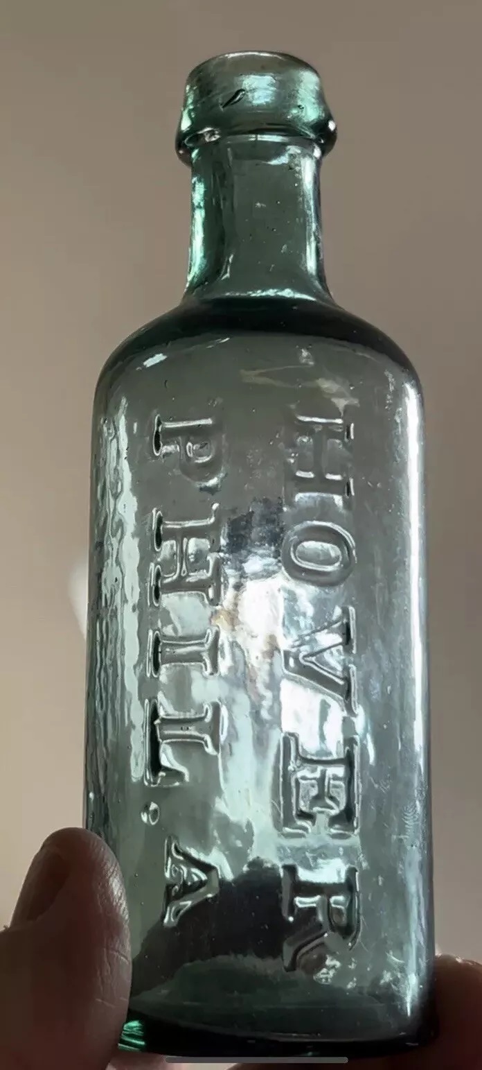 An 1840’s era “Master Ink” bottle from Philadelphia, Pennsylvania. The cylindrical shaped bottle was crudely “mold-blown” of a deep teal-green colored glass. The unevenly thick sides of the bottle are nicely rippled with “whittle marks” and contain suspended air bubbles of various sizes. The front side of the bottle displays vertically in early-style font embossed letters: HOVER – PHILA. The top of the bottle has a crude applied, single-sloping, collared “lip finish” that was “hand-tool-formed”. The bottom of the bottle is thick, crooked, nicely textured, and features a slightly pushed-up “open pontil scar” that is about the size of a U.S. dime.