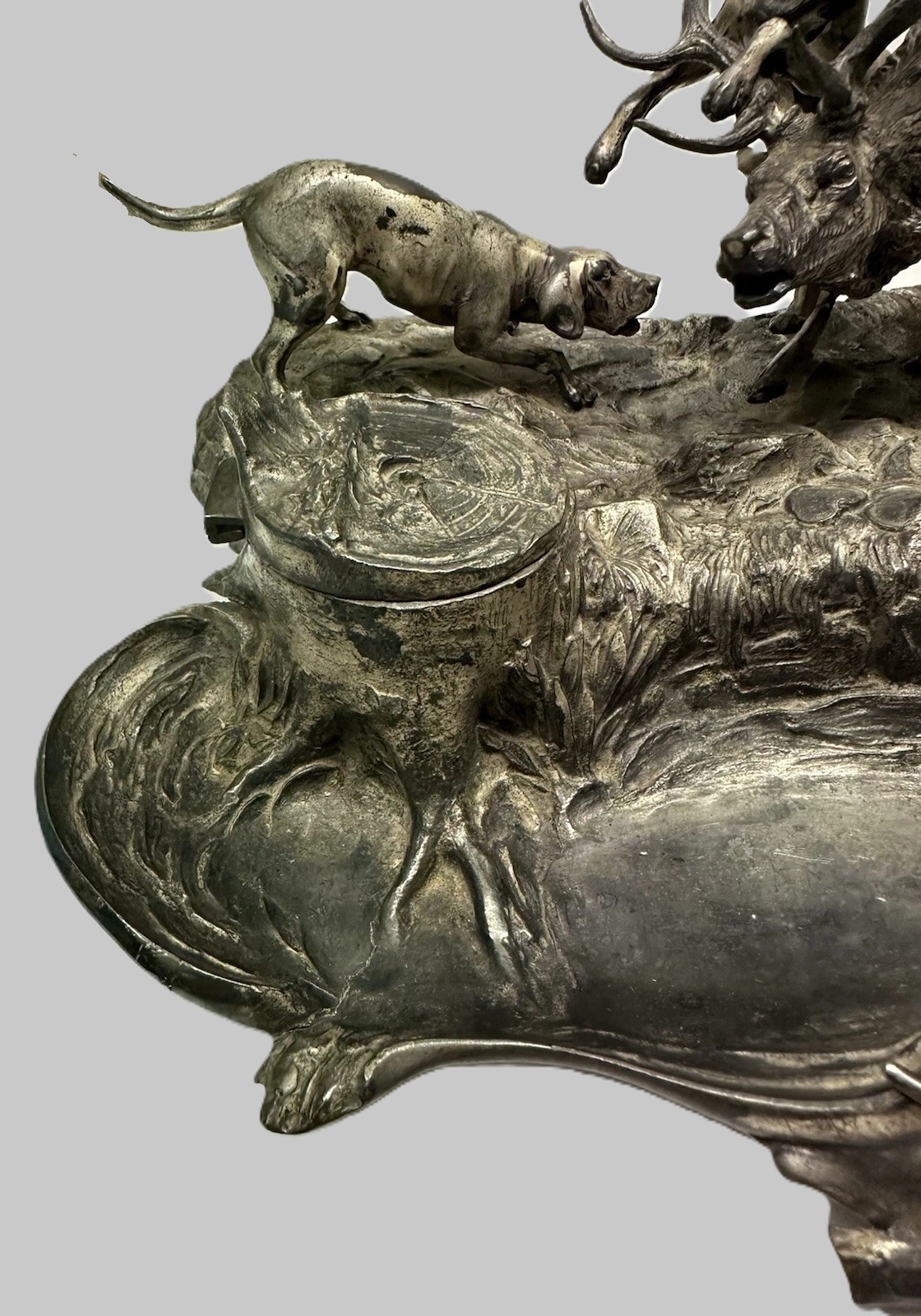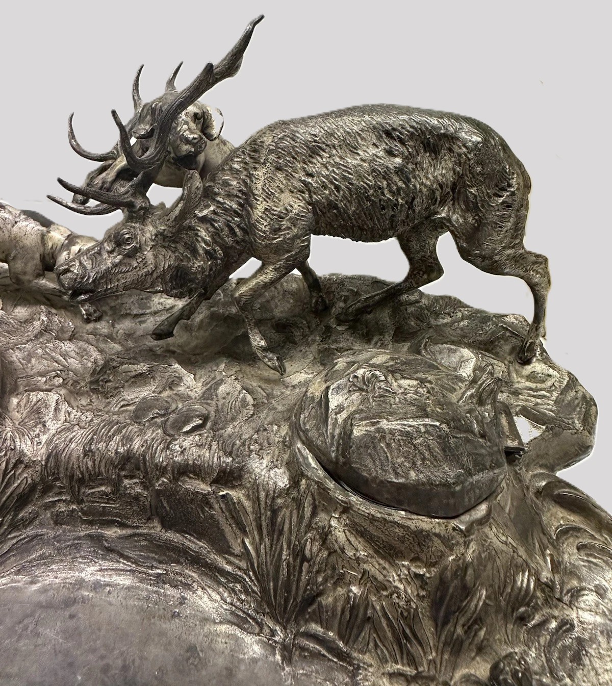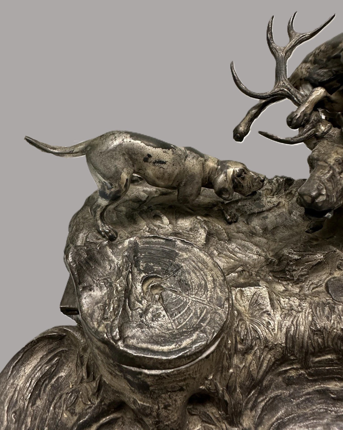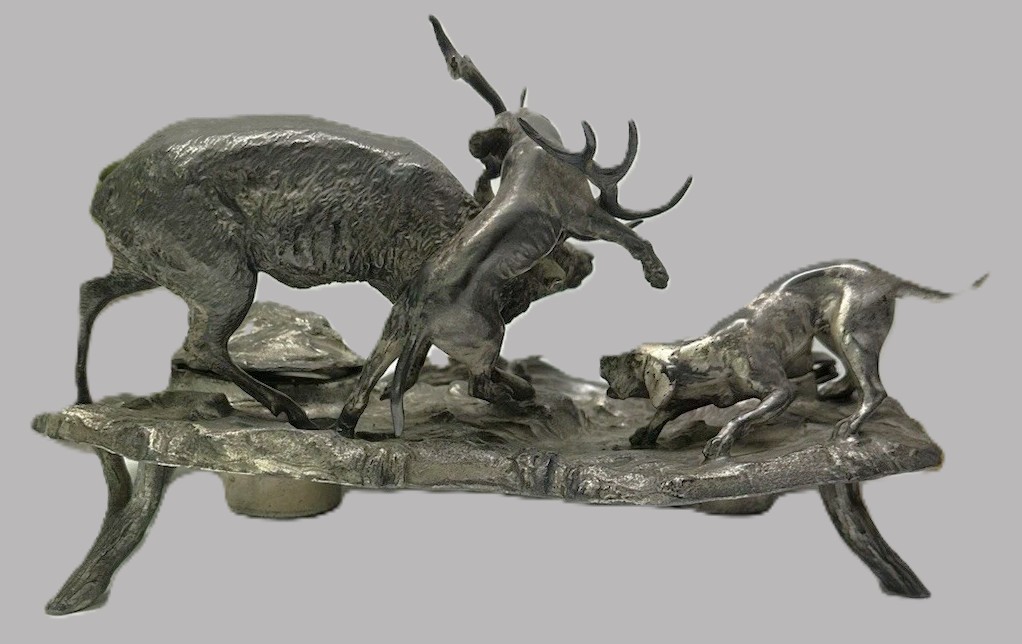 While many companies produced hunting scenes, the design of this piece matches the output of European manufacturers who specialized in “Art Spelter” or “Regule,” a white metal alloy that was bronzed or silvered to give the appearance of fine metal at a more accessible price point.