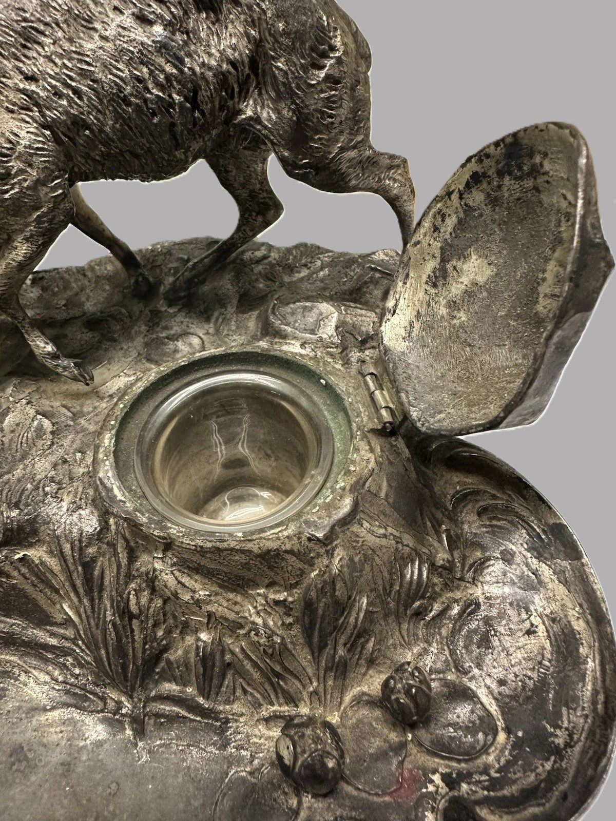 This double inkwell is attributed to the foundries of France or Germany, produced during the late 19th or early 20th century (circa 1890–1910).