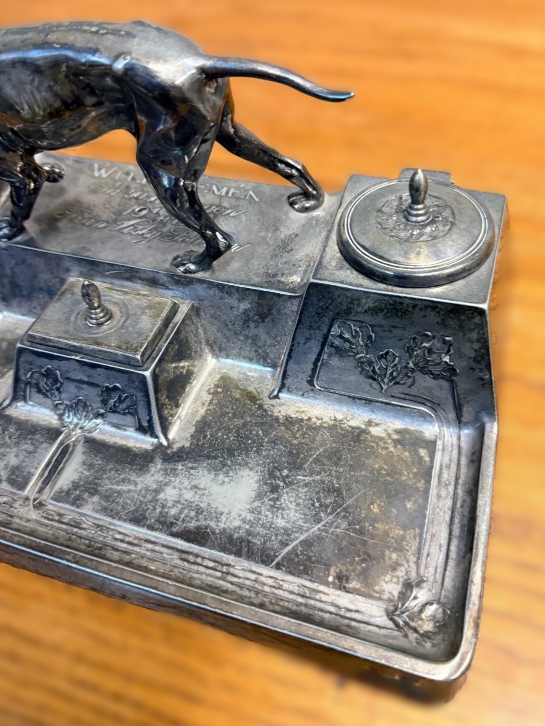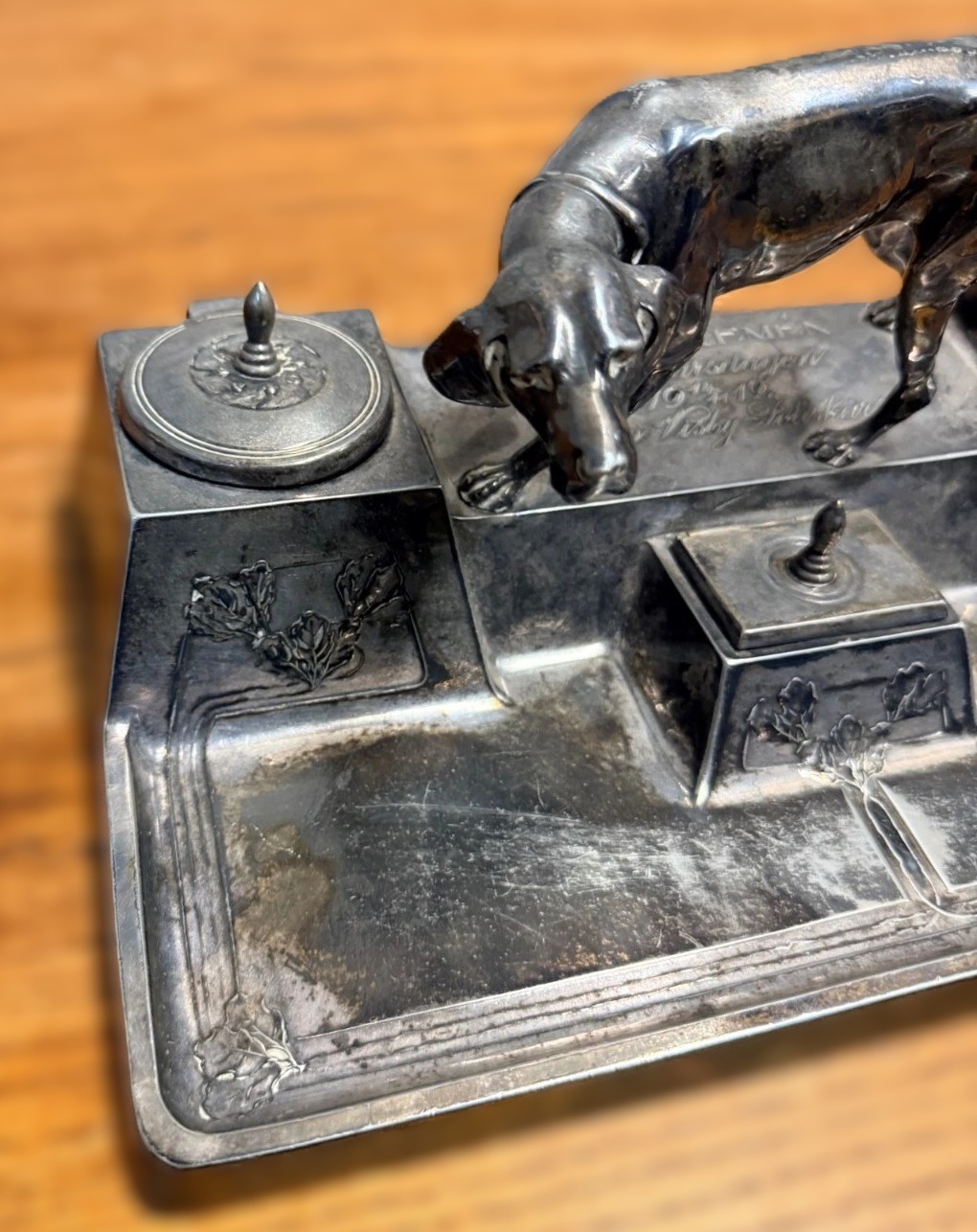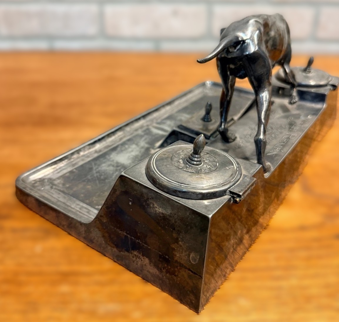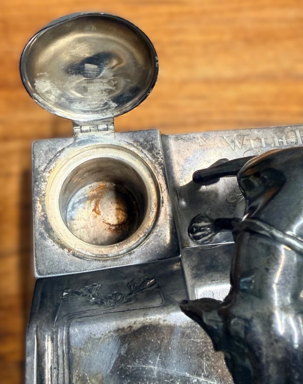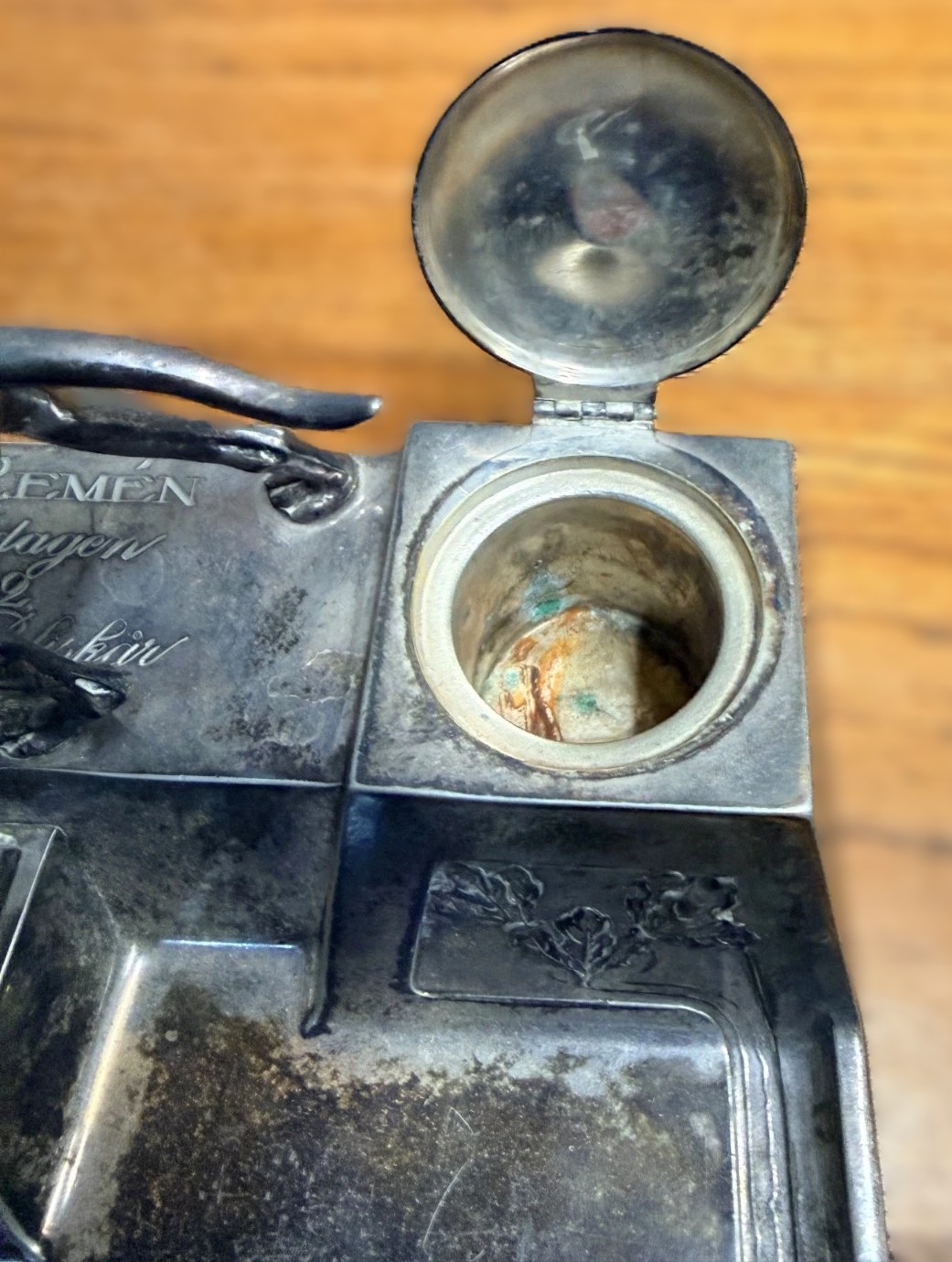 - The Wells: It features two side inkwells with hinged lids. While the metal lids are present, the inserts (ink pots) are missing.