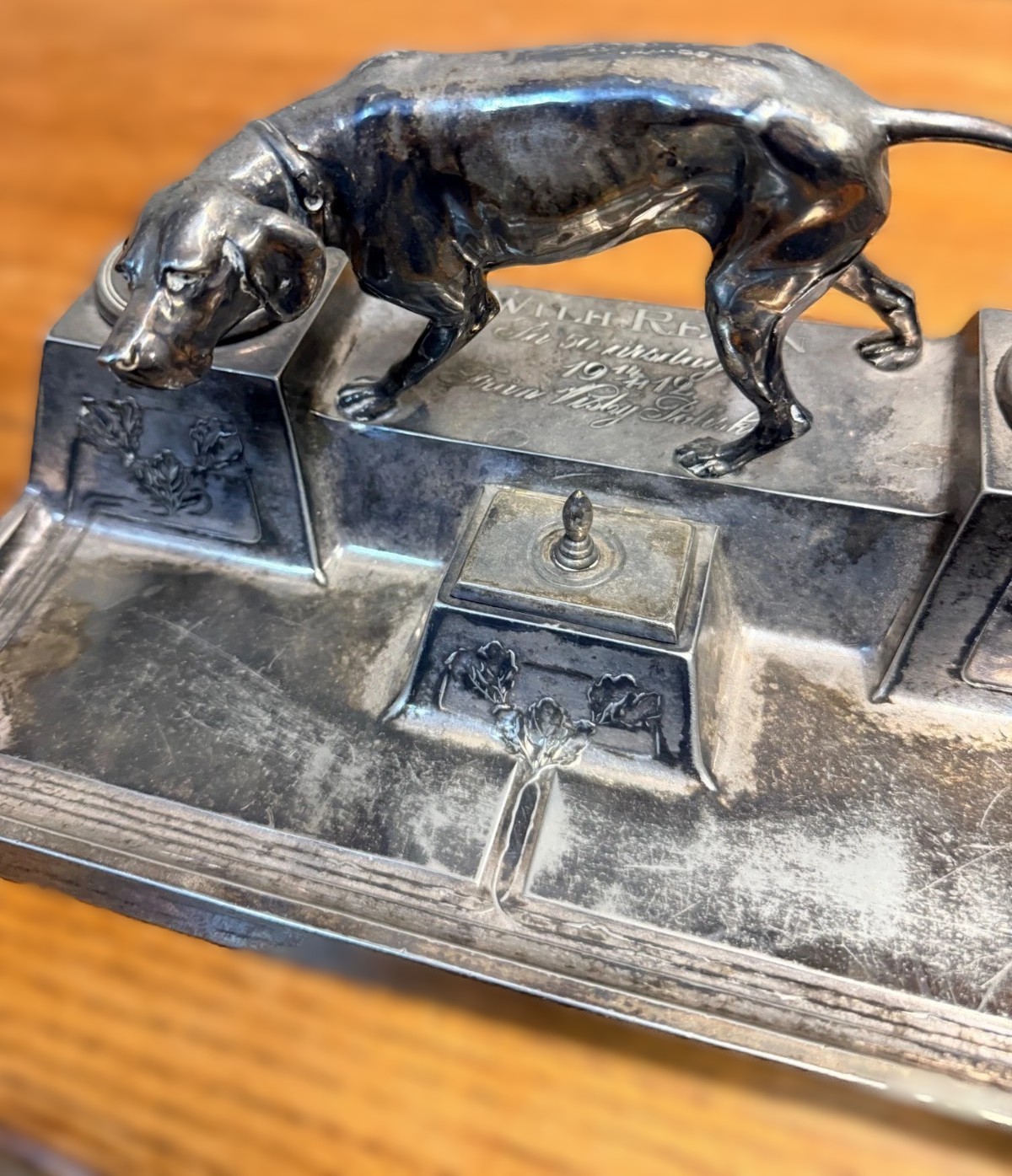 - Aesthetic: The base is decorated with embossed floral and foliate motifs characteristic of the Art Nouveau style, with flowing lines that transition into the pen tray in the front.