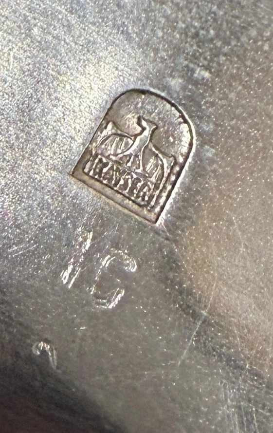 The underside is marked with the name “KAYSER” and an eagle (sometimes referred to as a phoenix), which was the trademark for J.P. Kayser & Sohn. Founded in 1862, the company became famous in the 1890s for its patented lead-free pewter alloy known as Kayserzinn.