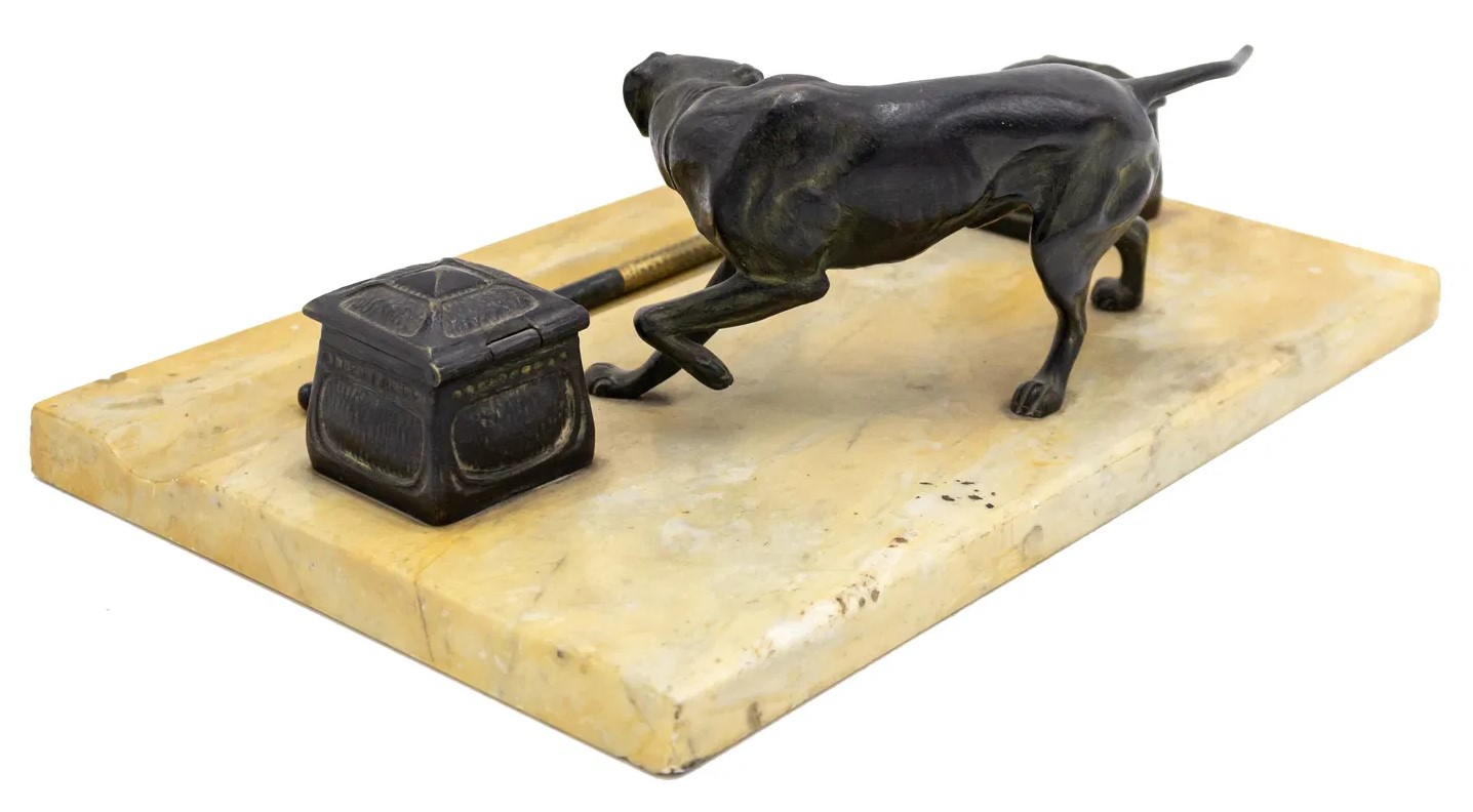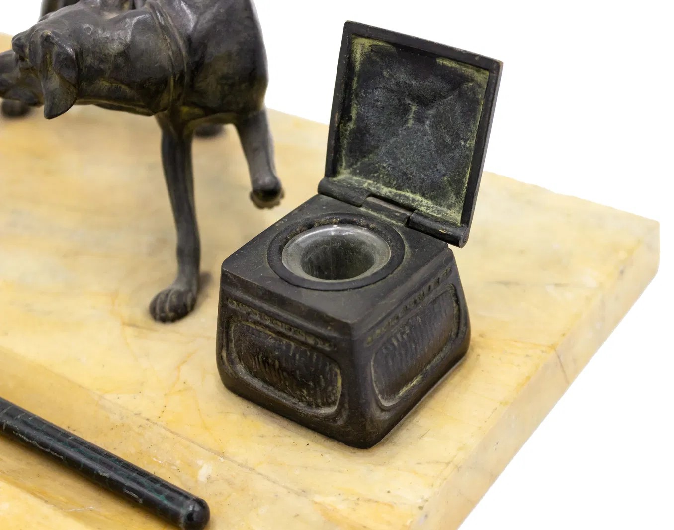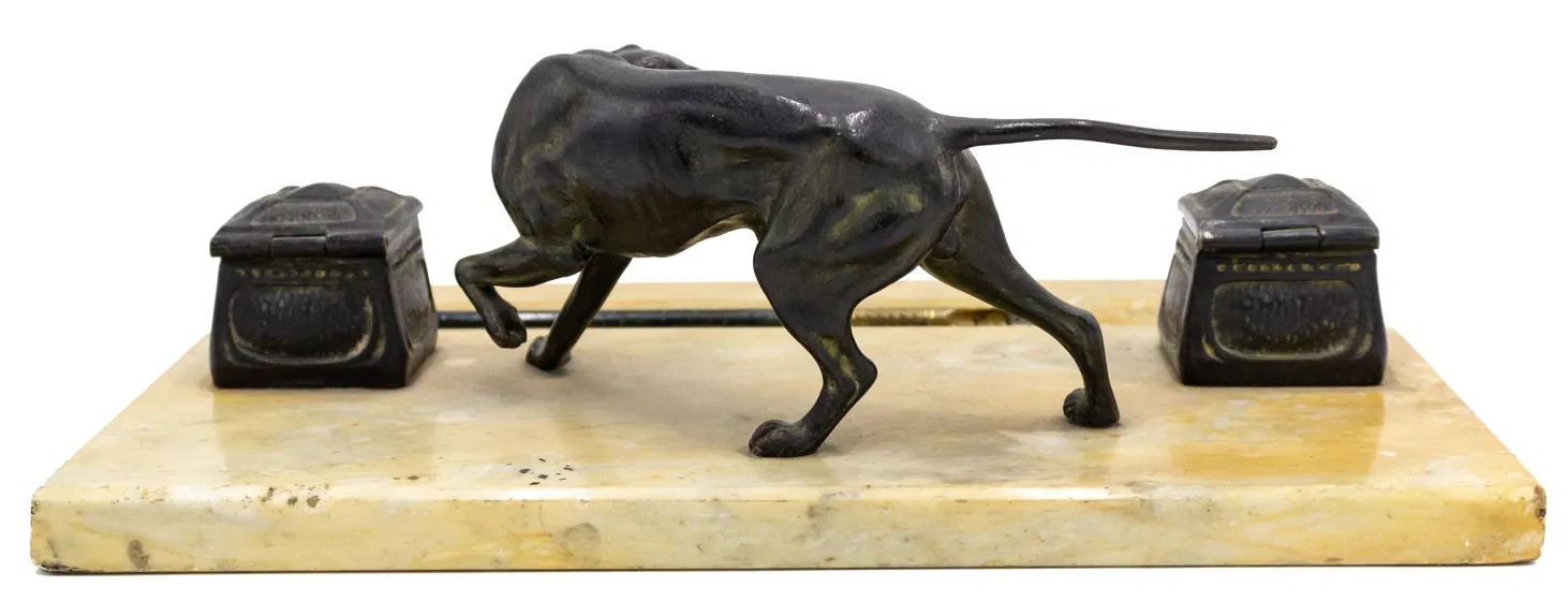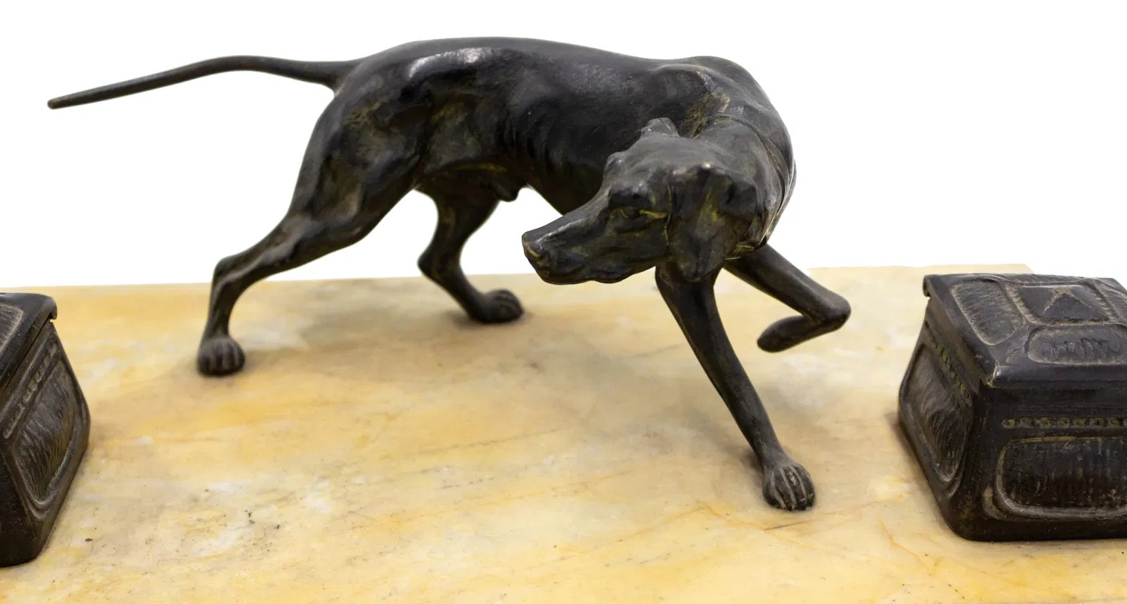 This English Victorian Sienna marble, rectangular double inkwell features a hunting dog, possibly a pointer or a similar breed, characterized by its lean body, muscular build, and alert stance. Two inkwells with hinged lids flank the dog on each side.