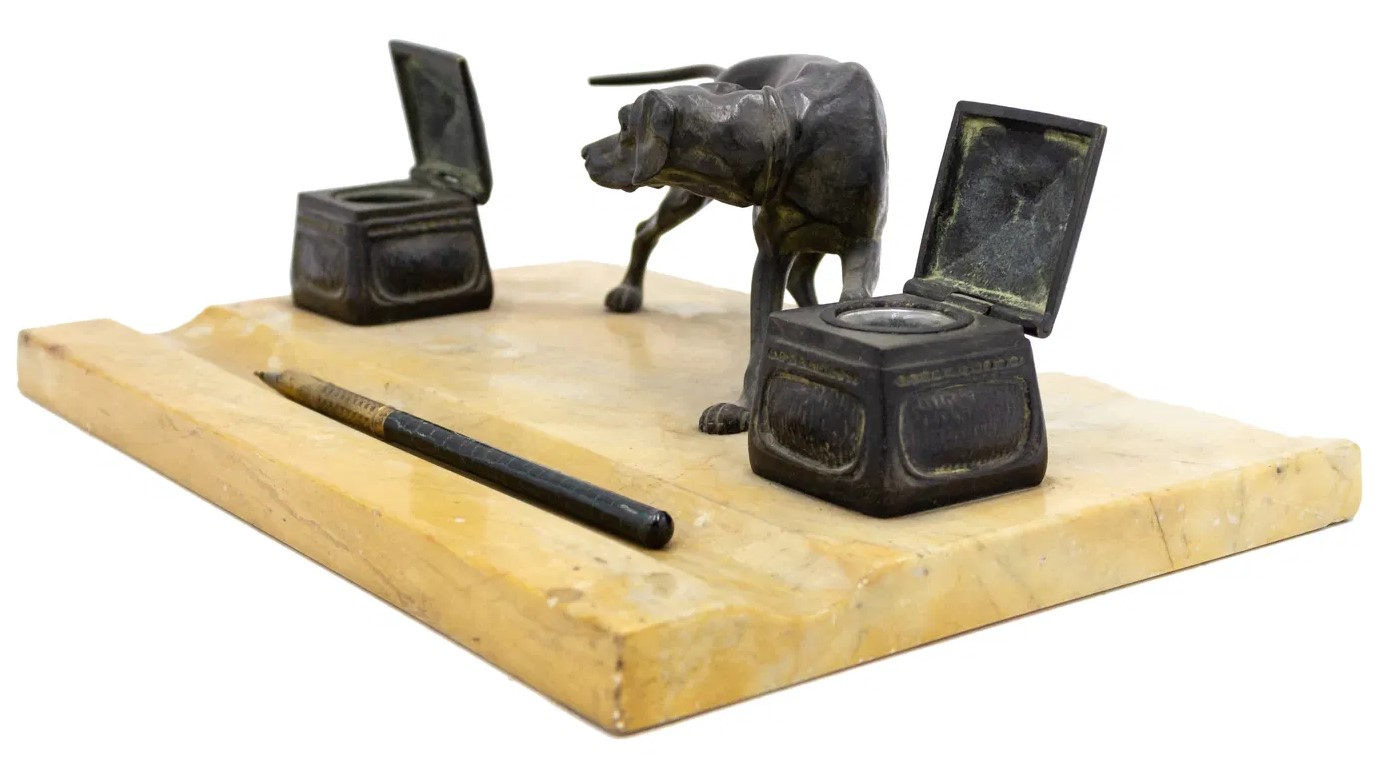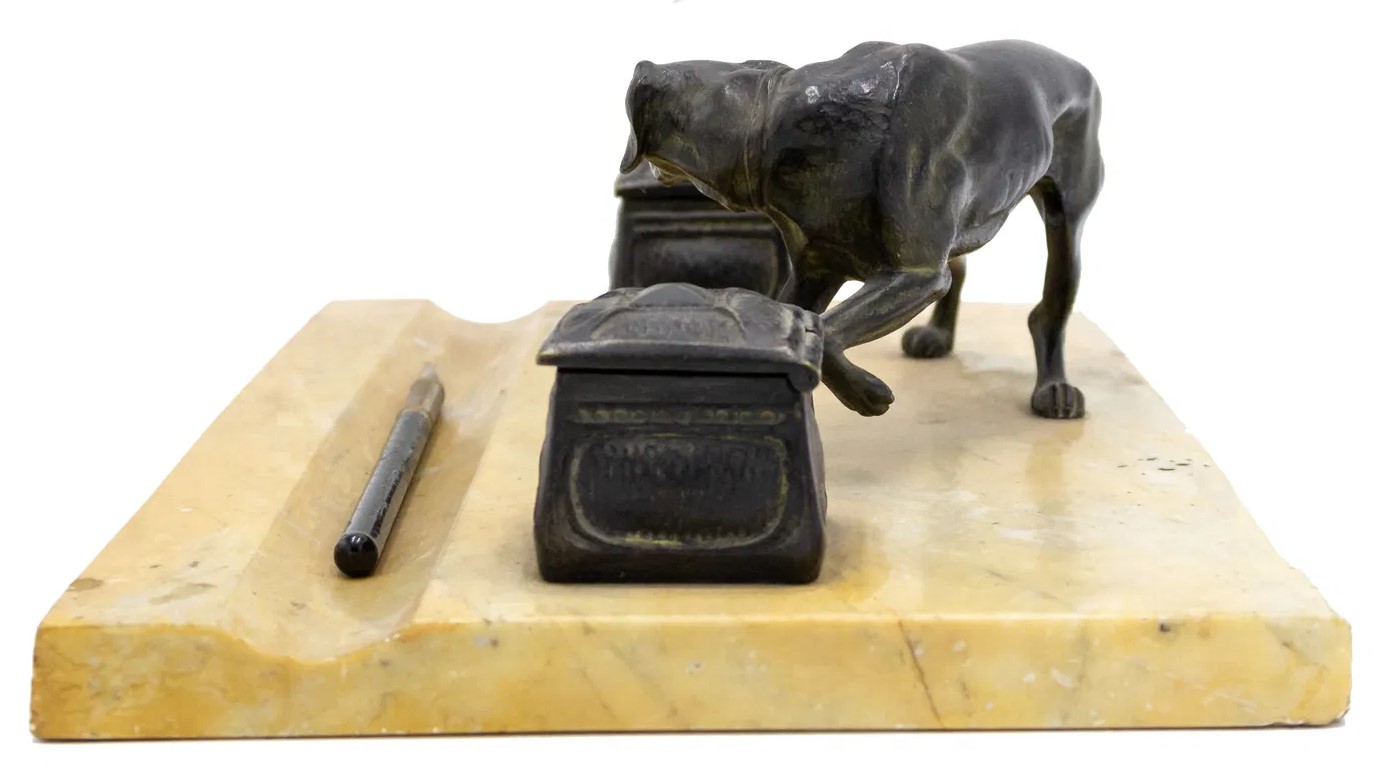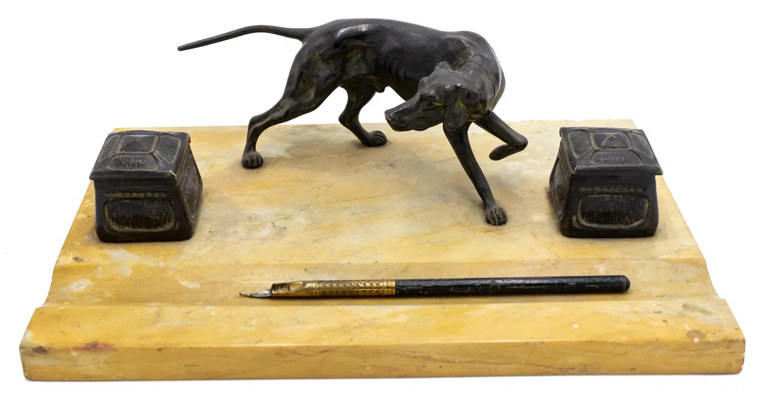 This English Victorian Sienna marble, rectangular double inkwell features a hunting dog, possibly a pointer or a similar breed, characterized by its lean body, muscular build, and alert stance. Two inkwells with hinged lids flank the dog on each side.