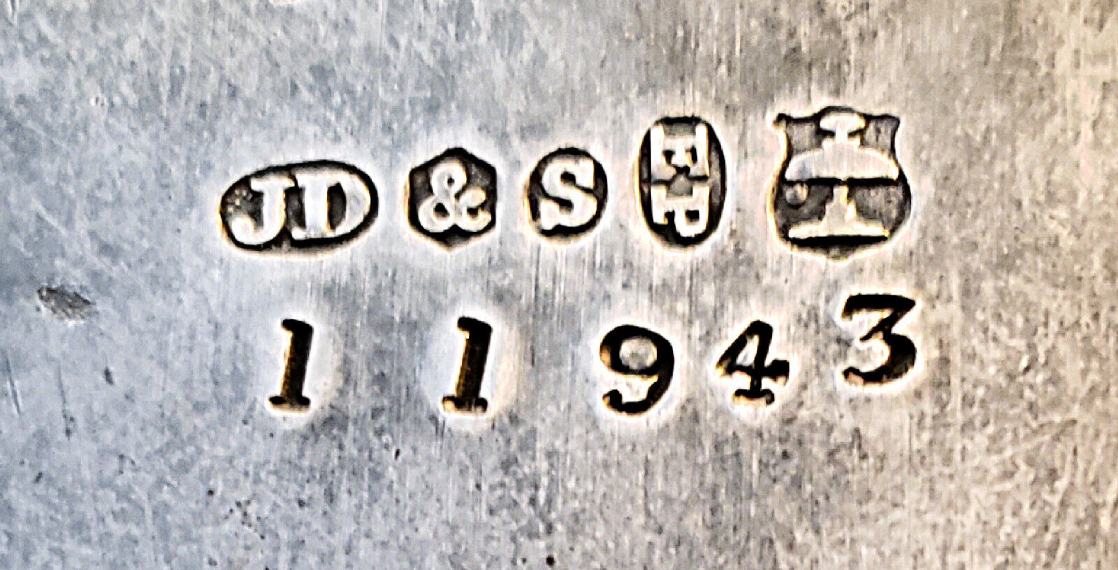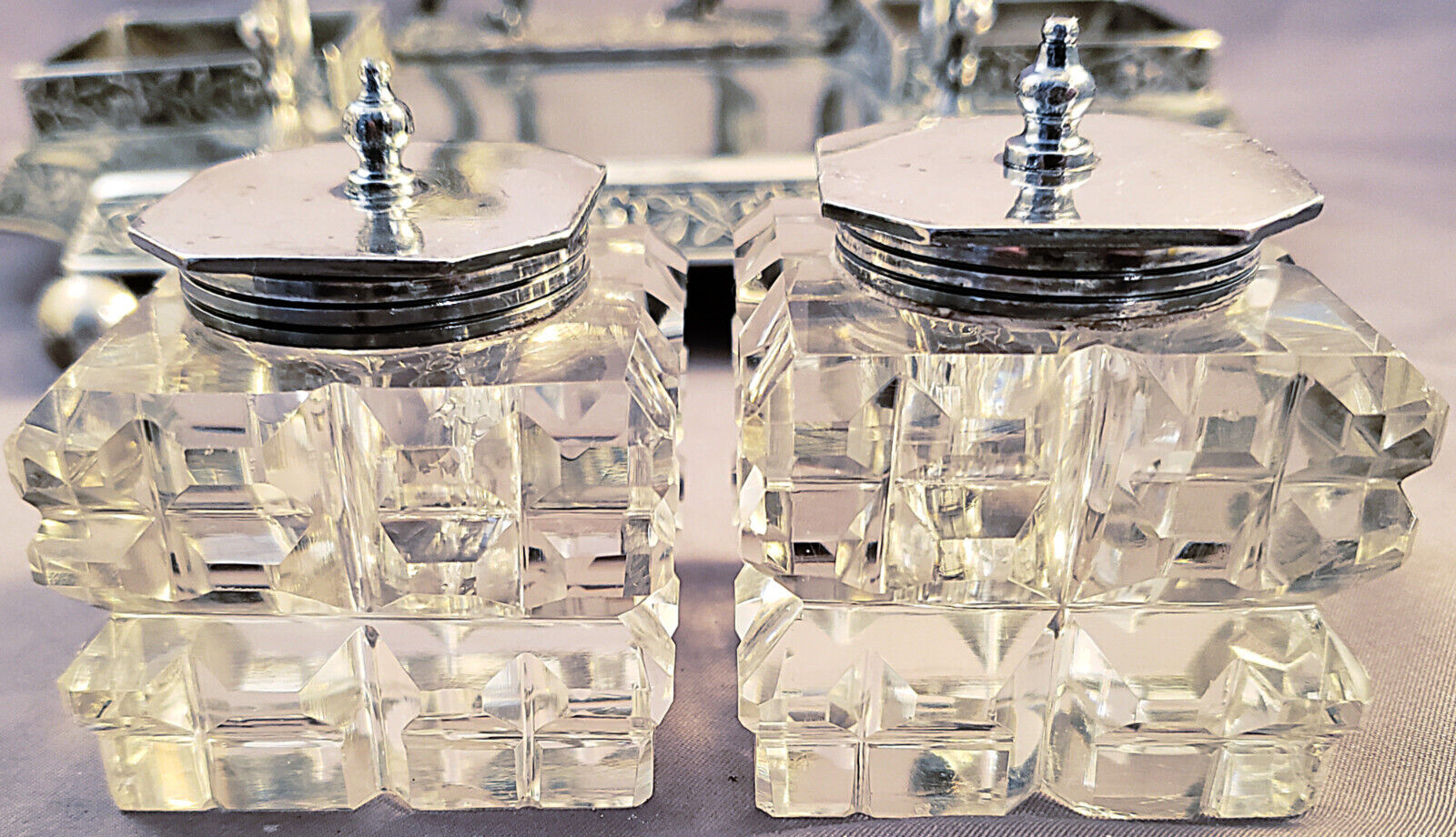 A hunting dog stands between two inkwells on an inkstand with ball feet and a decorative floral border. The matching inkwells are 1 ¾” square with deeply cut stacked waffle pattern. The inkstand is marked electroplate and was made by James Deakin & Sons, Sheffield England.
