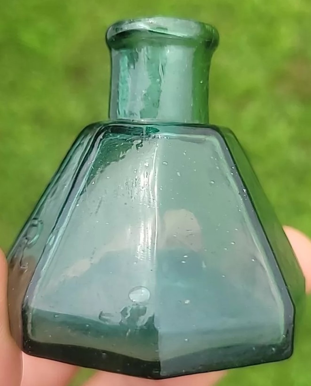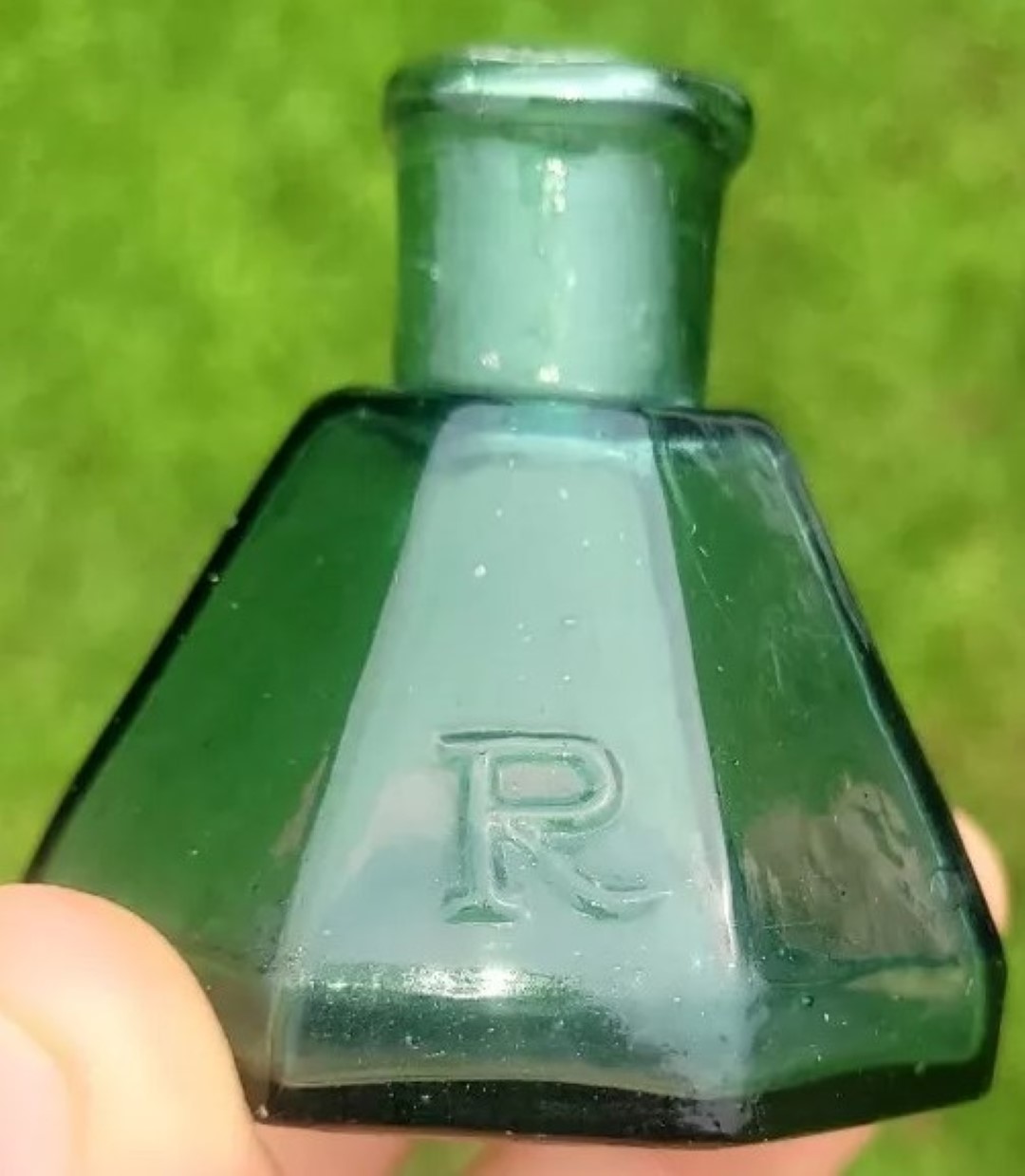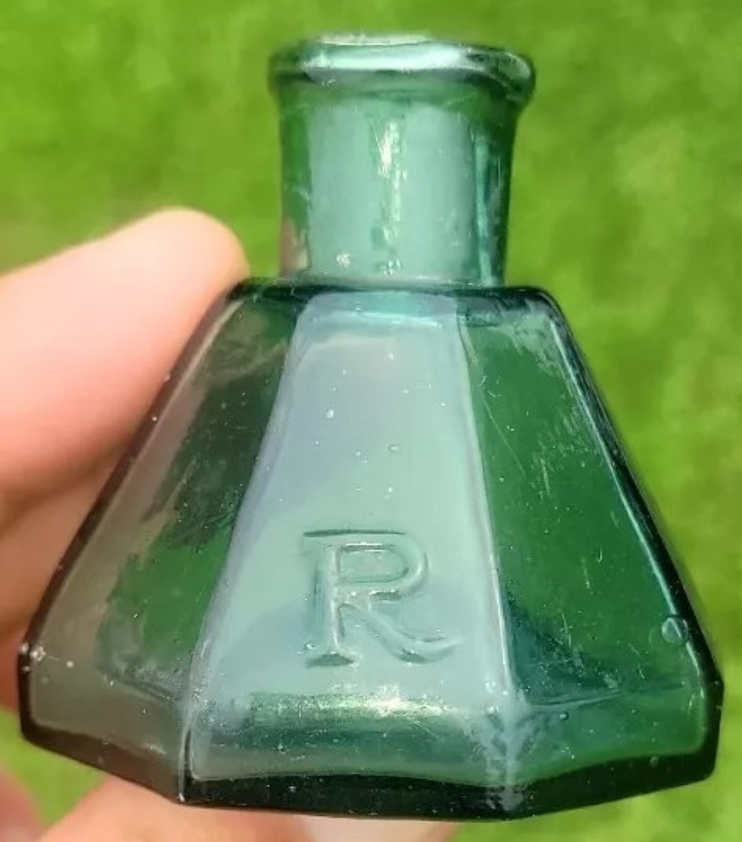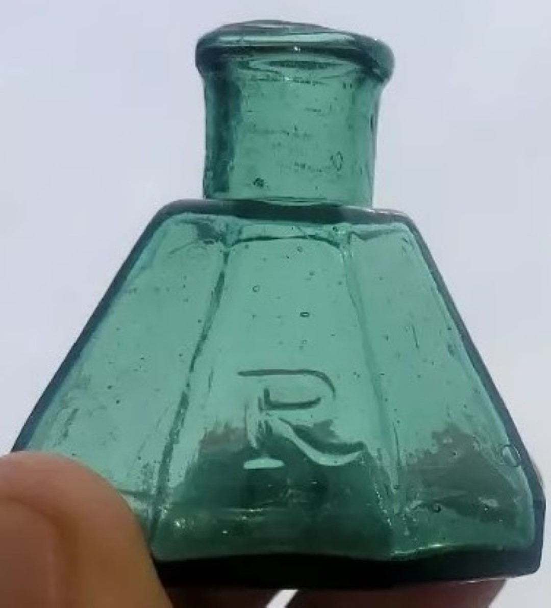 An 8-sided, green, pontiled ink bottle with the letter “R” embossed on one of the panels.