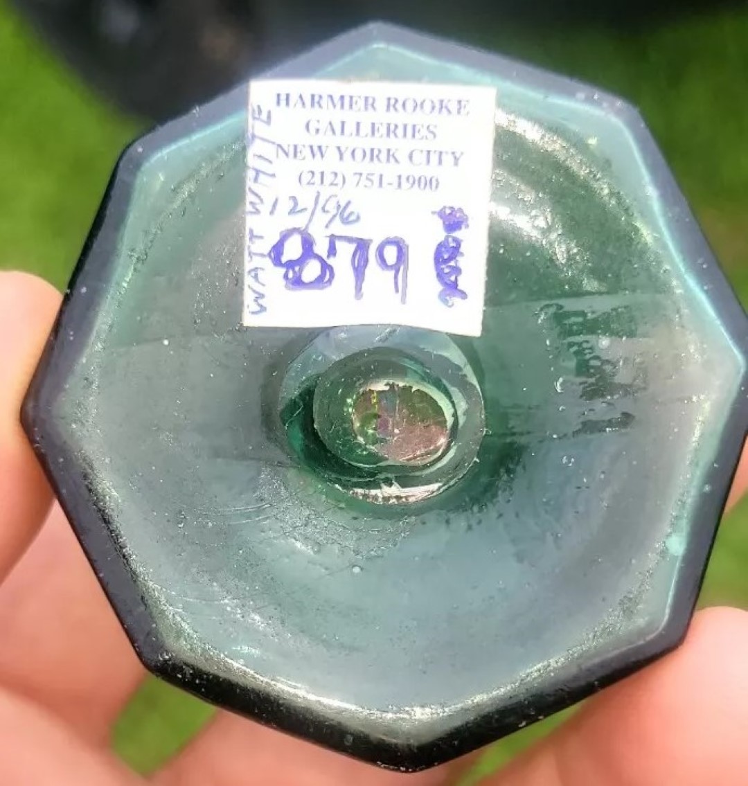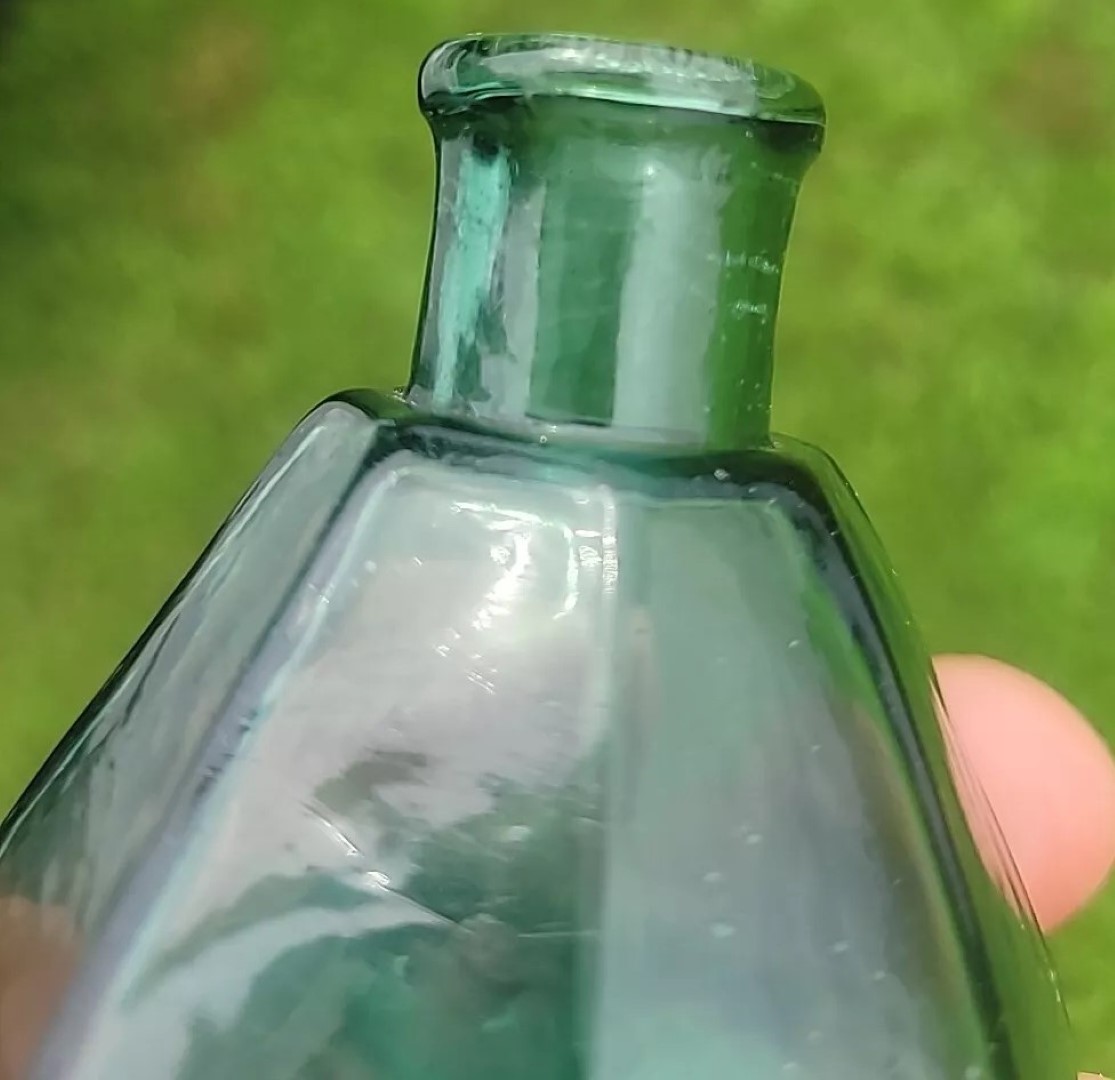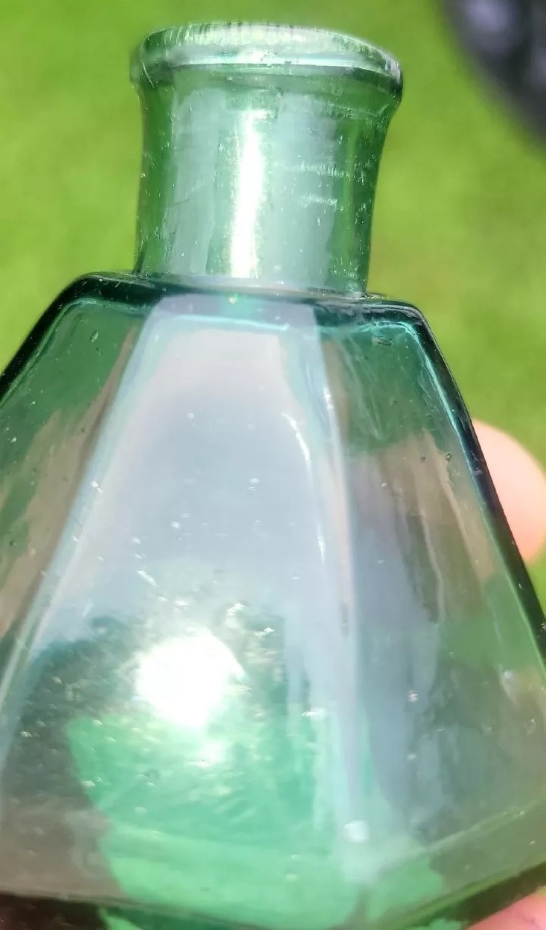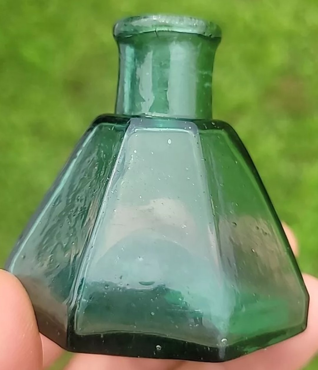 An 8-sided, green, pontiled ink bottle with the letter “R” embossed on one of the panels.