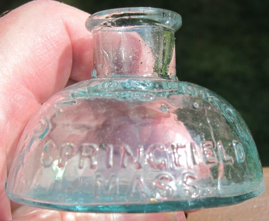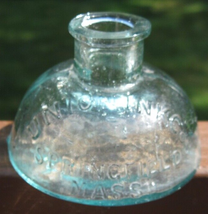 An aqua ink bottle marked “Union Ink Co, Springfield Mass” is a two-piece mold, hand-formed neck and lip bottle. No marks on the flat bottom. No flaws or defects – perfect glass, not a dug bottle.