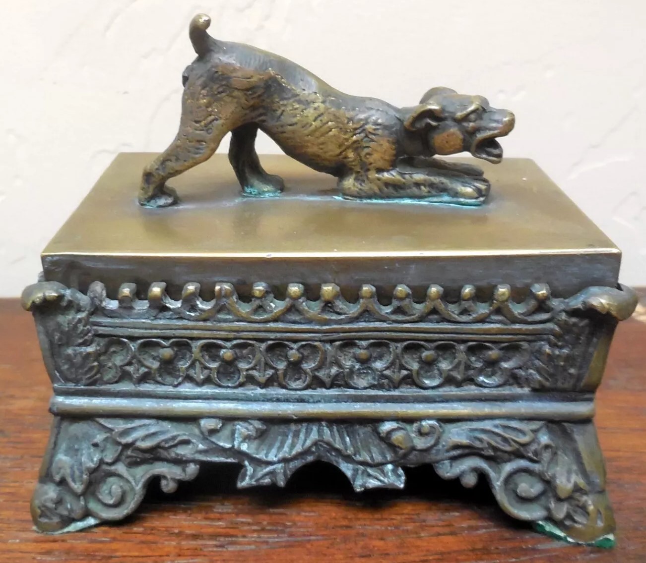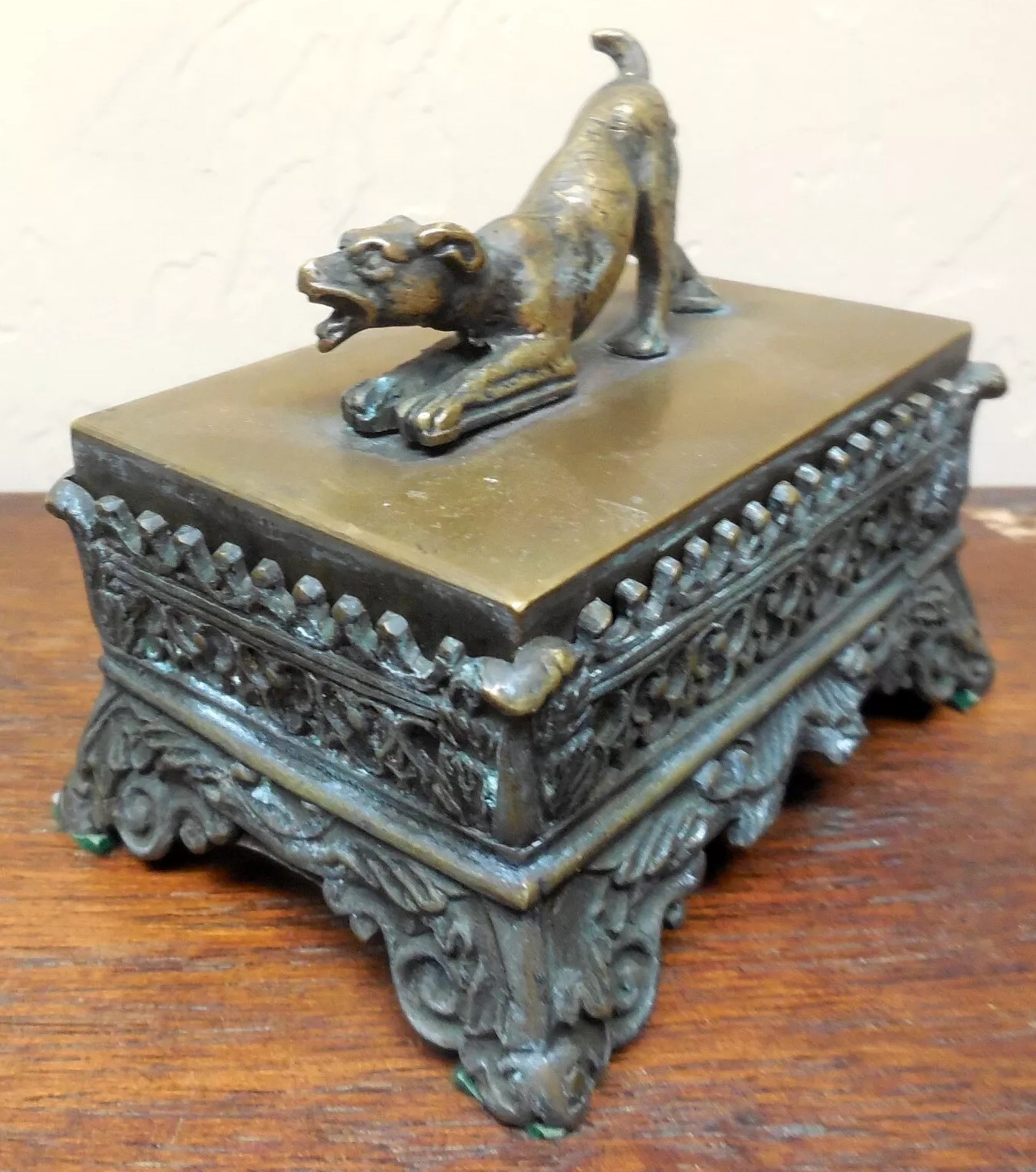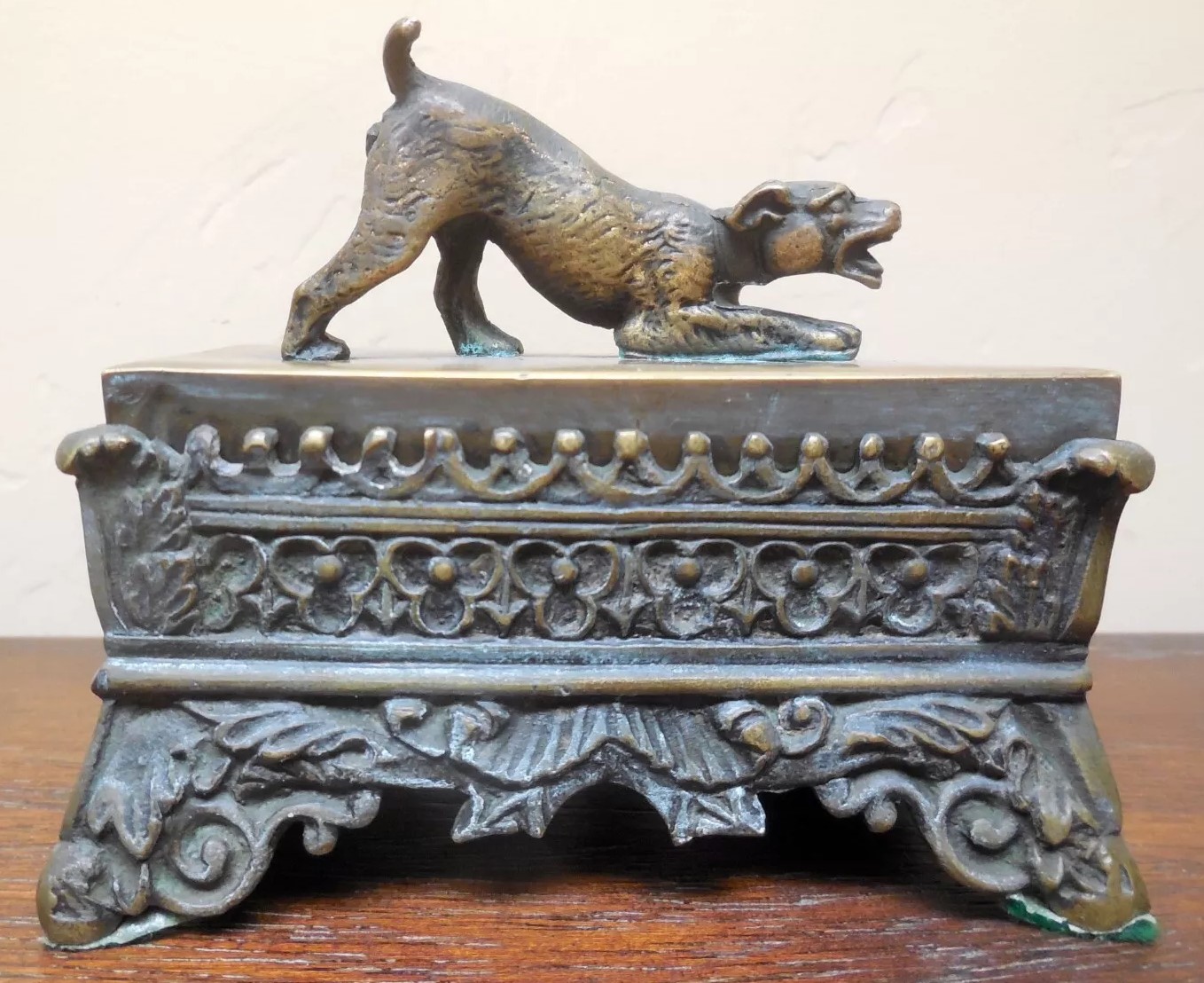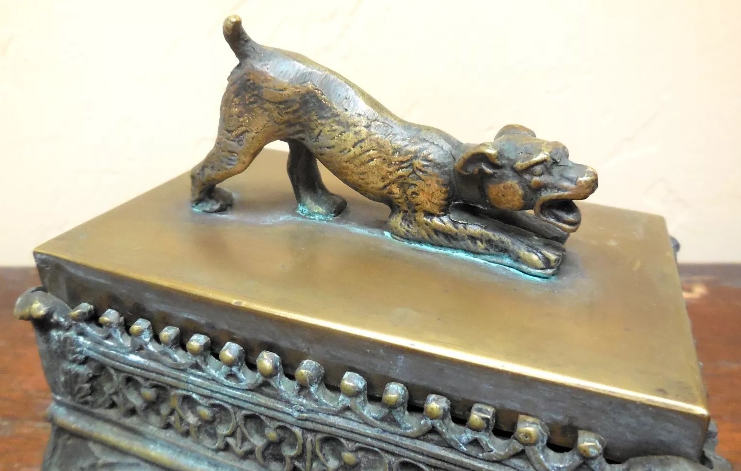 This bronze French inkstand features an ornate design with intricate floral and scrollwork patterns on the base. The highlight of the inkstand is the detailed sculpture of a dog on top, captured in a playful stance with its front legs bent and mouth open. The top lifts off to access an inkwell, sander and two pen holes.