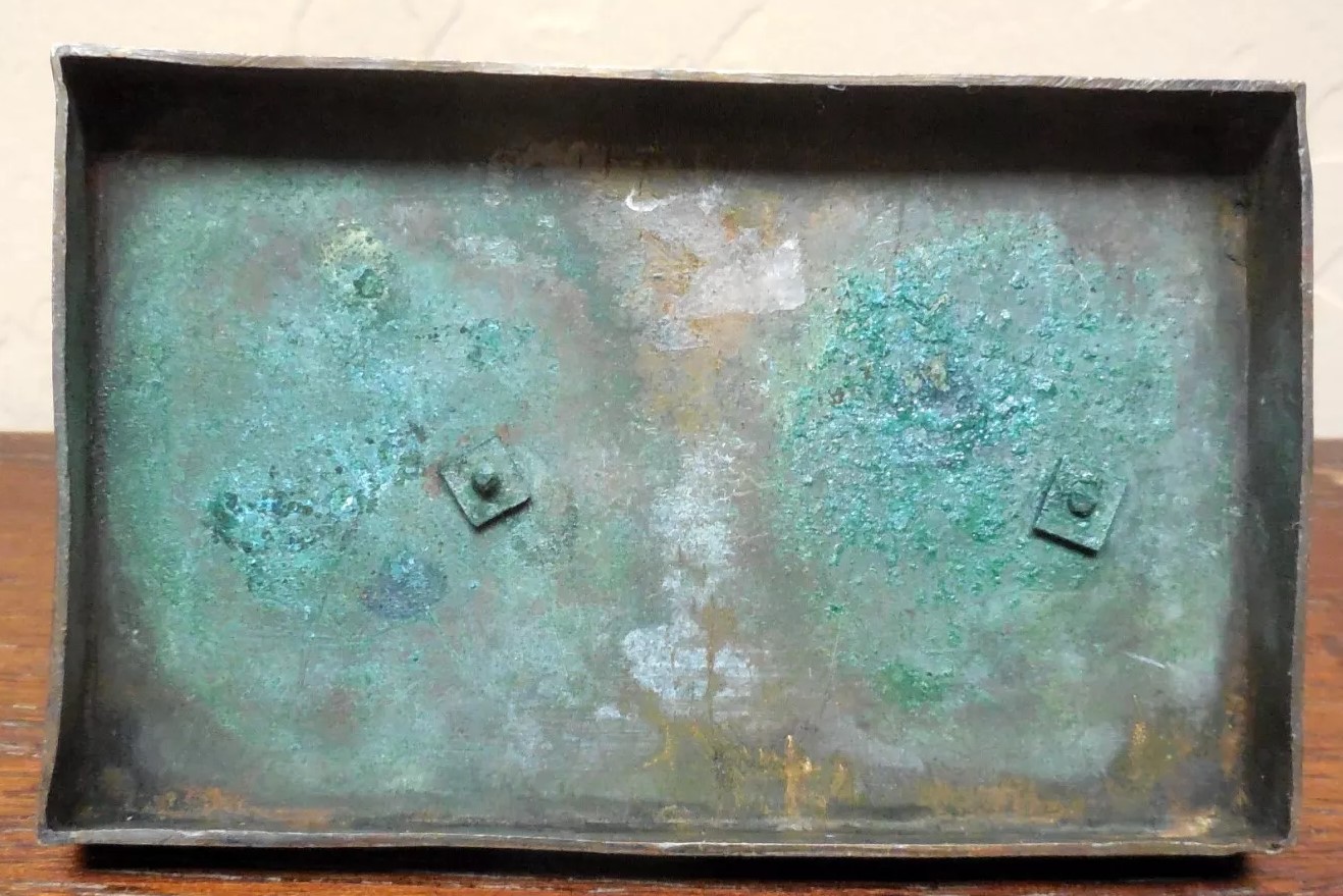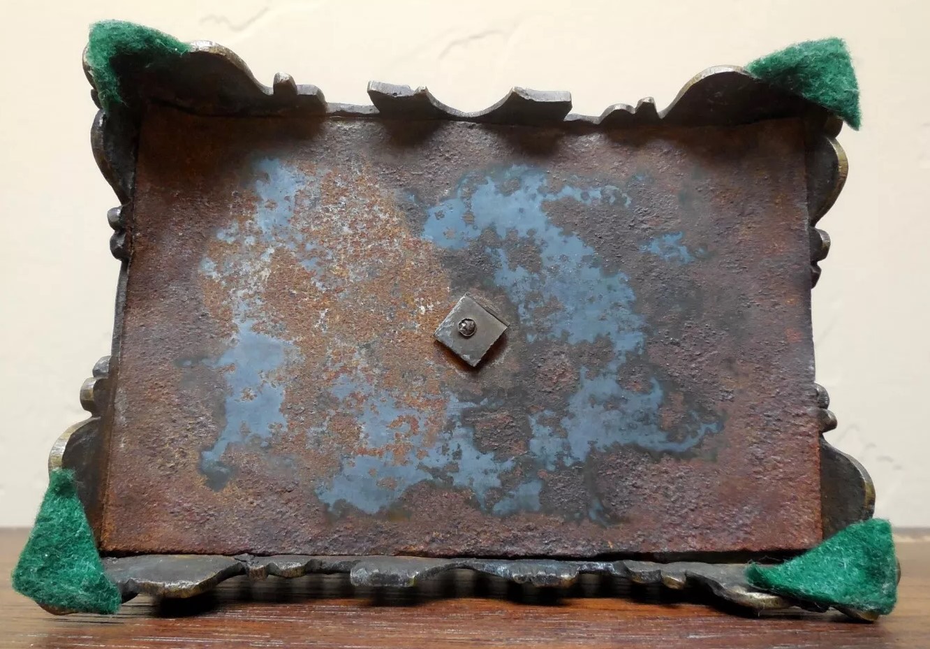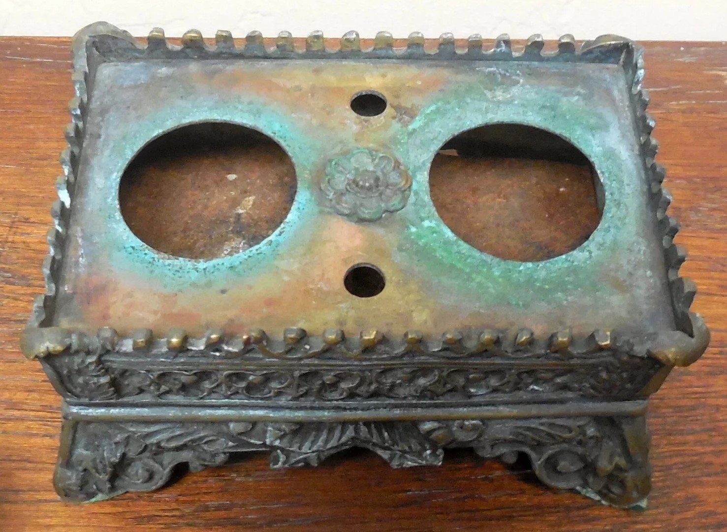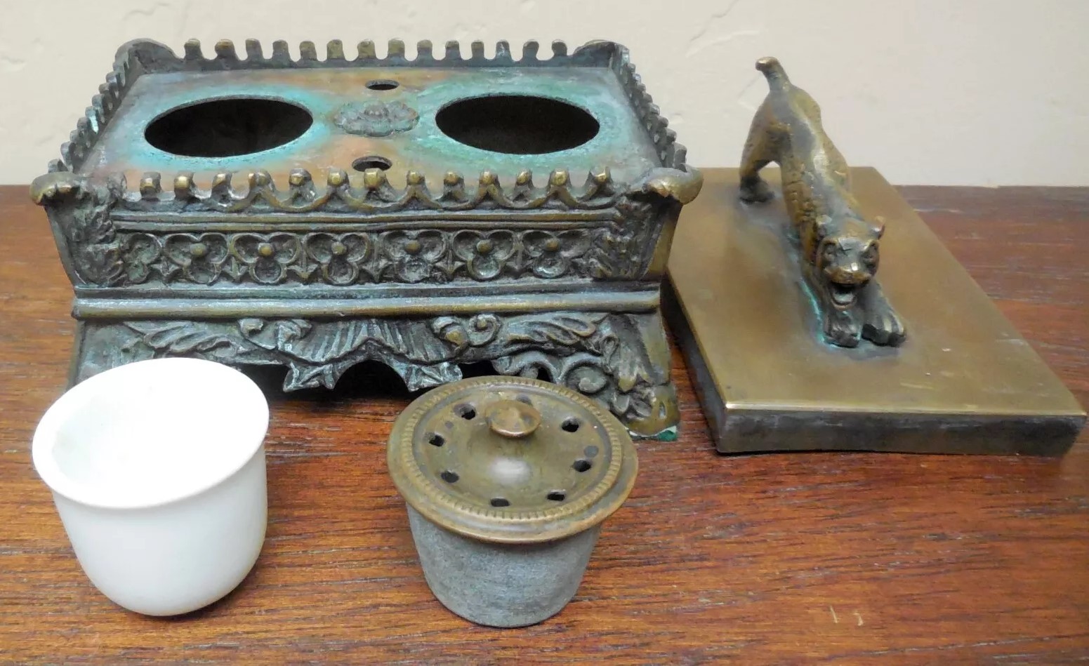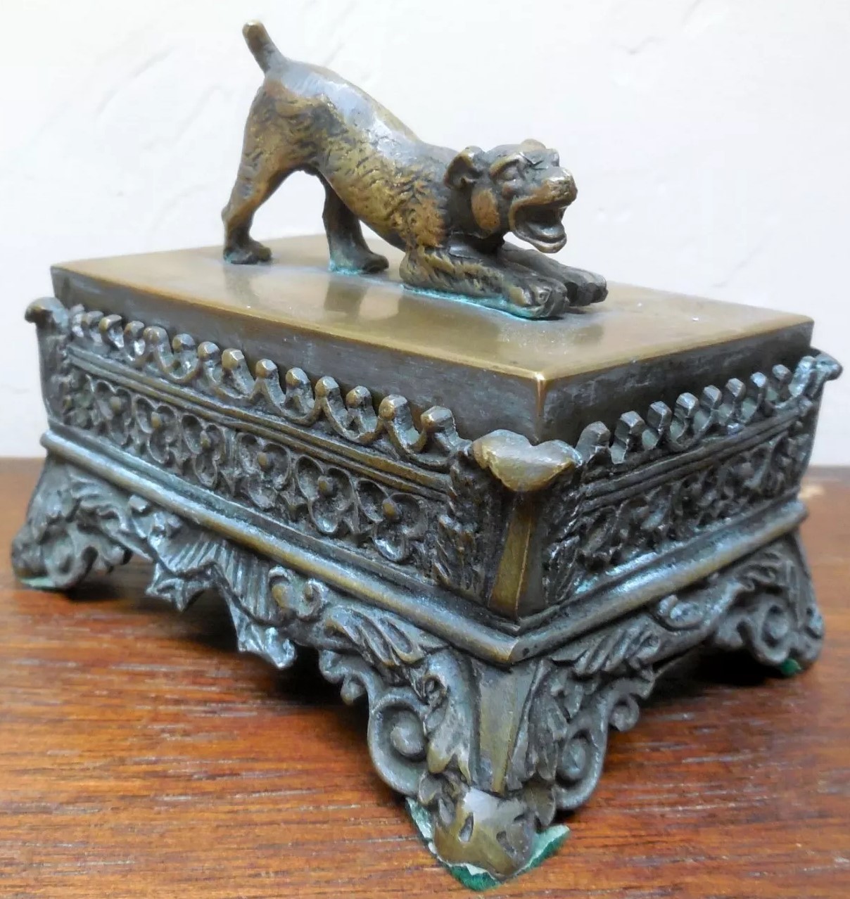 This bronze French inkstand features an ornate design with intricate floral and scrollwork patterns on the base. The highlight of the inkstand is the detailed sculpture of a dog on top, captured in a playful stance with its front legs bent and mouth open. The top lifts off to access an inkwell, sander and two pen holes.