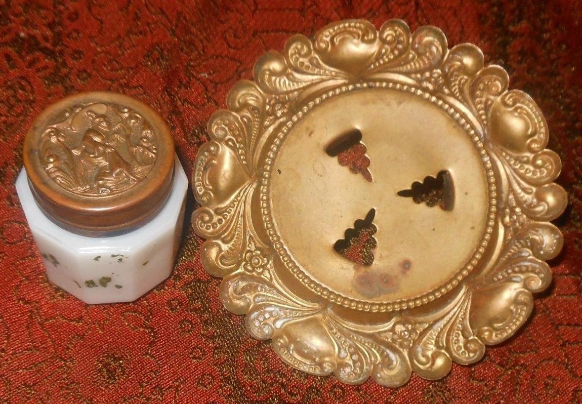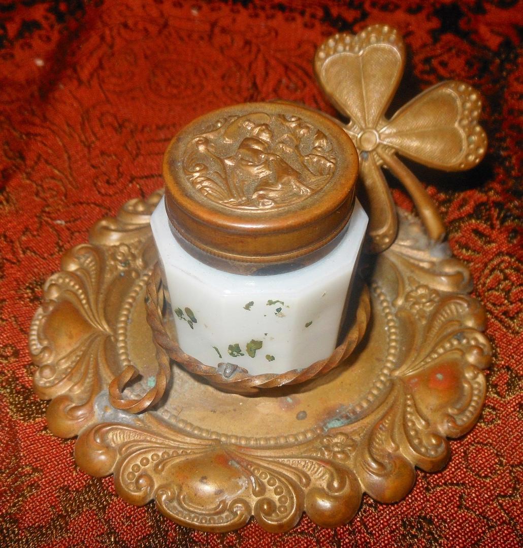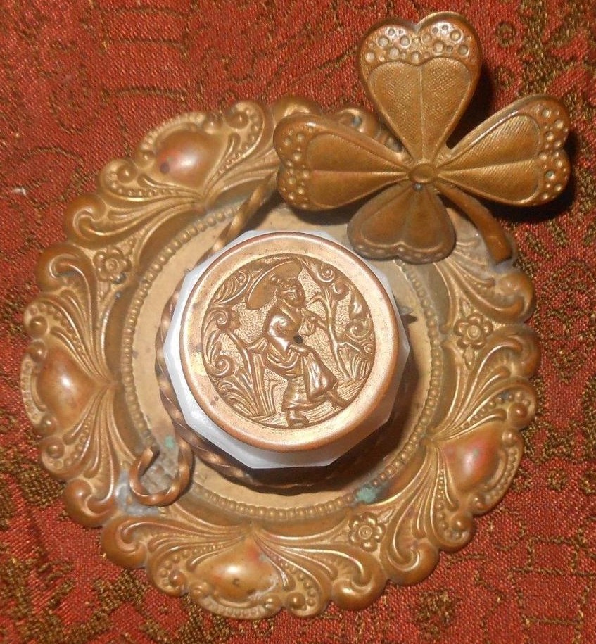This inkstand features a milk glass inkwell (probably once painted with green shamrocks) housed on a stamped metal base. Attached to the base is a shamrock. The shamrock is a well-known symbol in Irish culture, often associated with St. Patrick’s Day. It is a three-leaved clover, and legend has it that St. Patrick used it to explain the concept of the Holy Trinity (Father, Son, and Holy Spirit) to the Irish. The inkwell’s lid has the impression of an Oriental man holding an umbrella or parasol.