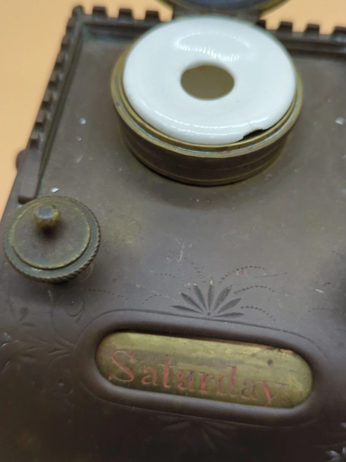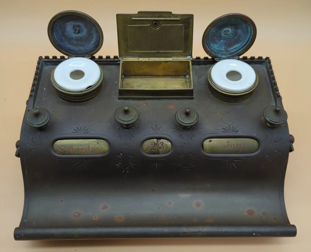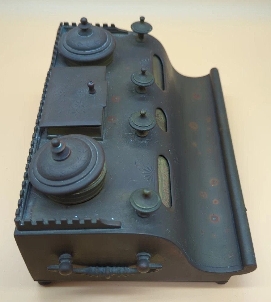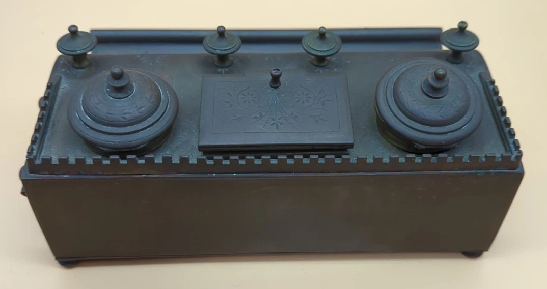 - Central Compartment: In the middle of the top platform, between the two inkwells, is a rectangular compartment with a hinged lid. This lid, when open, reveals a shallow interior with a strike plate on the underside of the lid. This suggests this compartment was designed to hold matches, making it a combined inkstand and match safe/striker.
