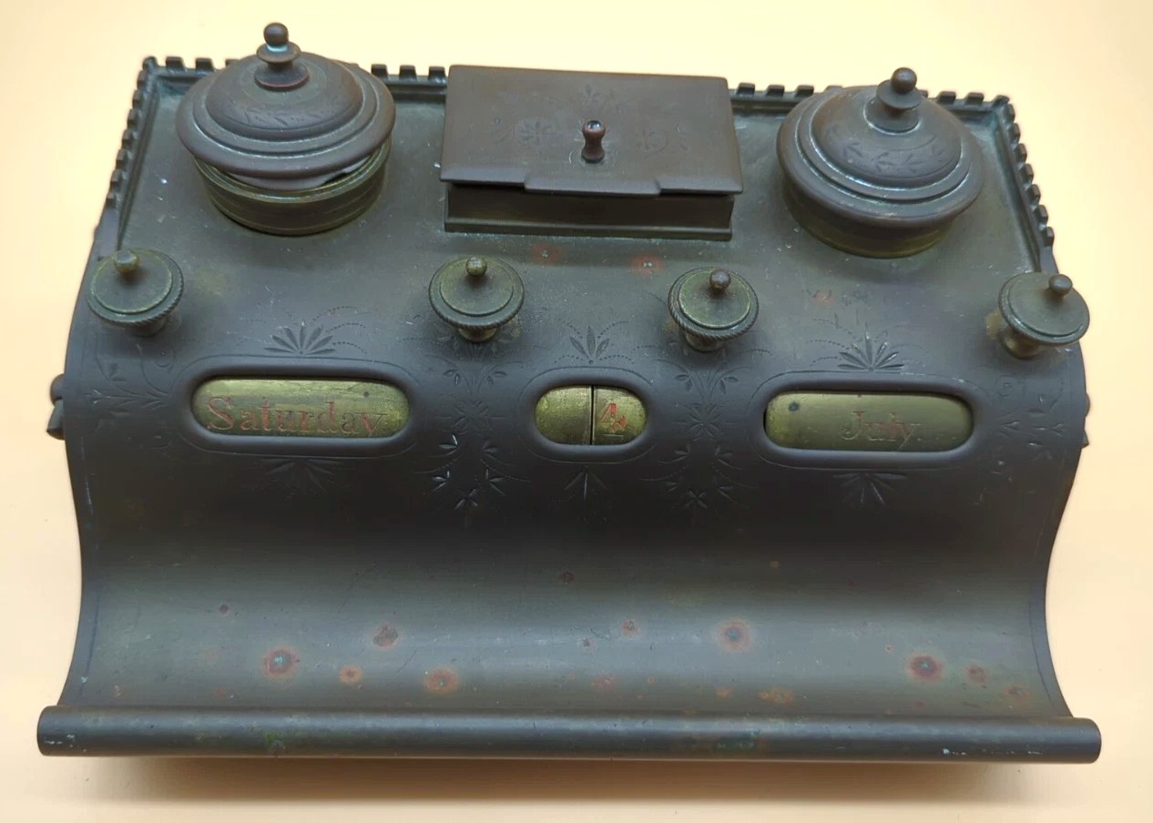 - Inkwells: On the top platform, there are two circular inkwells positioned on the left and right sides, each covered by hinged, circular metal lids.