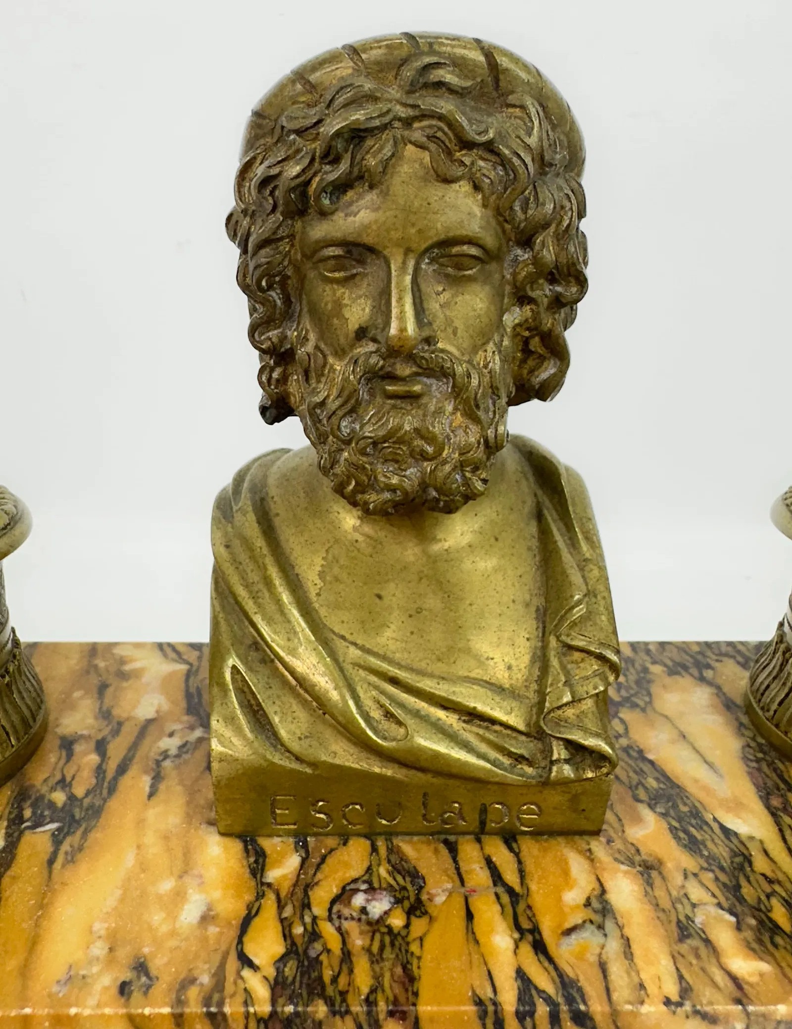At the center of the base, a bronze bust of Asclepius (also known by his Roman name, Aesculapius) stands on a stepped marble plinth. The bust is finely cast and gilded, depicting the figure with a beard and a calm, scholarly expression. Flanking the central bust are two circular bronze inkwell holders with hinged lids housing glass inkwells. The inkwells feature intricate, relief-cast details of acanthus leaves.