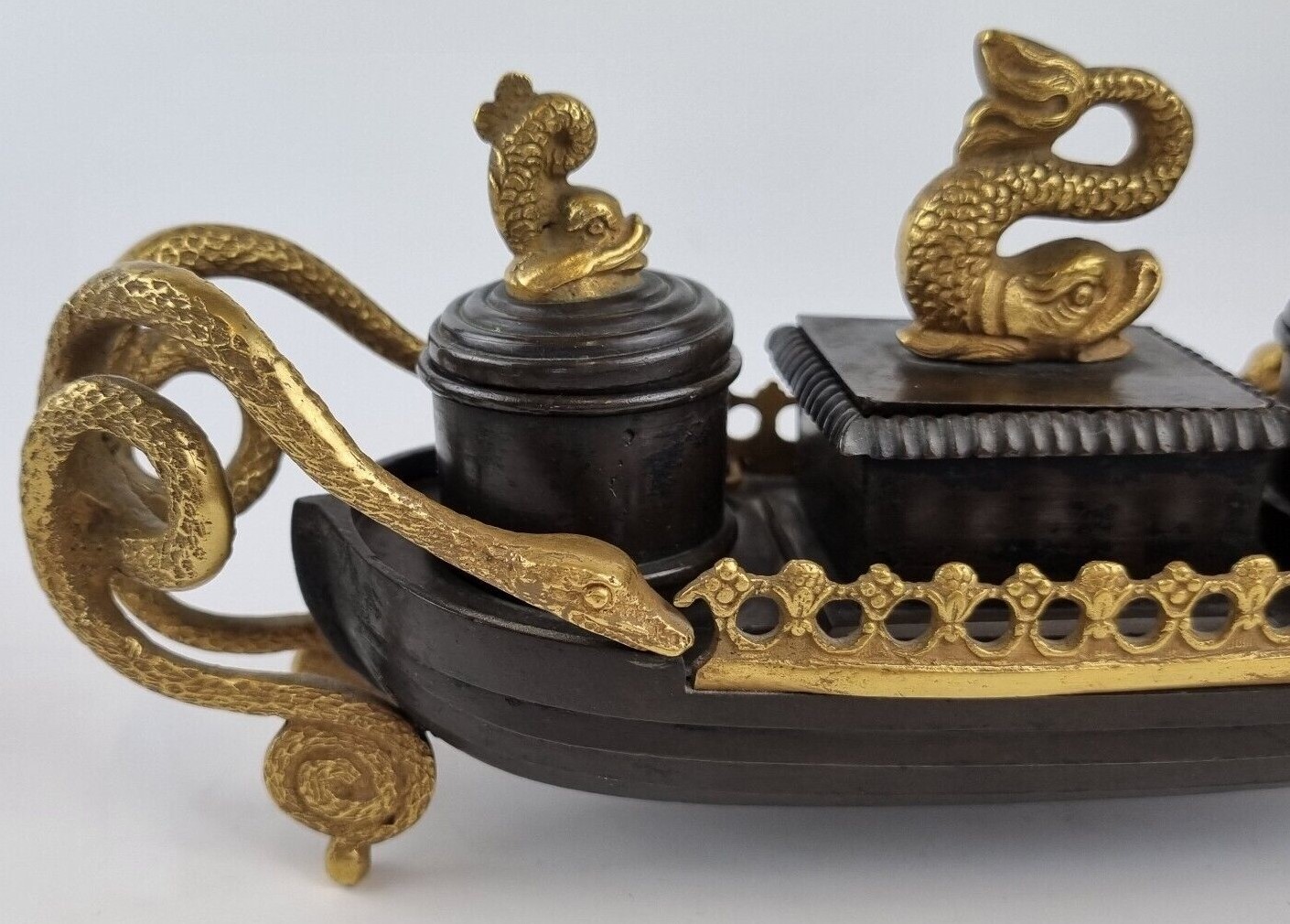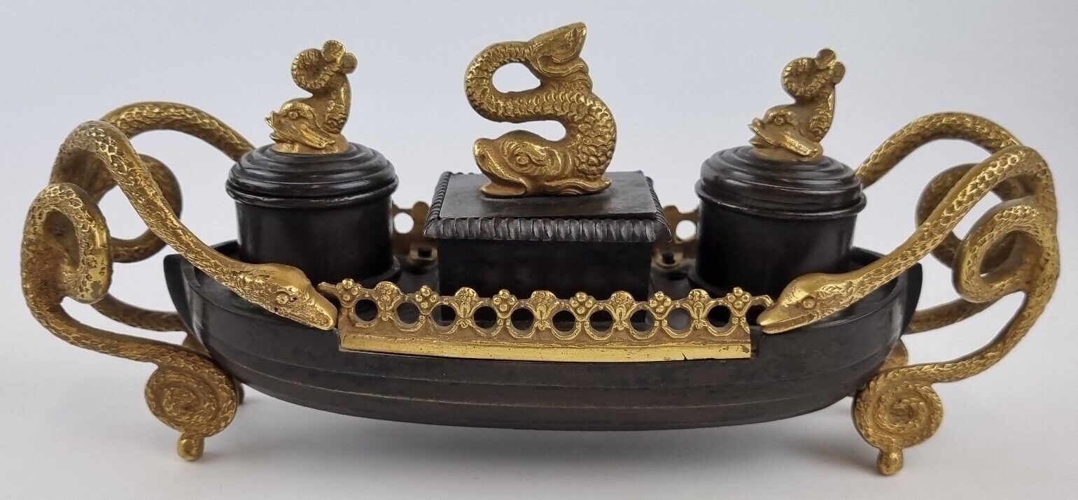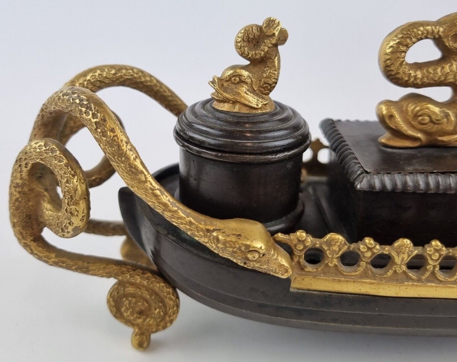 French 19th century double inkstand with a patinated bronze surface decorated with bronze Doré mounts including dolphin handles and intertwining serpents that form the handles and footing for the inkstand.