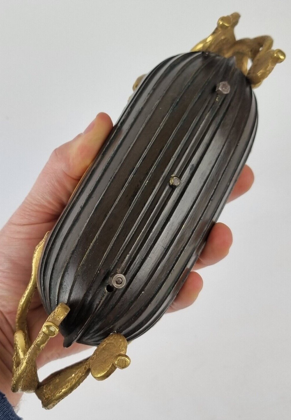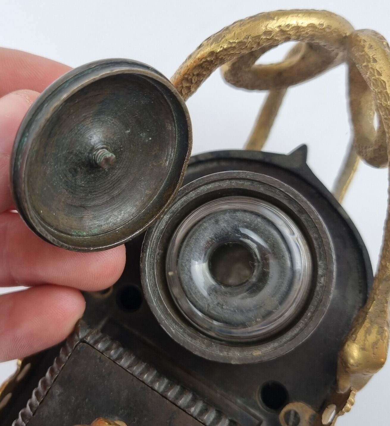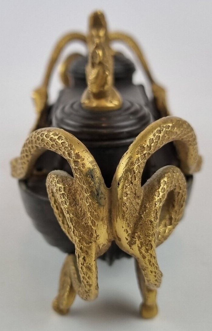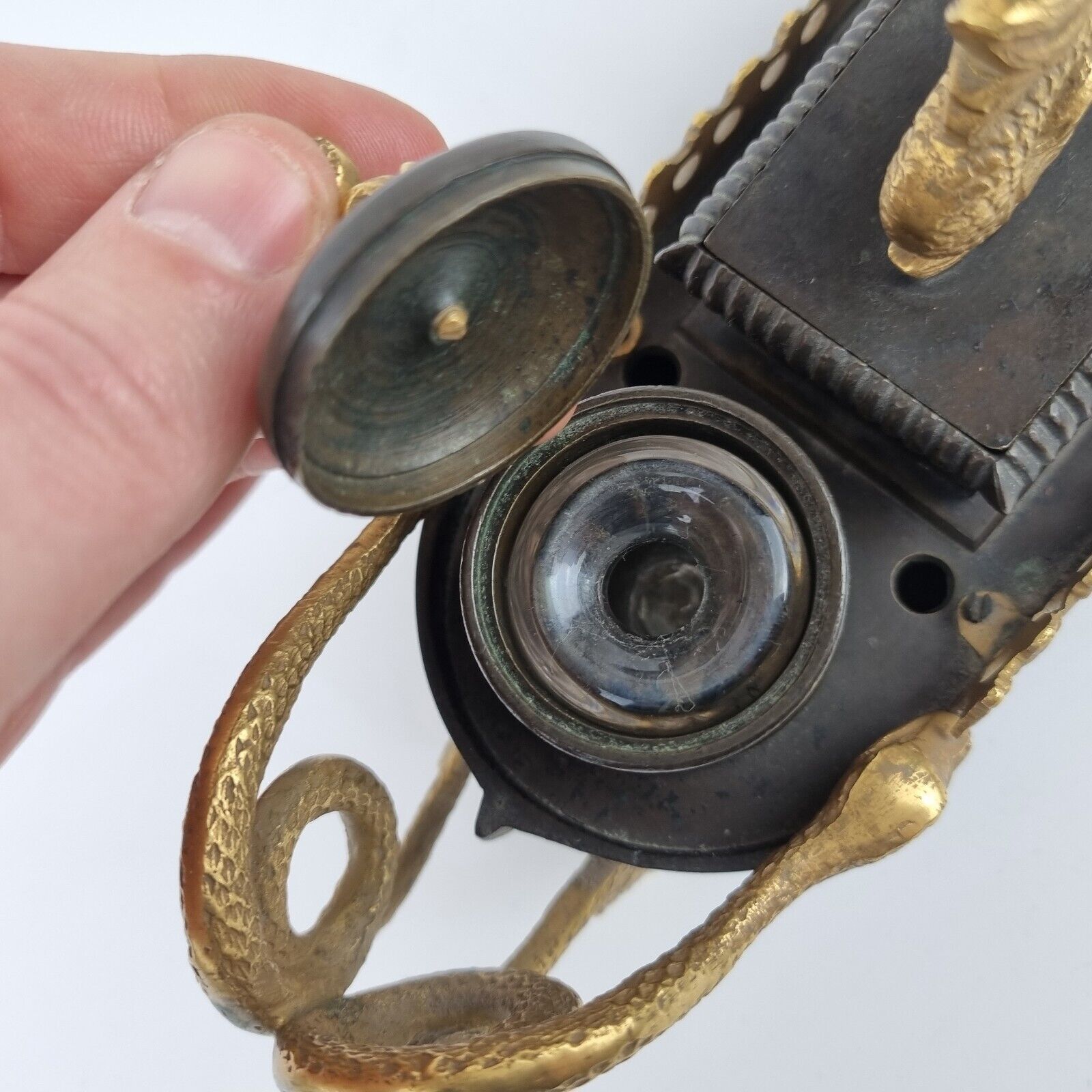 French 19th century double inkstand with a patinated bronze surface decorated with bronze Doré mounts including dolphin handles and intertwining serpents that form the handles and footing for the inkstand.