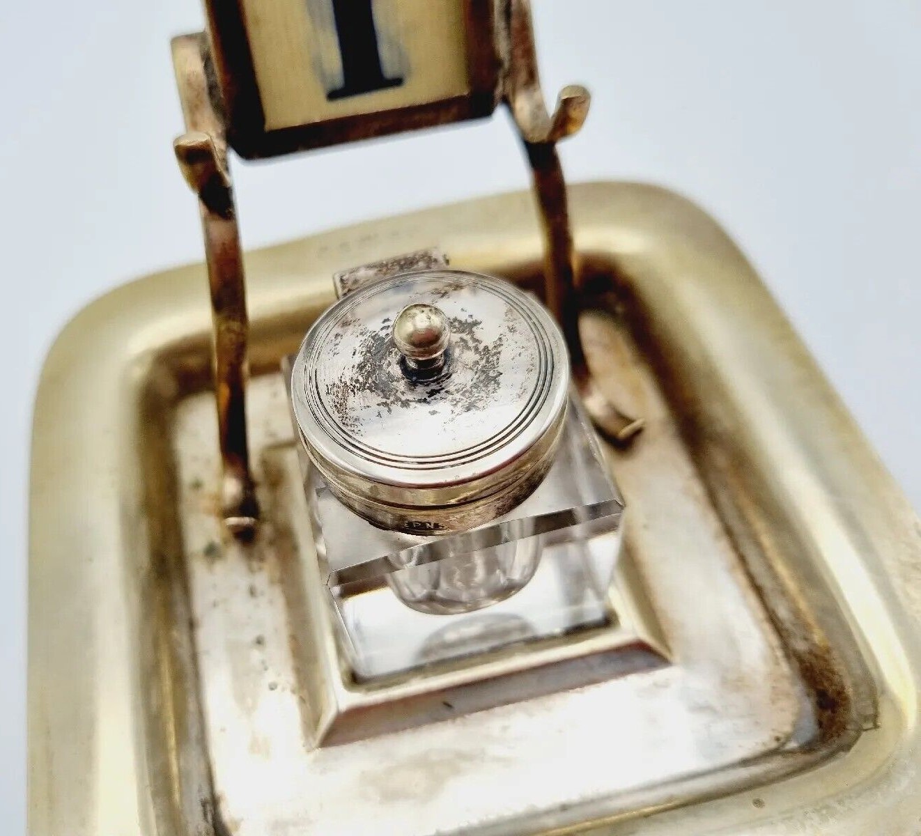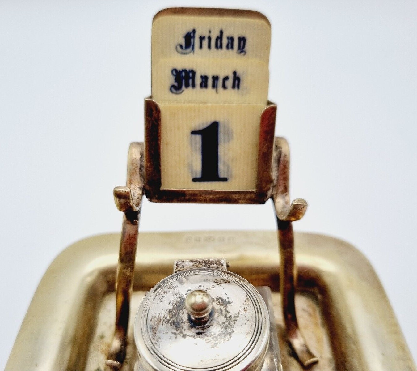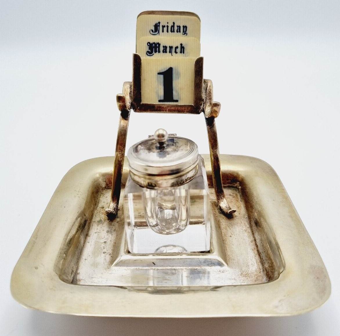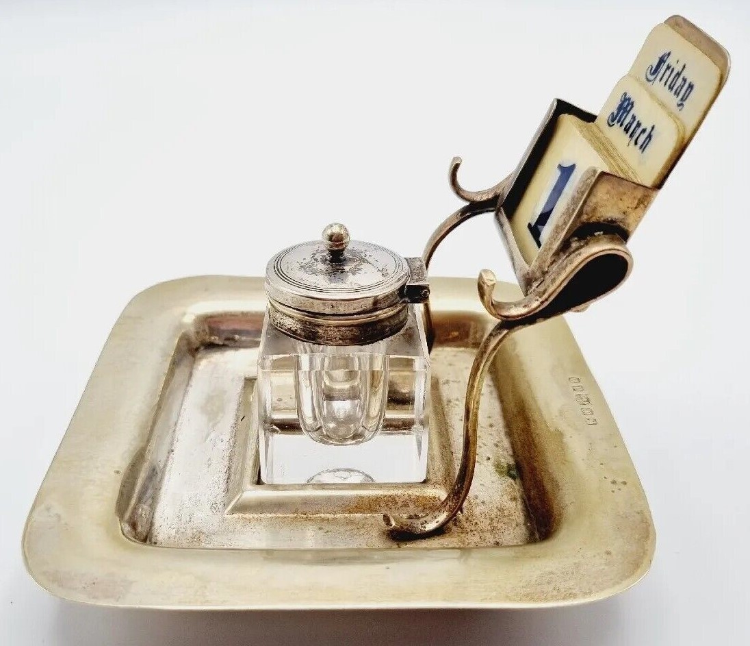 This inkstand made of electroplated nickel silver (EPNS) has a perpetual calendar above the glass inkwell with hinged lid. It was made by Davis & Sons of Glasgow.