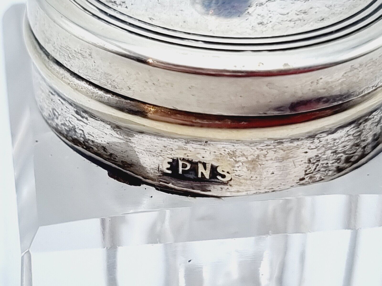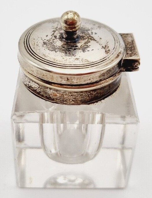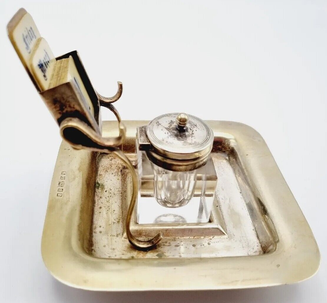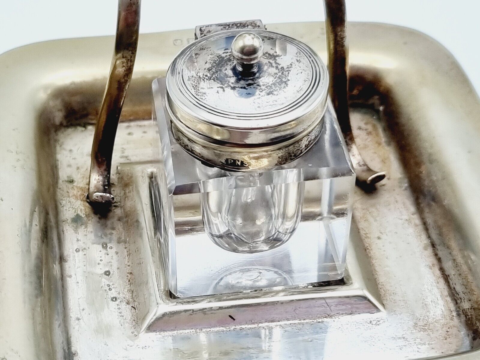 This inkstand made of electroplated nickel silver (EPNS) has a perpetual calendar above the glass inkwell with hinged lid. It was made by Davis & Sons of Glasgow.