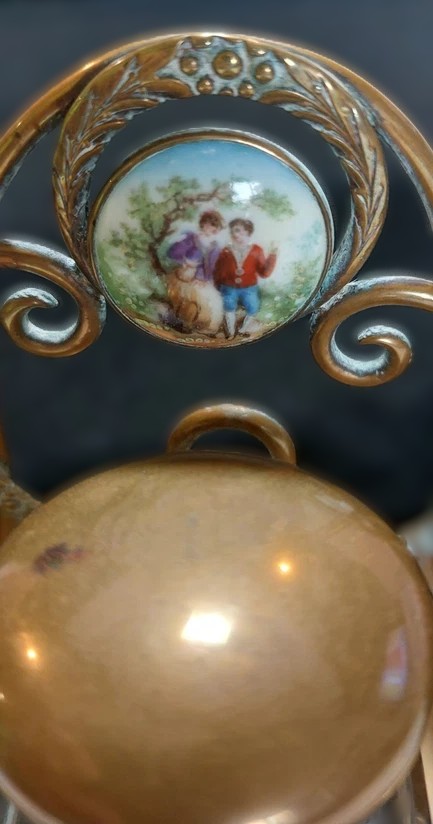 - The Porcelain Plaque: The most distinctive feature is the hand-painted porcelain miniature set into a circular brass frame above the inkwell. This plaque depicts a romantic scene of a couple in a garden setting, a popular motif in the “Romantic Era” style influenced by painters like Fragonard and Boucher.