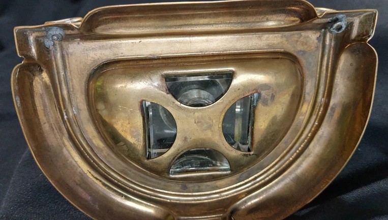 - The Inkwell: A central, square clear glass inkwell sits within the brass frame. It is topped with a heavy, hinged brass lid.