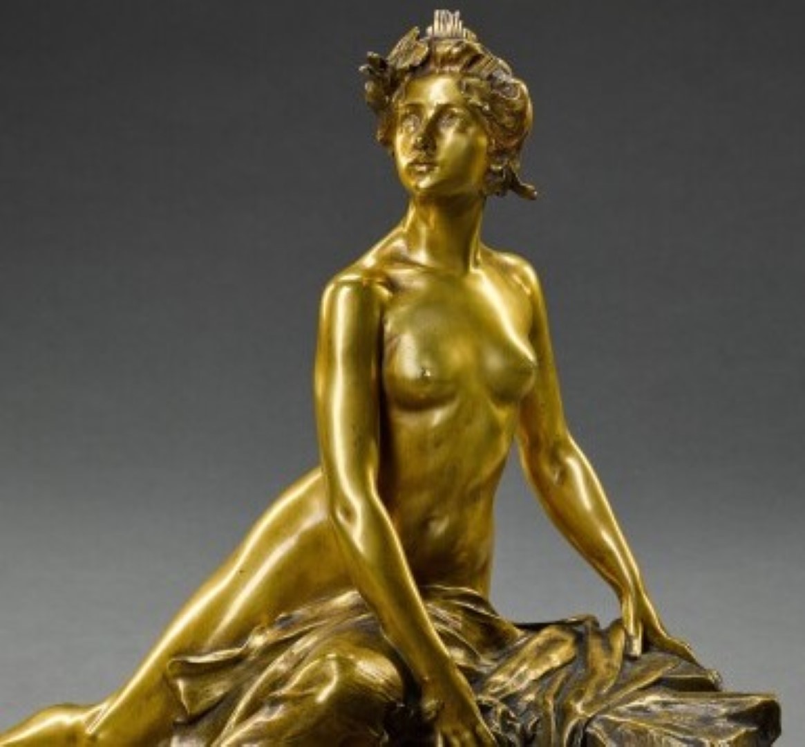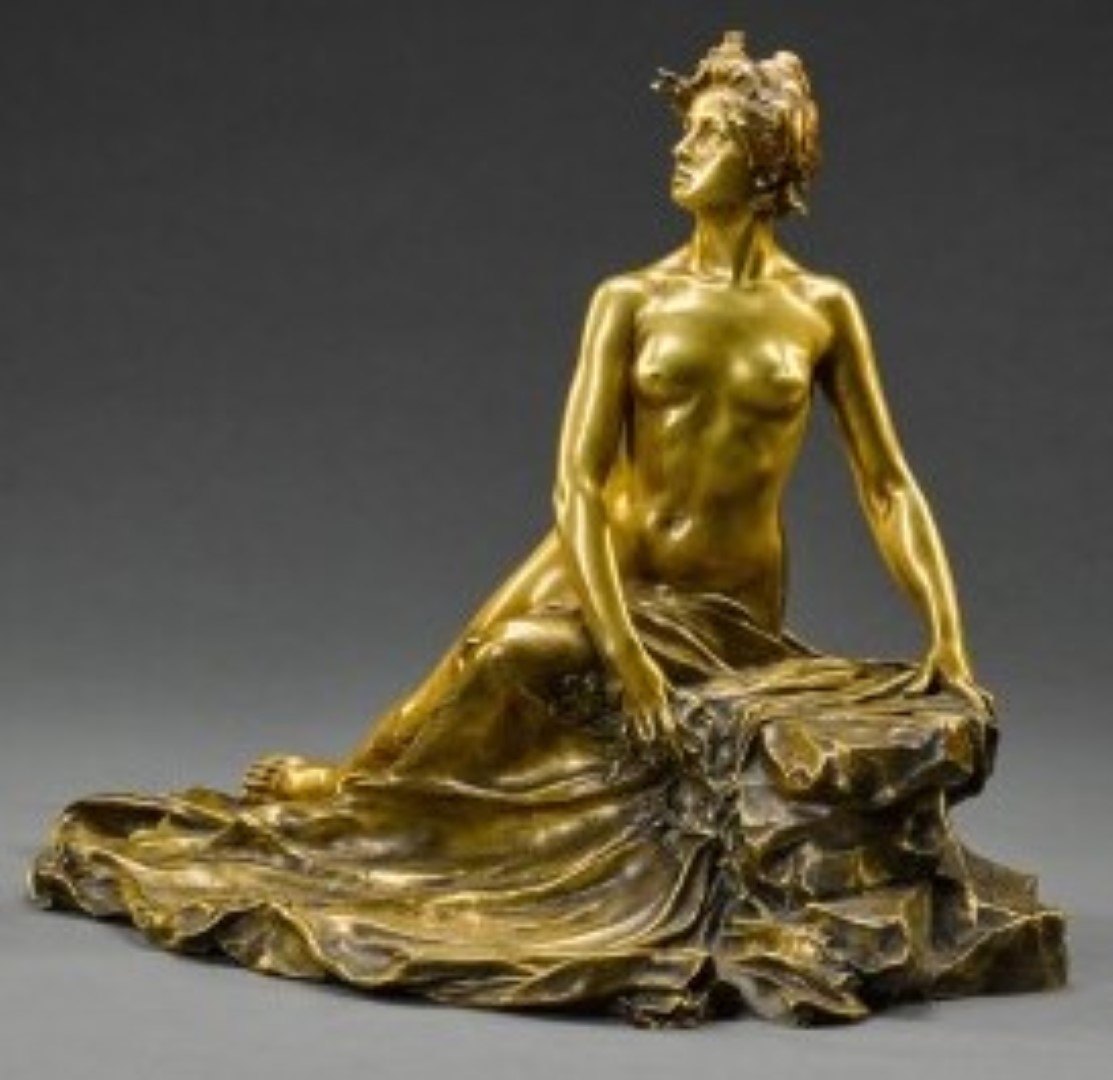 A French Art Nouveau gilt-bronze inkwell “L’idee, Allegrie sur un Rocher” (The Idea, Allegory upon a Rock)” by François-Raoul Larche decorated with a nude woman resting a top a rock gazing outward. The sculpture is signed, “Raoul Larche” and stamped with foundry mark “Siot Paris”.