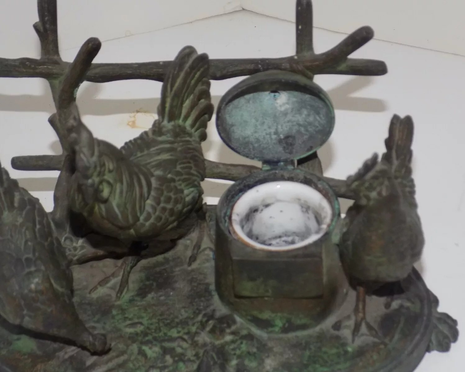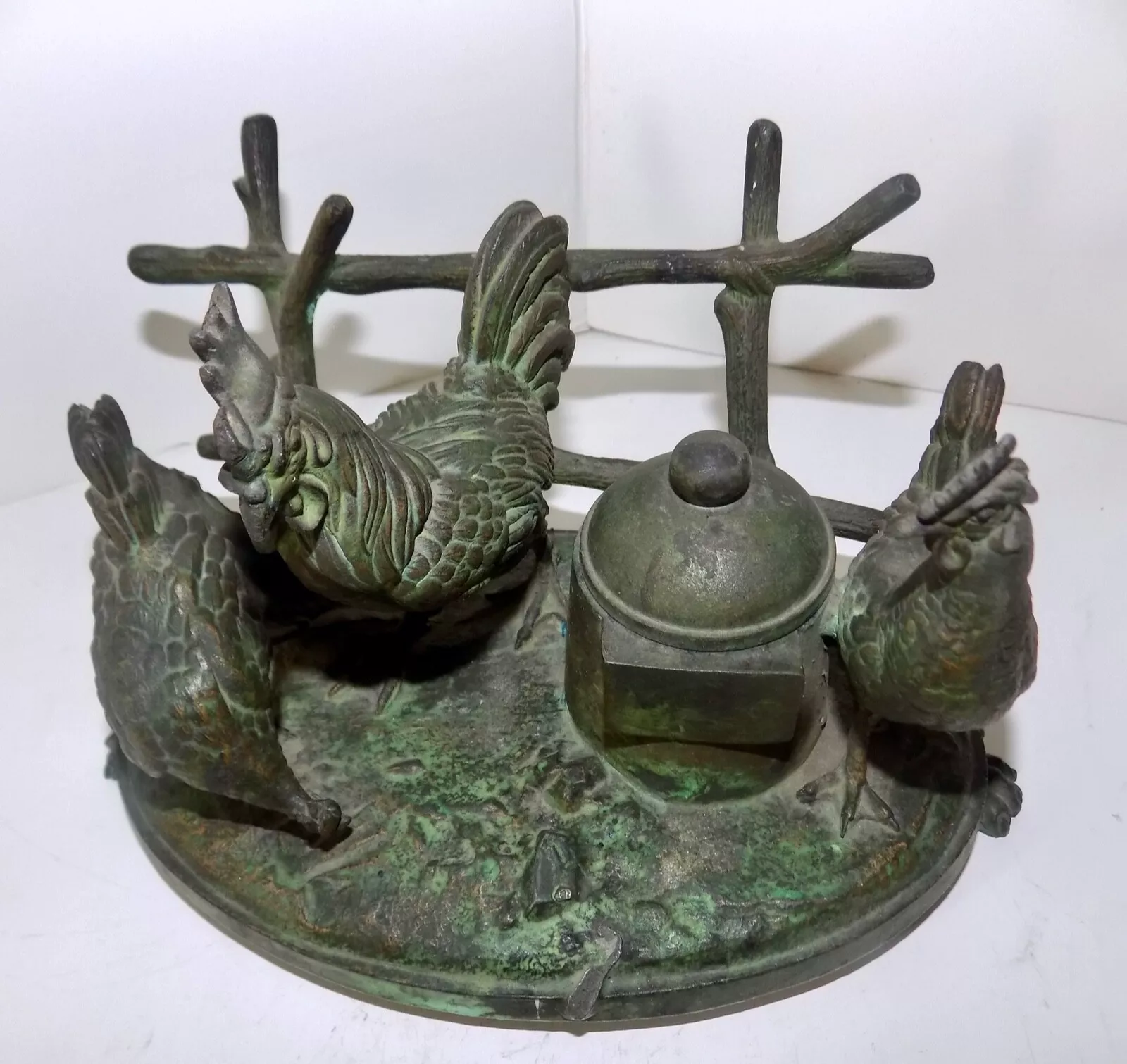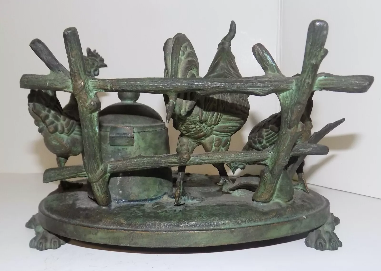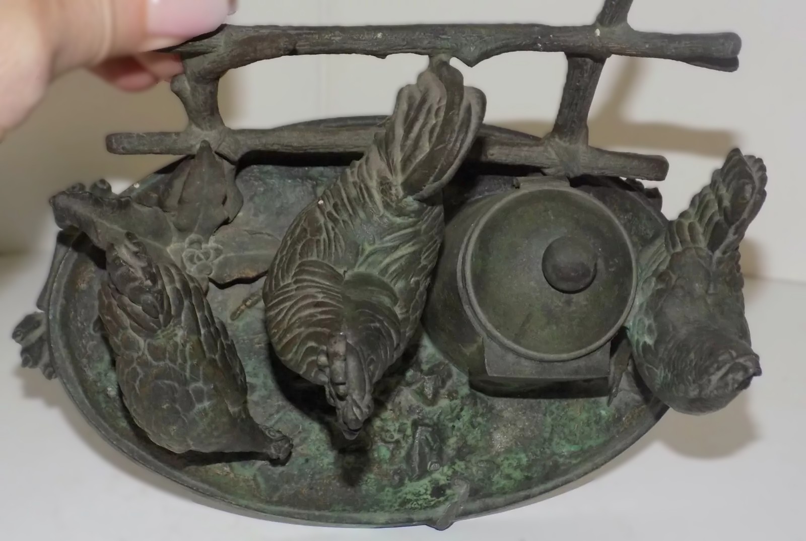 This metal inkstand depicts a rooster and two hens amidst a rustic setting. The central container with a hinged, domed lid holds the inkwell. The fence-like structure in the background serves as a pen holder. The underside is impressed with an unidentified maker’s mark: GRD.
