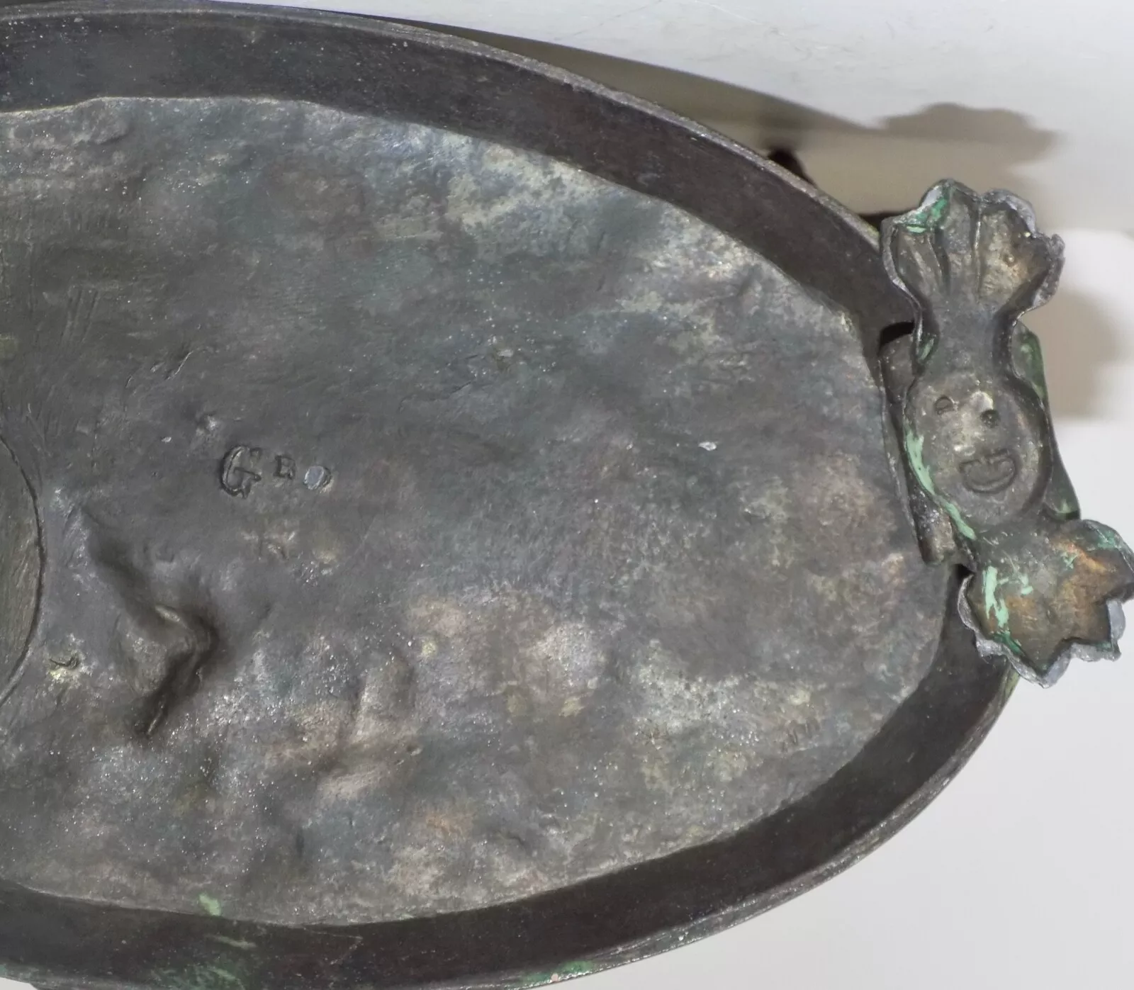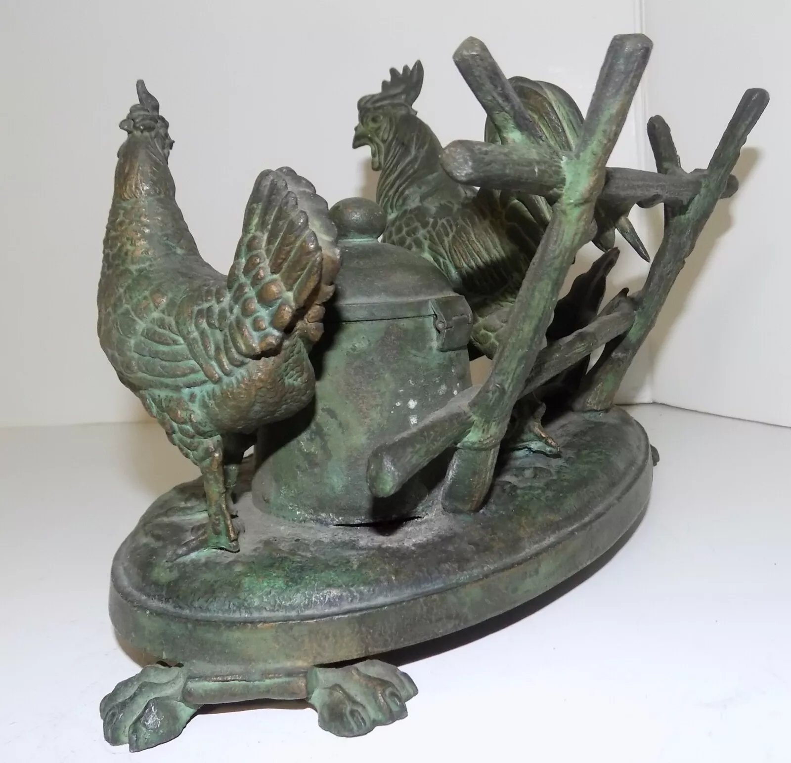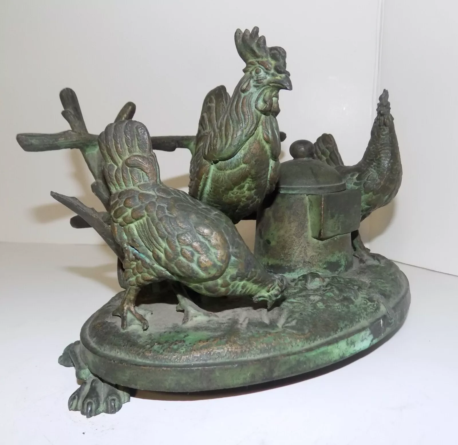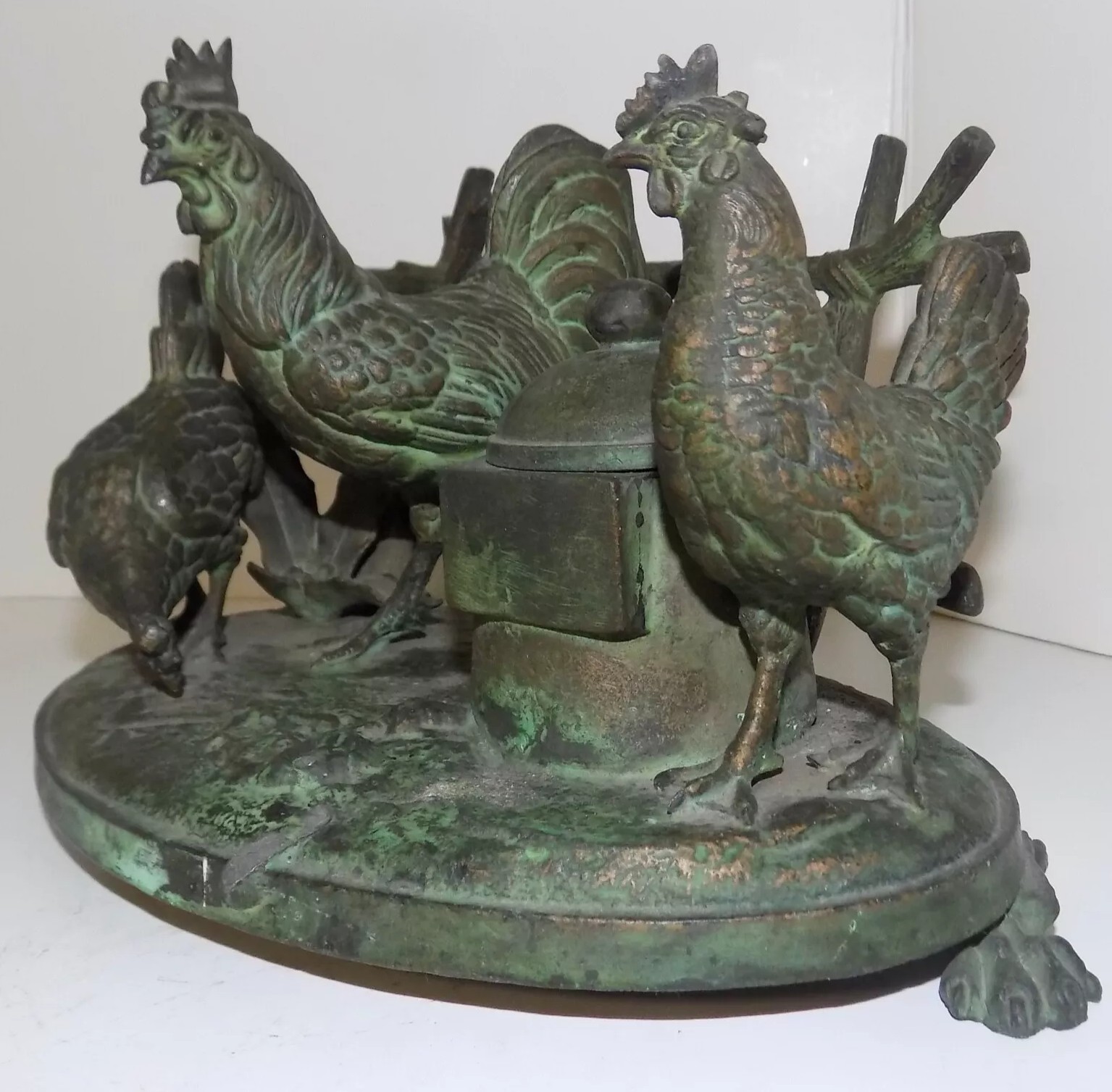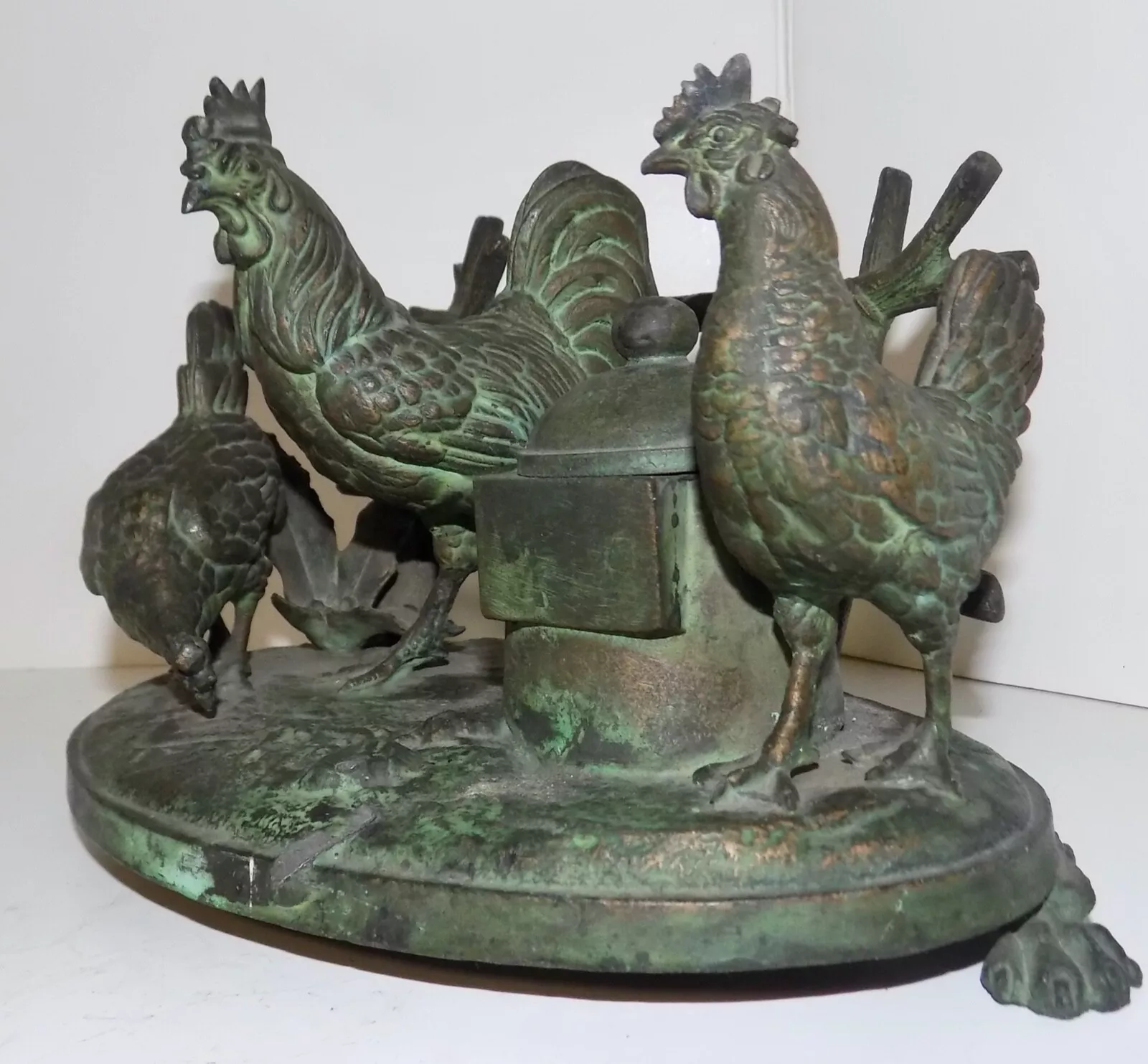This metal inkstand depicts a rooster and two hens amidst a rustic setting. The central container with a hinged, domed lid holds the inkwell. The fence-like structure in the background serves as a pen holder. The underside is impressed with an unidentified maker’s mark: GRD.
