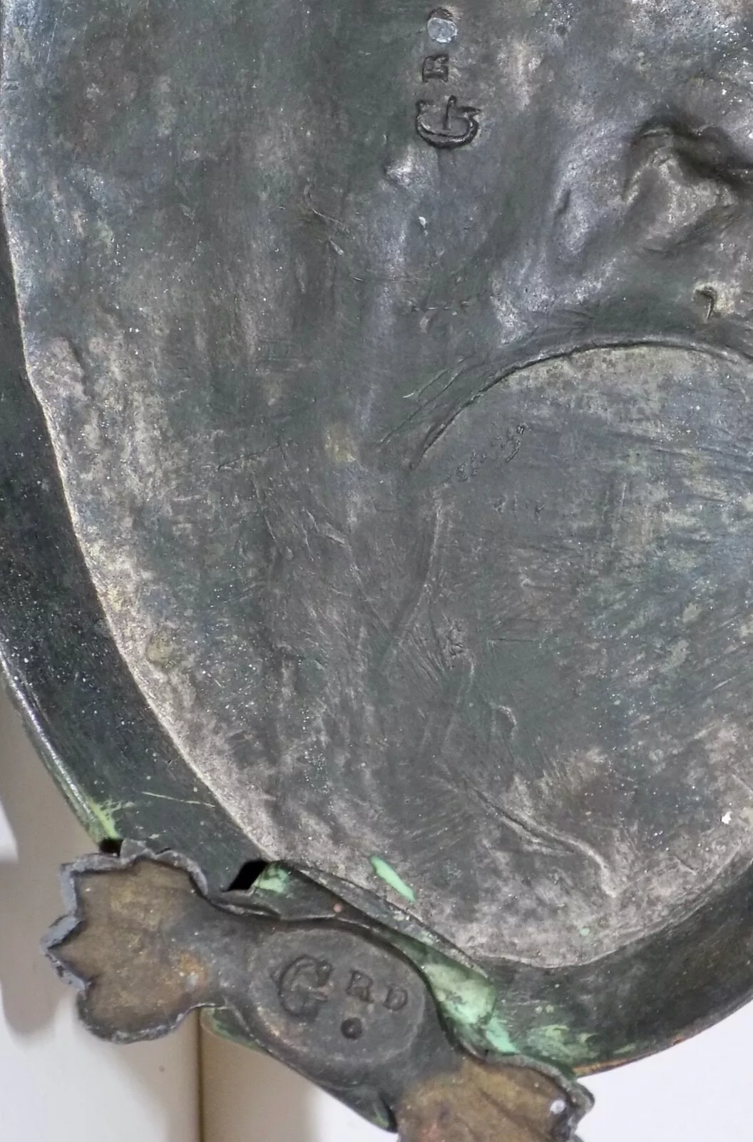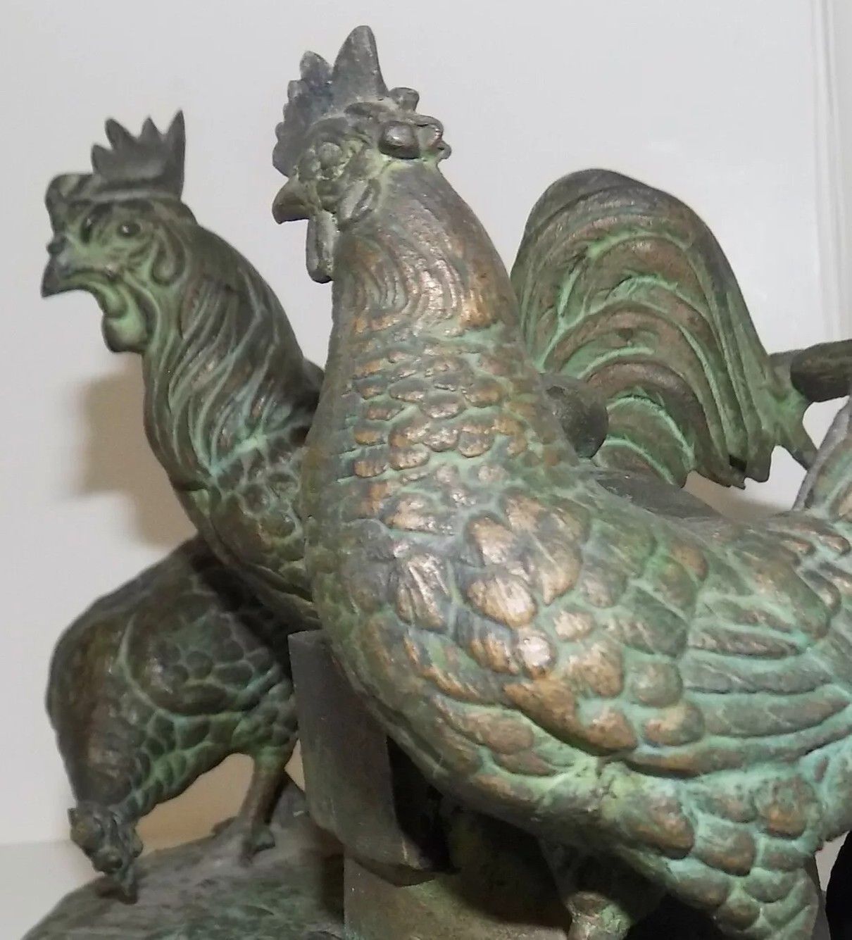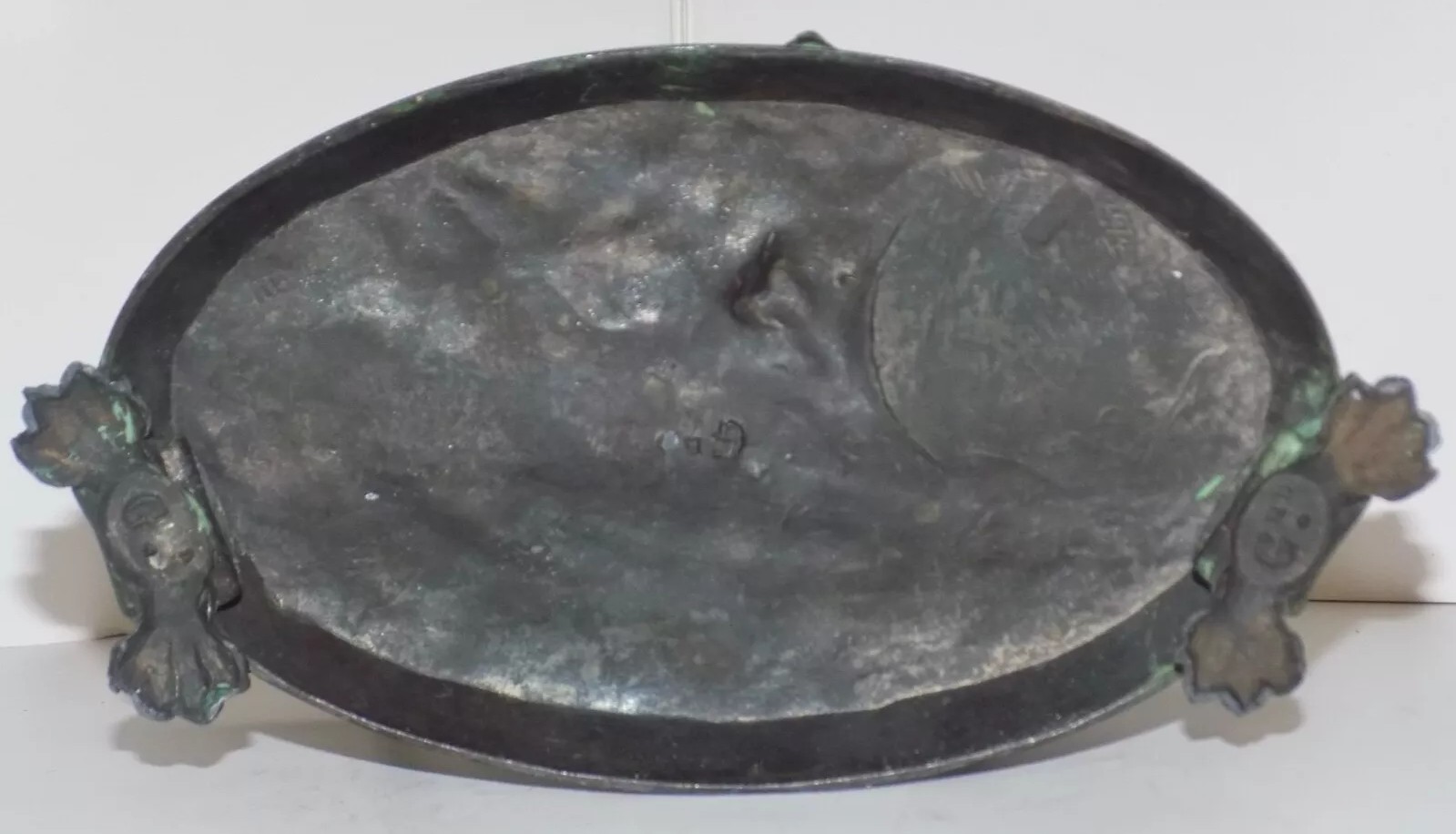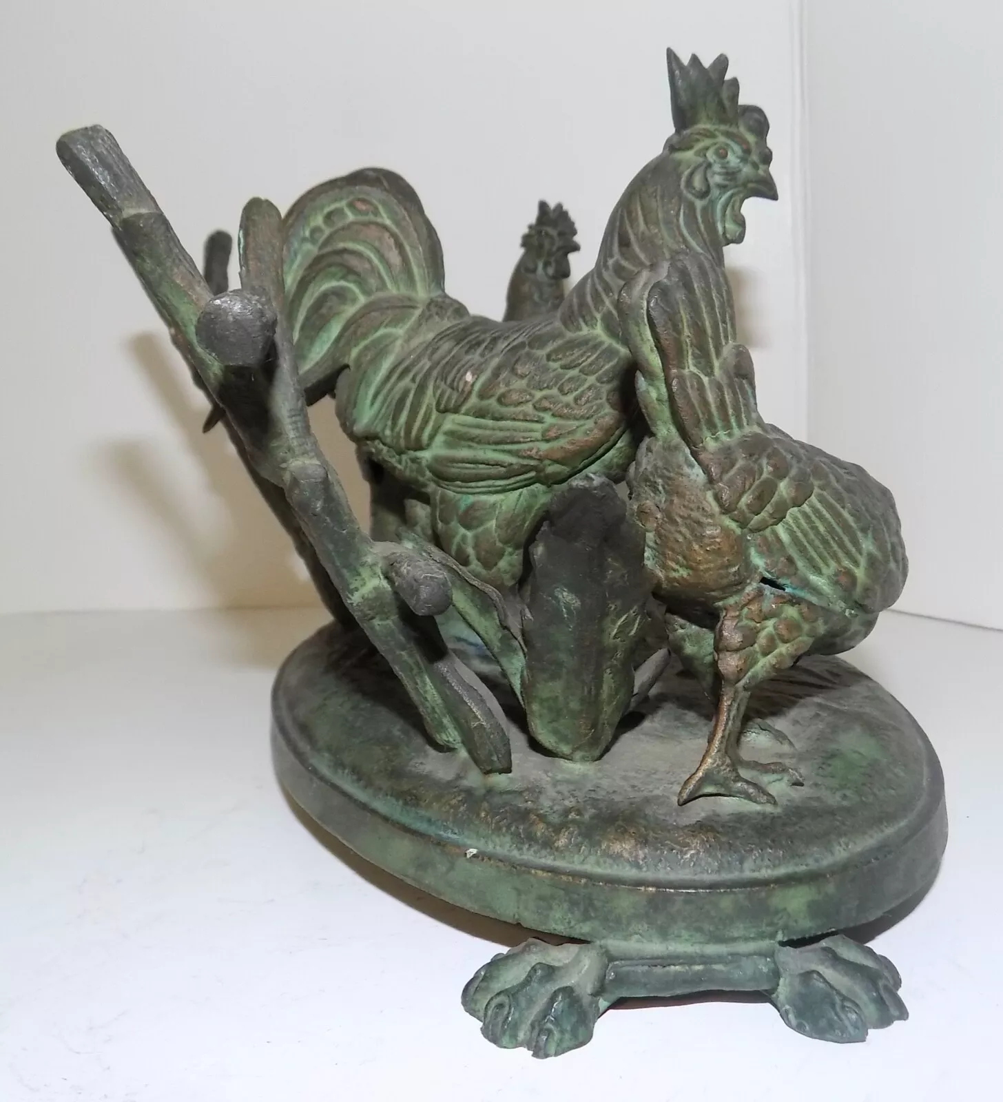 This metal inkstand depicts a rooster and two hens amidst a rustic setting. The central container with a hinged, domed lid holds the inkwell. The fence-like structure in the background serves as a pen holder. The underside is impressed with an unidentified maker’s mark: GRD.