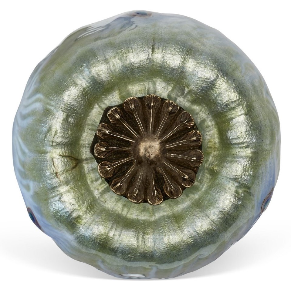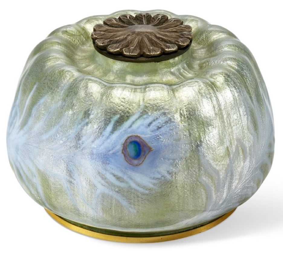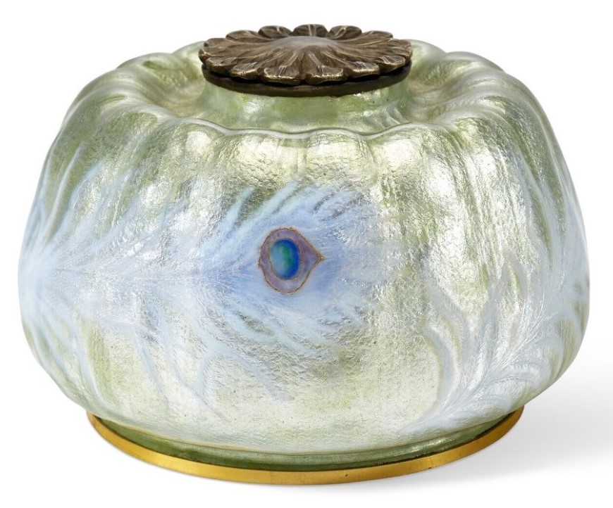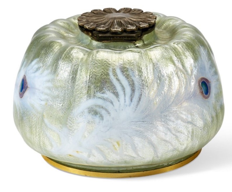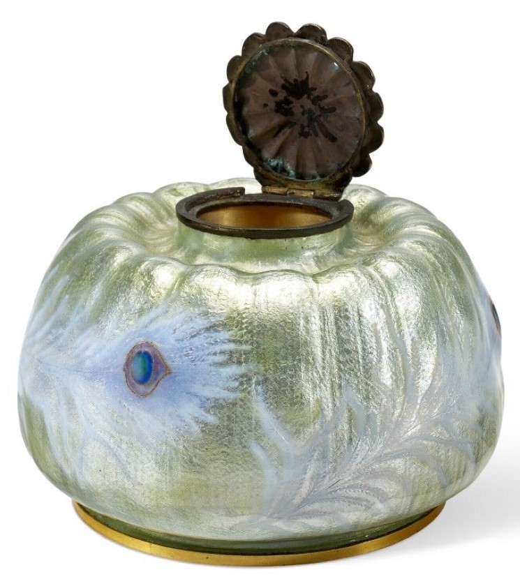 The year 1900 brought him a gold medal at the Paris World Exhibition. This inkwell is one of his earliest and most accomplished works. Other examples of this inkwell can be found in European museums such as the Musée de l’horlogerie et de l’émaillerie, Musées d’Art et d’Histoire de la Ville in Geneva, Musée des Arts décoratifs in Paris, Hessisches Landesmuseum in Darmstadt, the Museum für Kunst und Gewerbe in Hamburg, and the Kunstgewerbemuseum in Budapest.