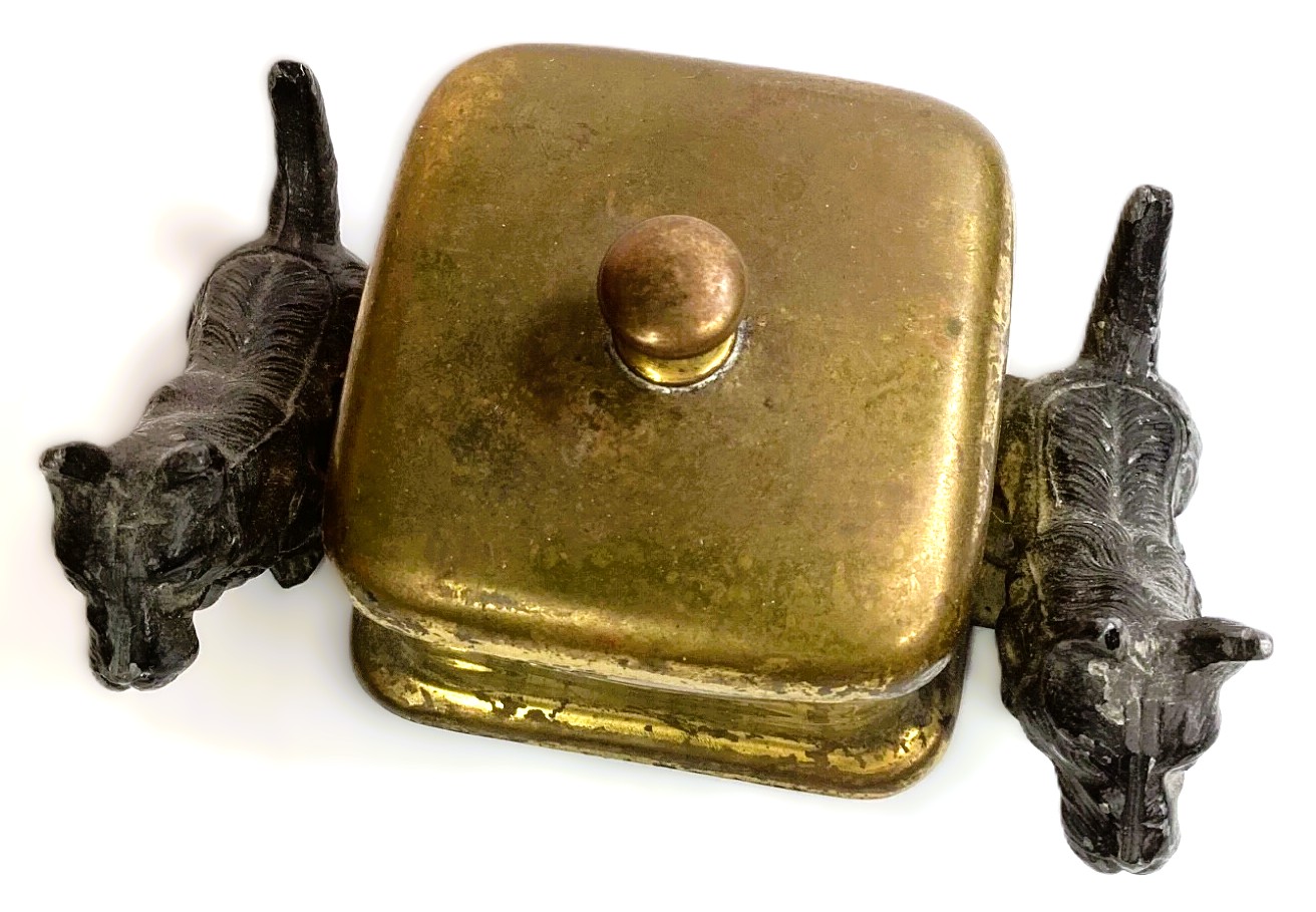 - Material: While it has the appearance of brass, this piece was made from spelter metal and then plated in brass. The wear on the high points of the container suggests a heavy brass plating over a denser base metal.