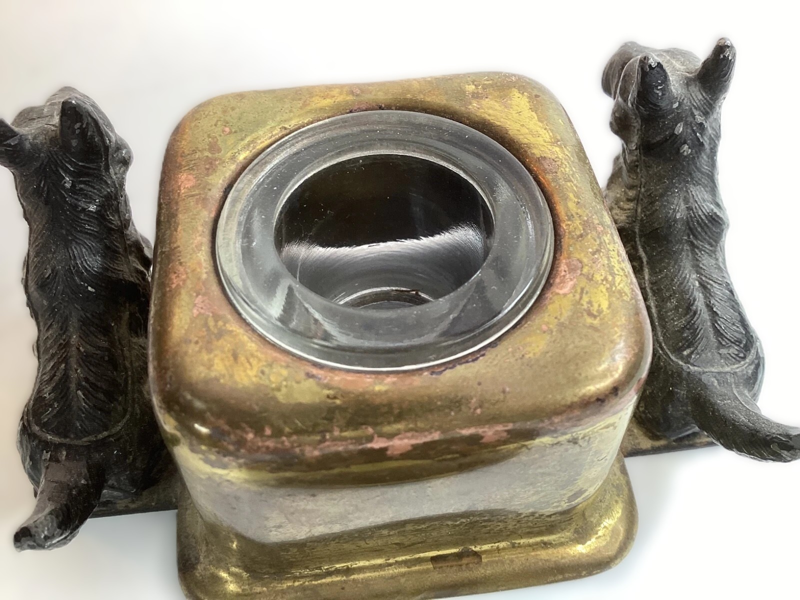 - The Dogs: The Scotties are detailed, capturing the breed’s characteristic wiry coat, upright ears, and sturdy posture. They have a darker black finish, which provides a contrast against the warm, aged brass tone of the central well.