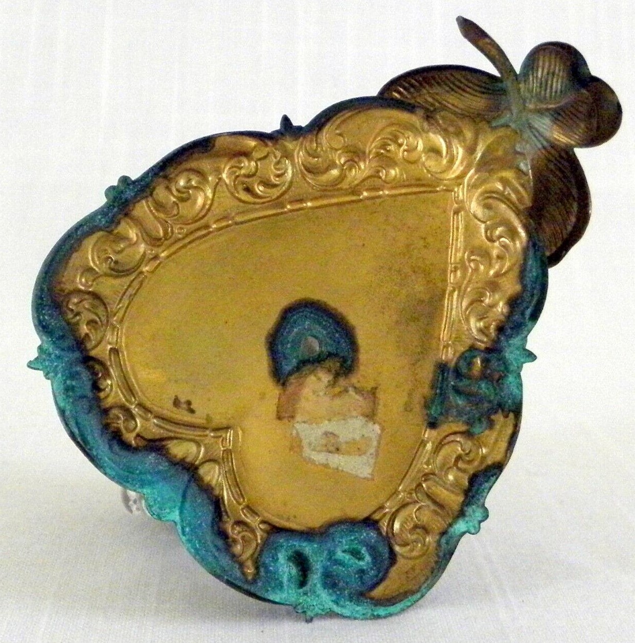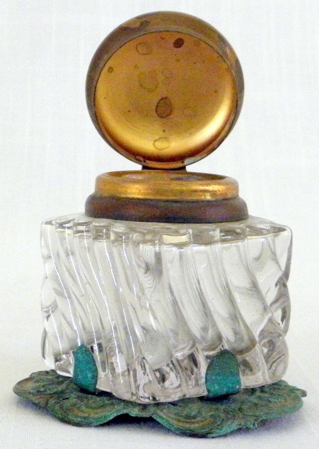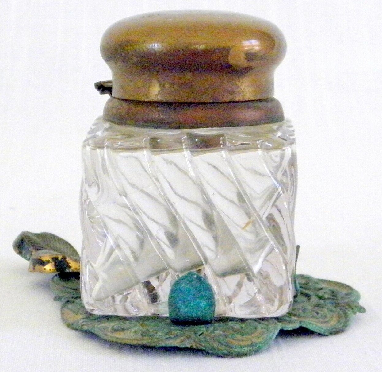 Pressed swirl glass inkwell with domed brass lid fits into a pressed metal base featuring a Shamrock decoration.