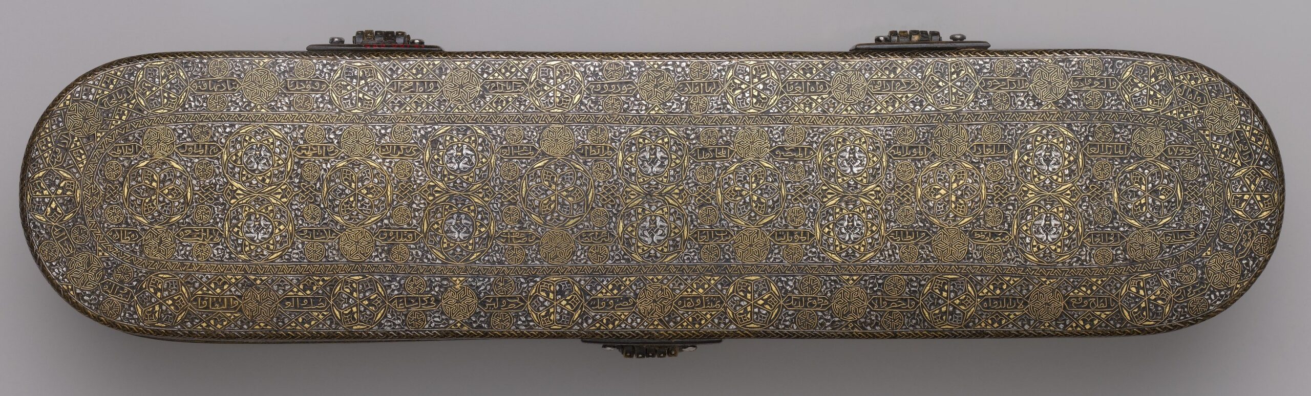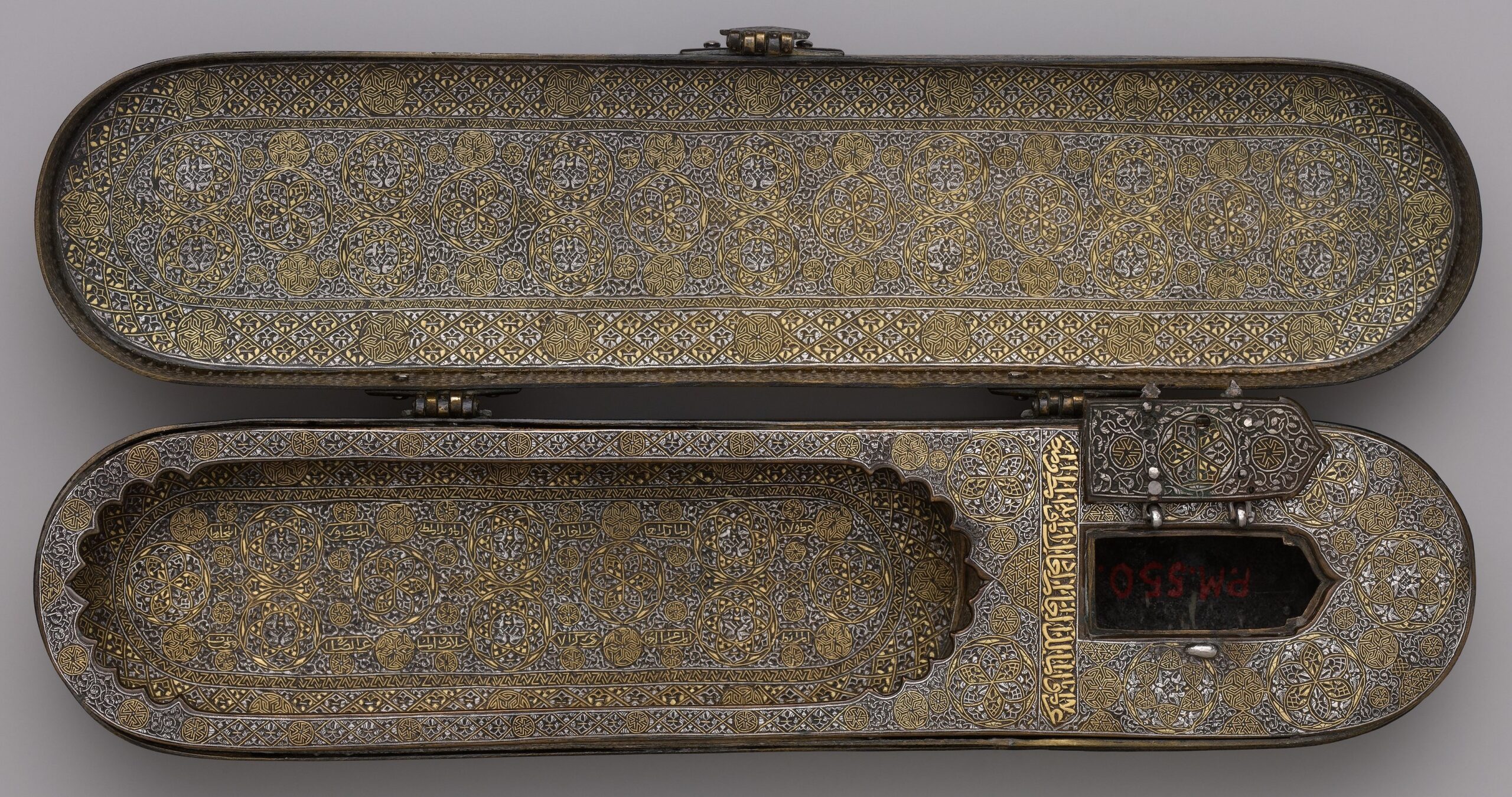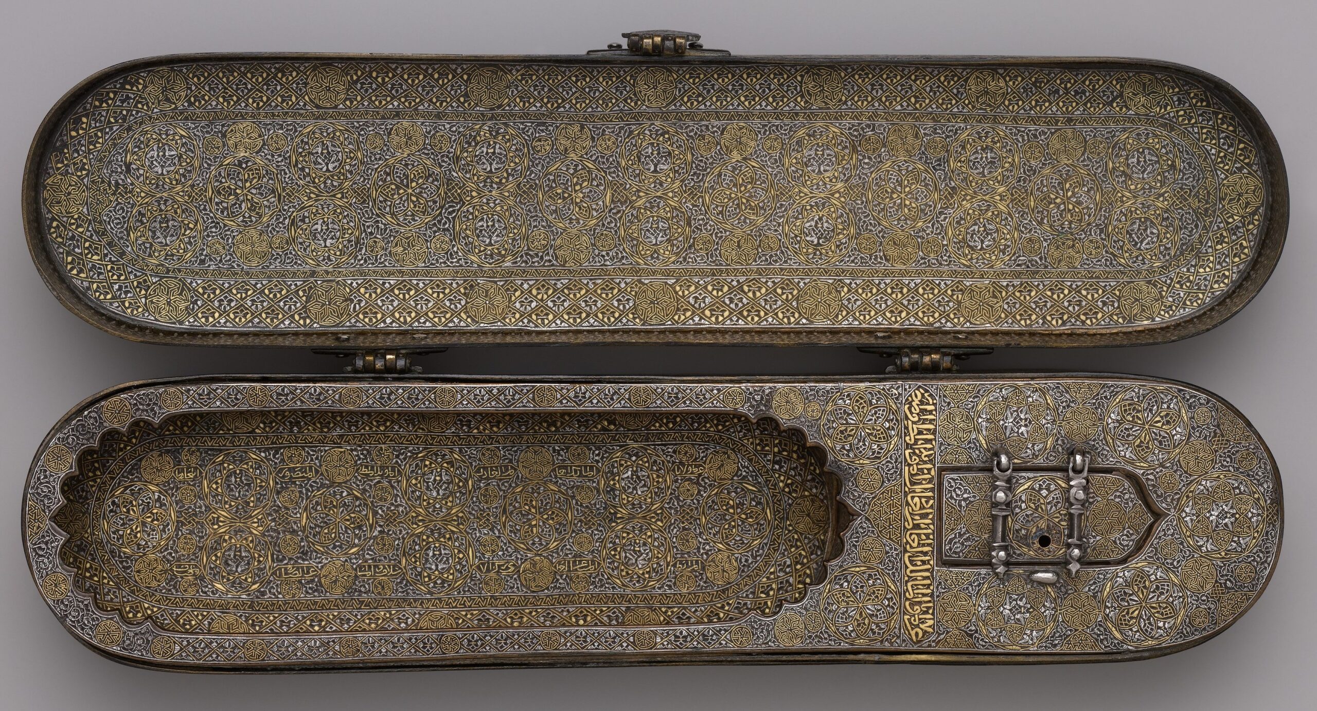This brass (with silver and gold inlay) writing case is part of the Museum of Art’s (NYC) Islamic Art collection. The lavish miniature overall decoration of this writing case consists of eulogic inscriptions.