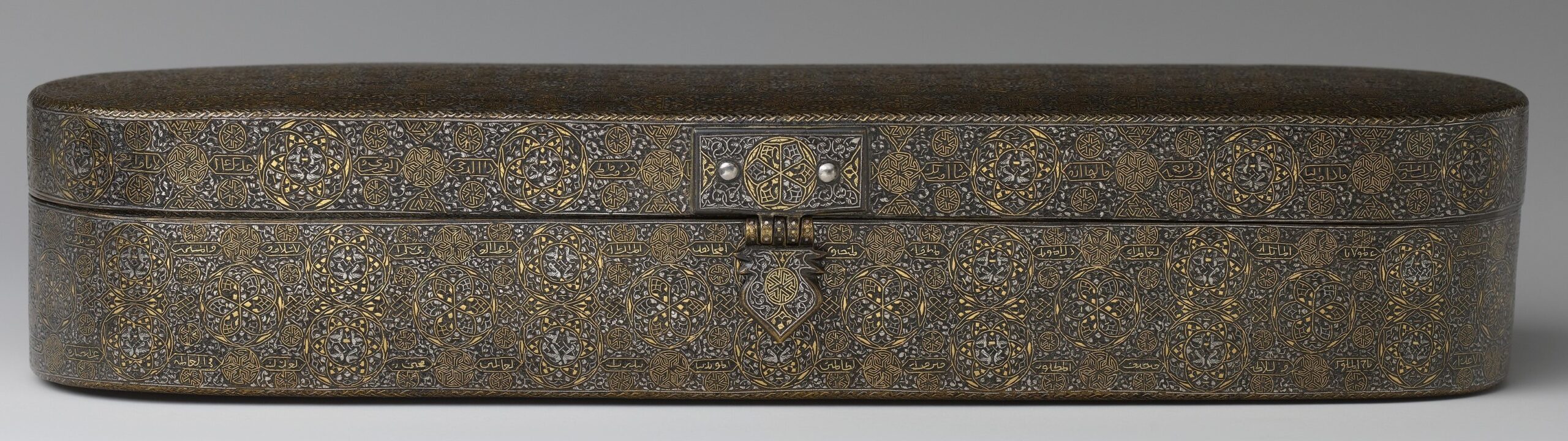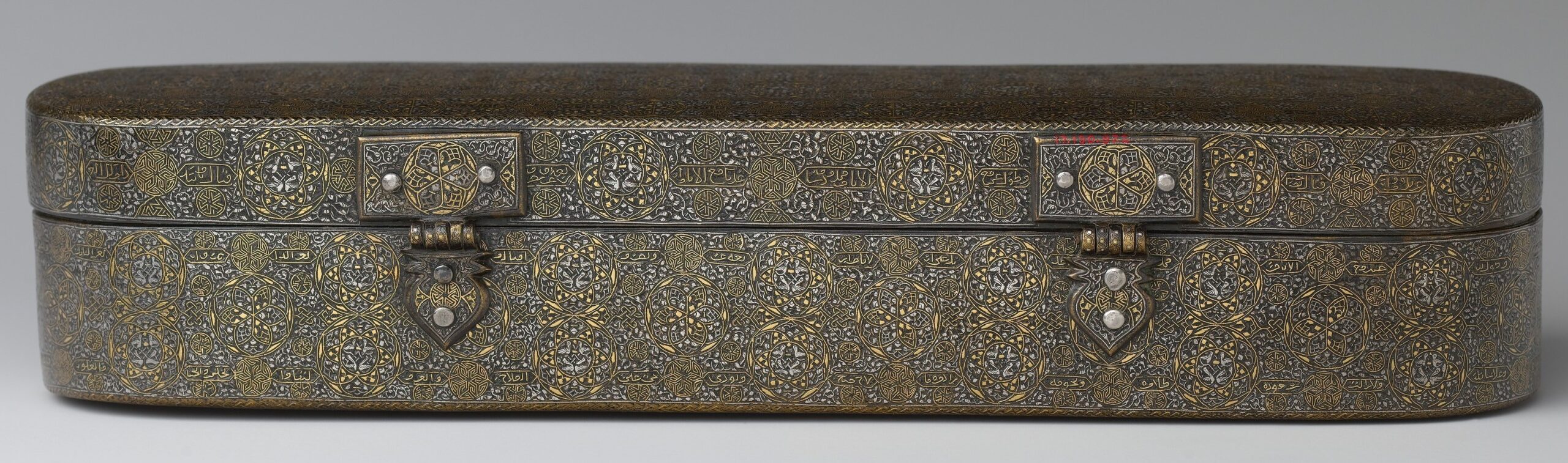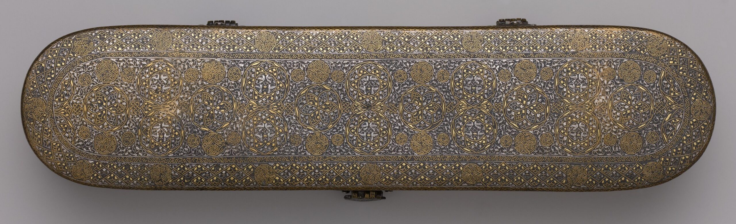This brass (with silver and gold inlay) writing case is part of the Museum of Art’s (NYC) Islamic Art collection. The lavish miniature overall decoration of this writing case consists of eulogic inscriptions.