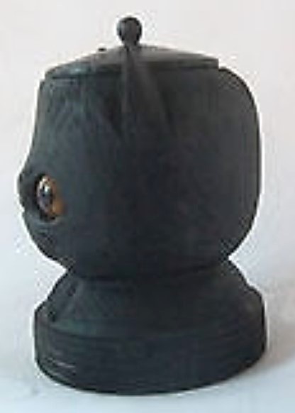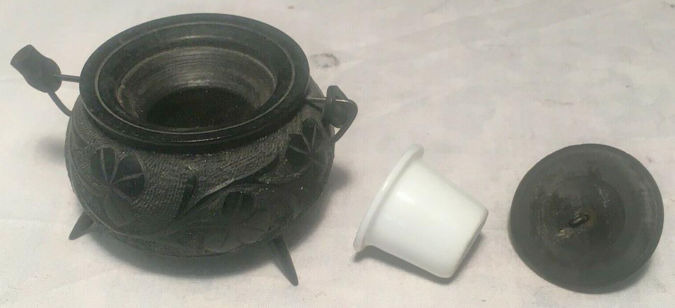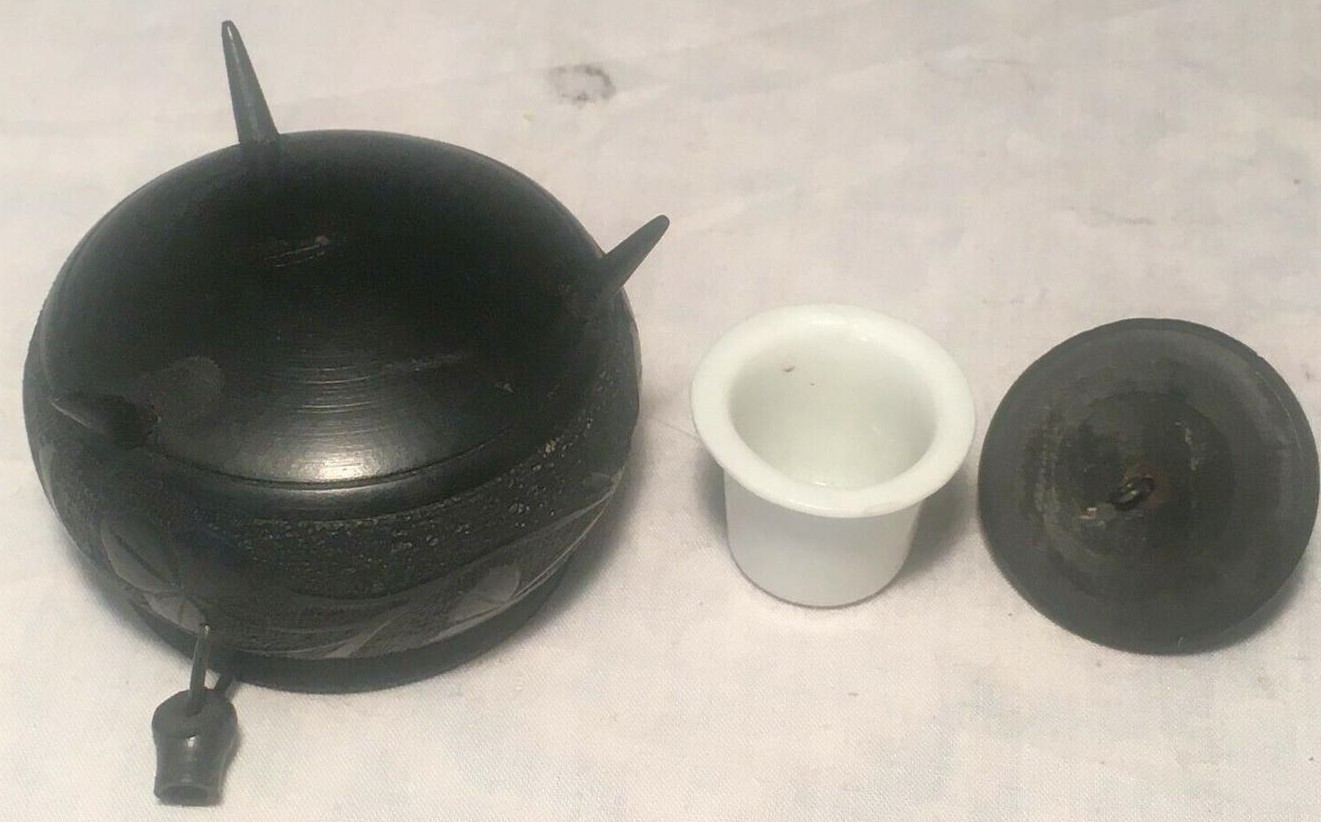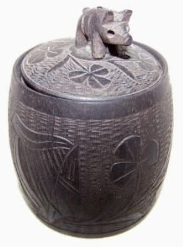 #1 – Cauldron-shaped hand carved inkwell with an Irish shamrock and Celtic harp design. The finial on the lid is a carved pig. 2 ⅜” diameter; 2 ¼” high. Estimated value: $50