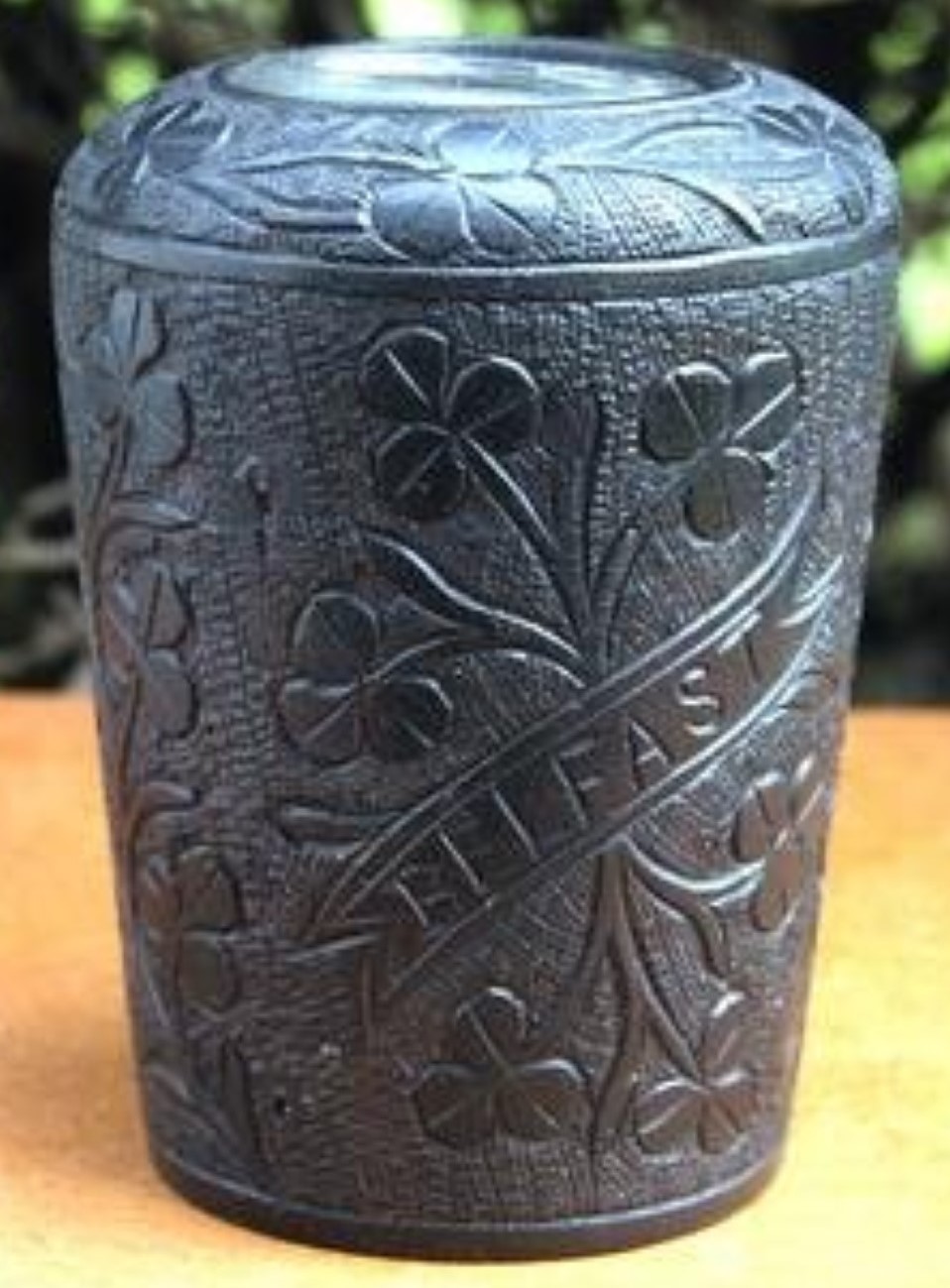 #2 – This lidded pot with handle was carved with shamrocks along the perimeter and has the word “Ink” carved on the lid. 2 ¾” long; 1 ¼” high. Estimated value: $40