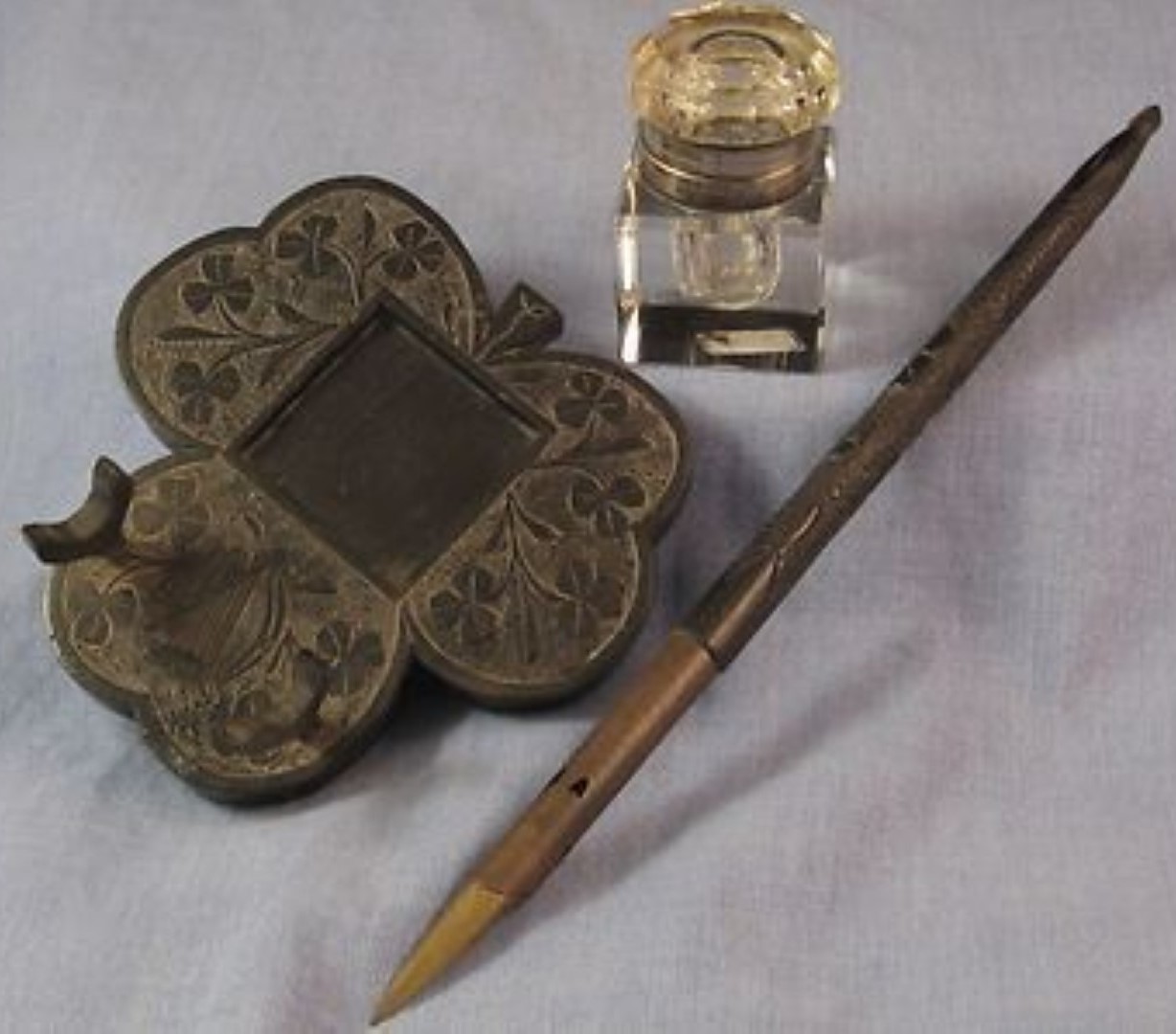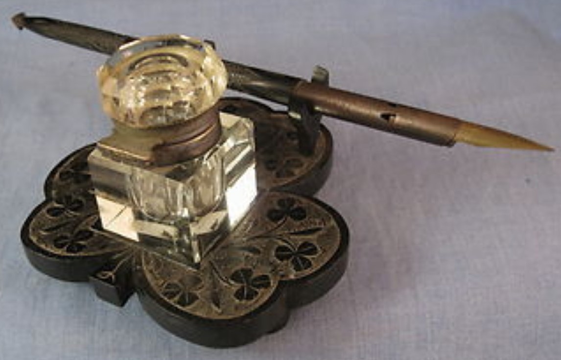 #5 – Hinged glass inkwell on an Irish bog oak base in the shape of a shamrock decorated with shamrocks and a harp. Resting on its pen holder is a matching bog oak dip pen. Base: 3 ⅜” x 3 ¼”. Estimated value: $75