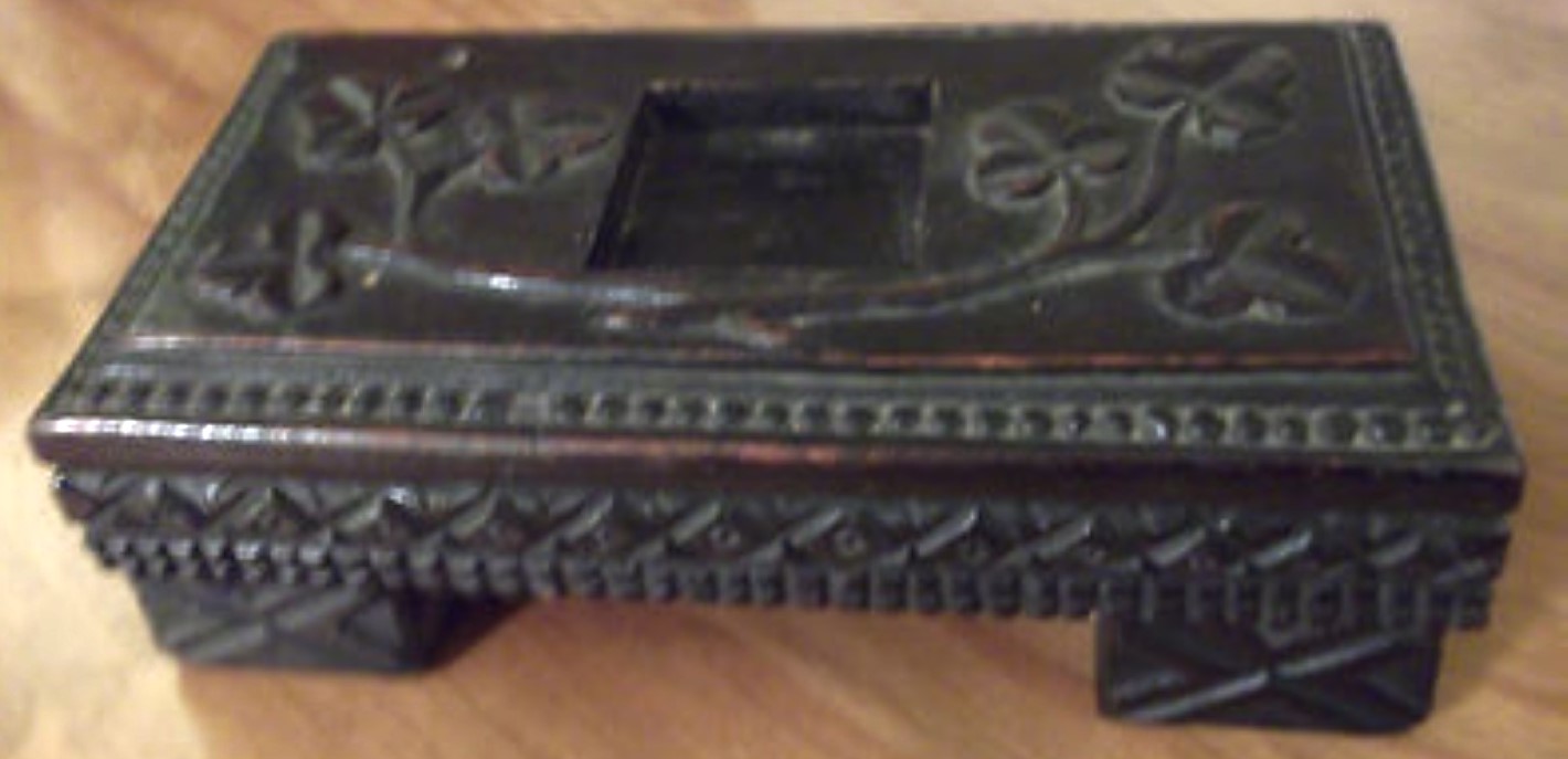 #7 – Irish carved bog oak inkstand with cut glass hinged inkwell. The base is made from a solid lump of bog oak and decorated with shamrocks. 6 ¼” x 3 ¼” Sold for $225 in November 2012