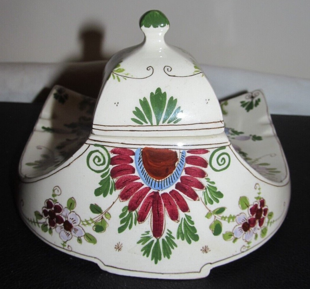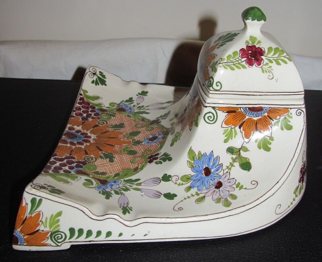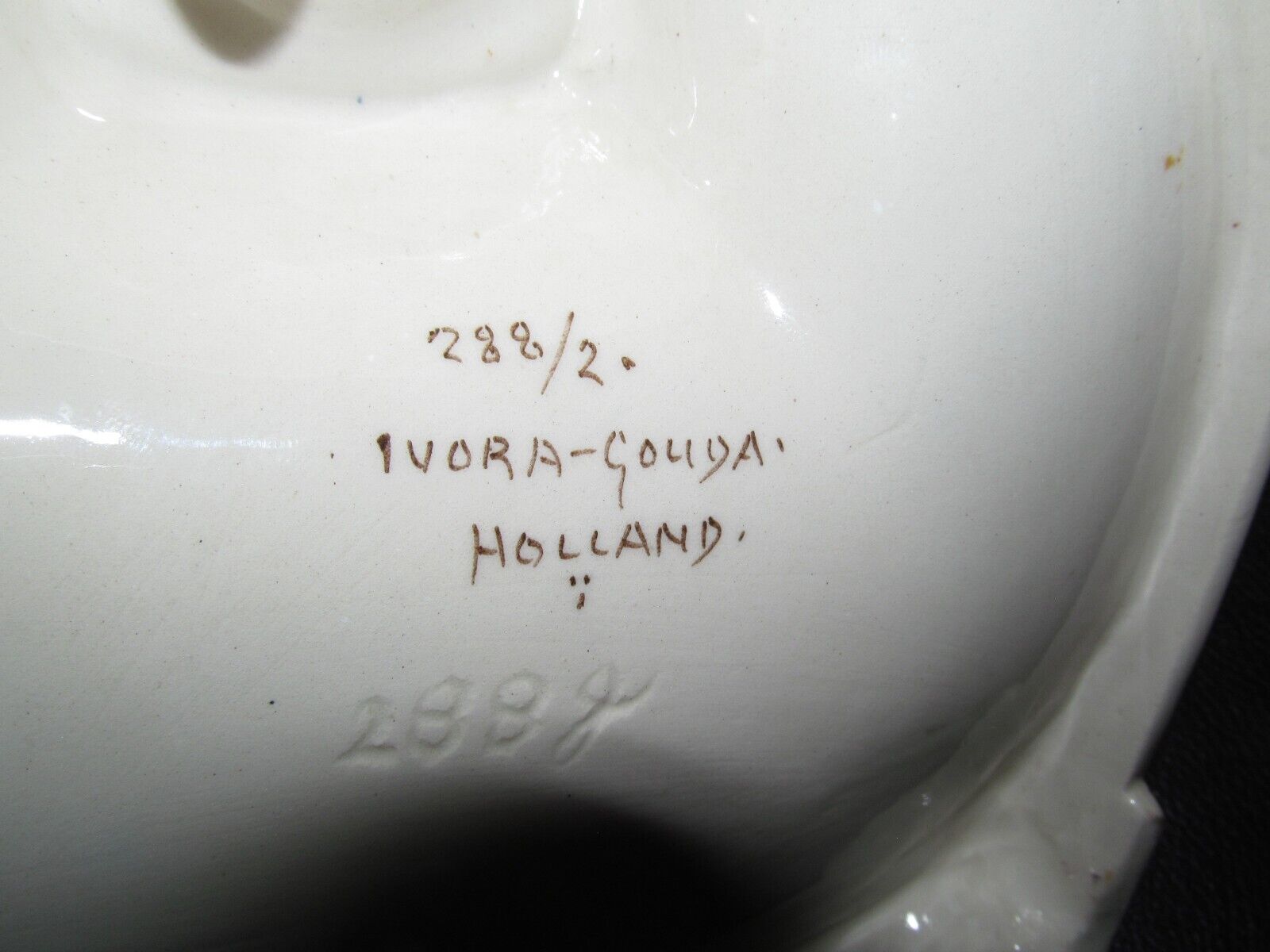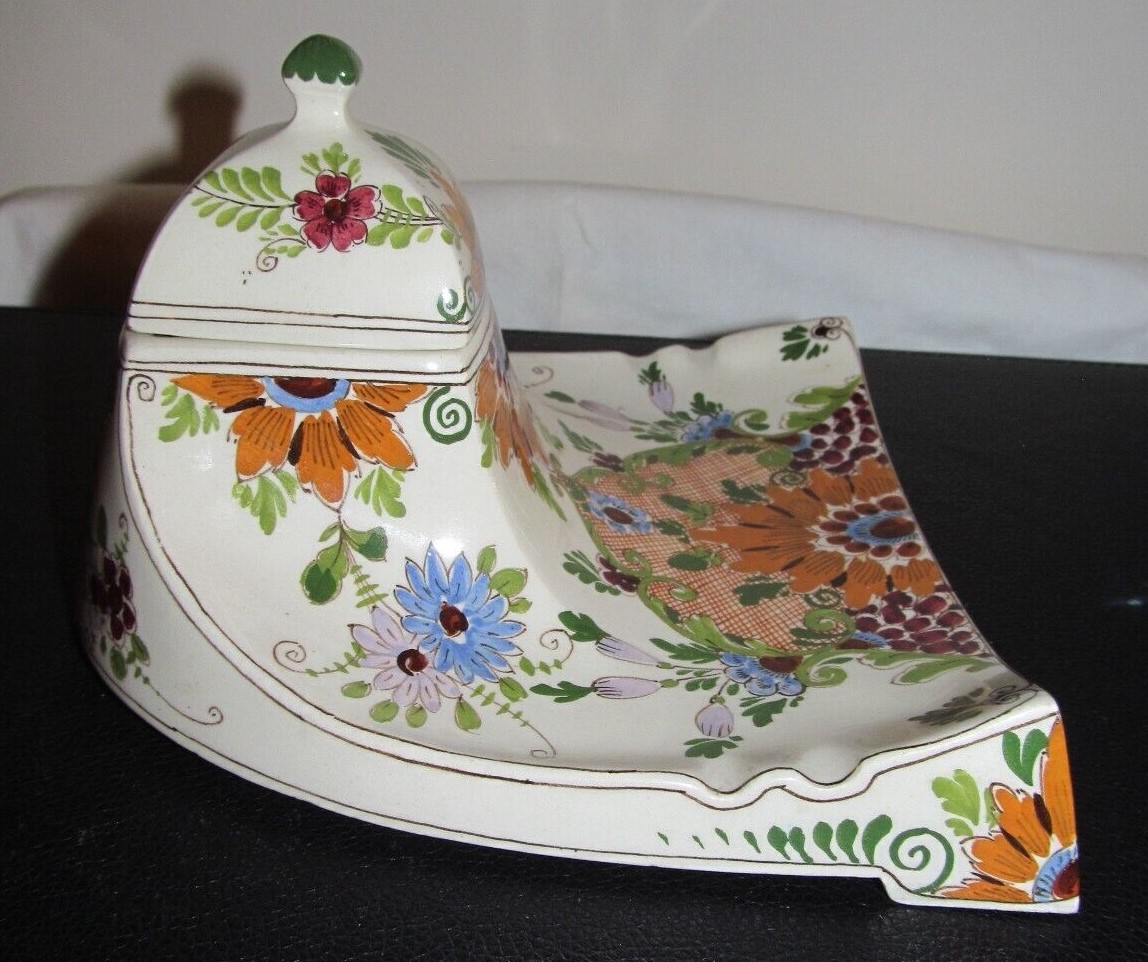 This Ivora-Gouda high glaze inkstand was produced by Plateelfabriek Ivora, which was created by Ivon vander Want in 1914 to replace the centuries old pipe manufacturer P. Van der Want Co. This inkwell has a striking Art Nouveau inspired design with stylized flower blossoms hand painted on an ivory background. The piece is marked Ivora-Gouda Holland and production number 288/2.