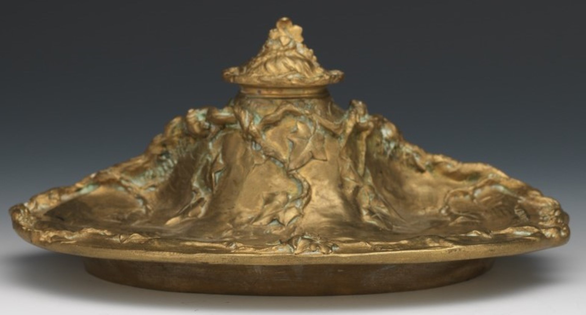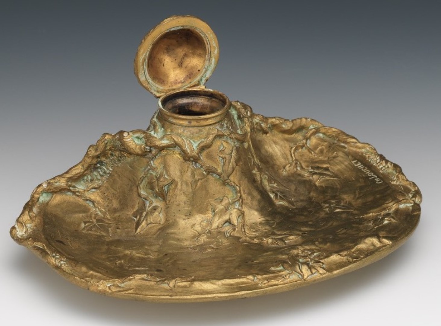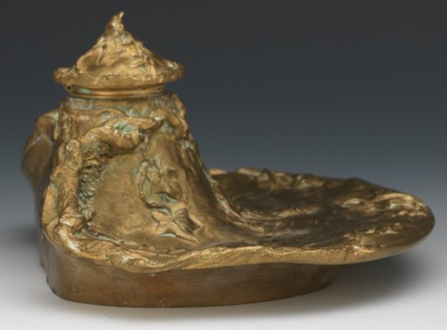 Gilt-bronze inkstand cast as an ivy-covered tree stump. Signed “CH. LOUCHET”. (Charles Louchet, 1854-1936, French)