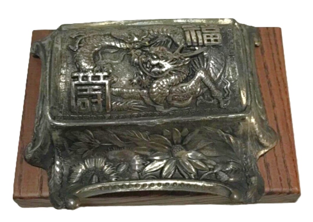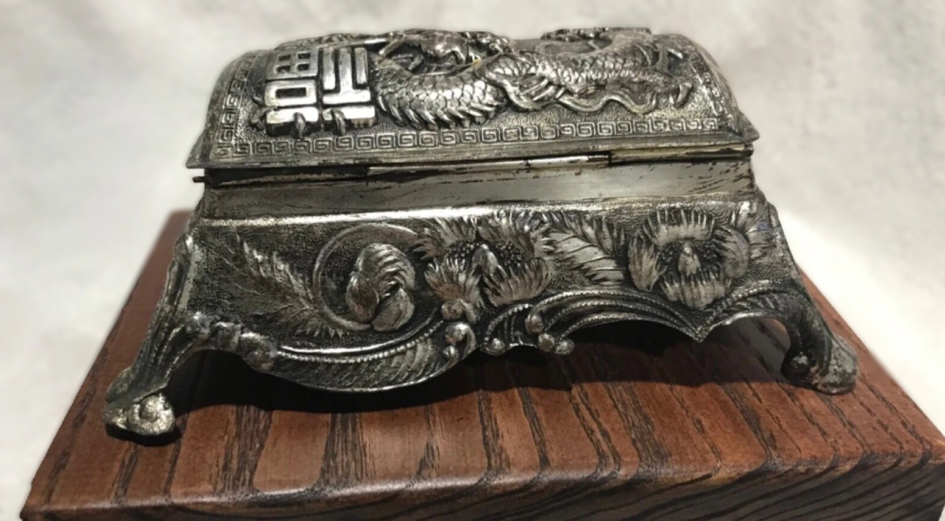 • Structure: It features a rectangular, slightly flared base decorated with embossed chrysanthemums, the national flower of Japan. The hinged lid is vaulted and features a high-relief Japanese dragon winding through clouds.