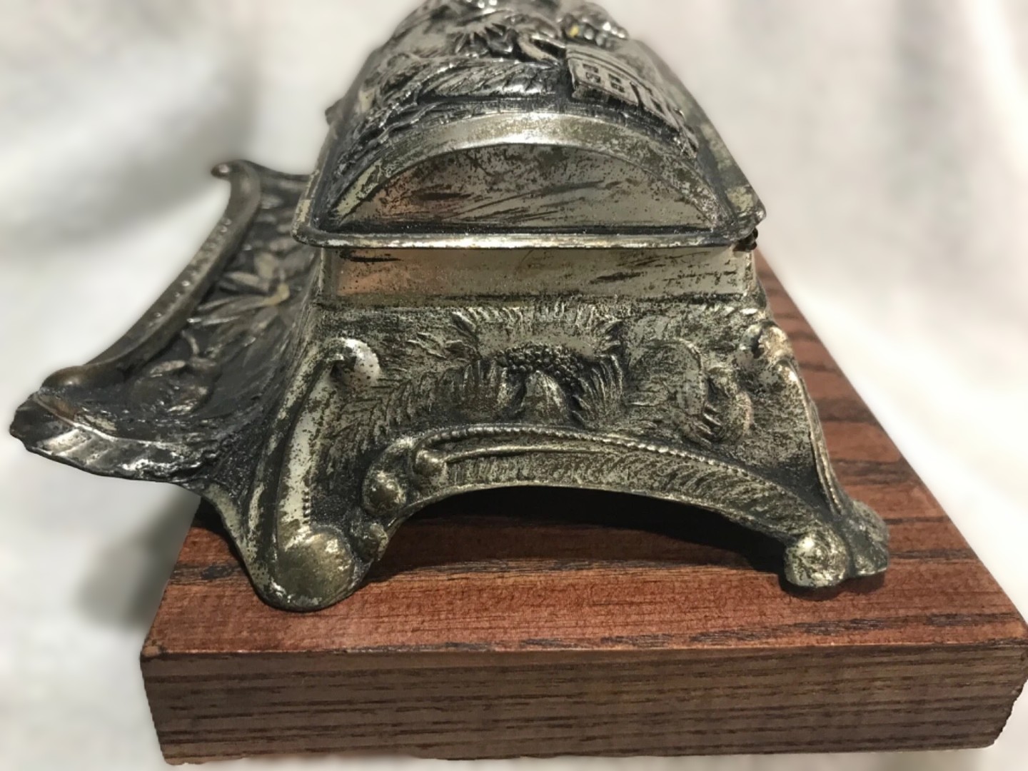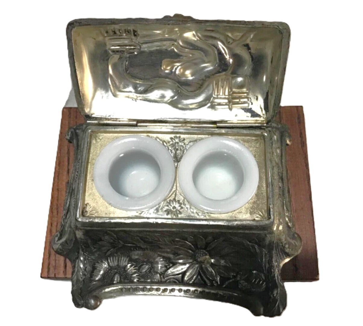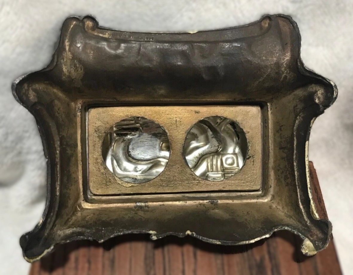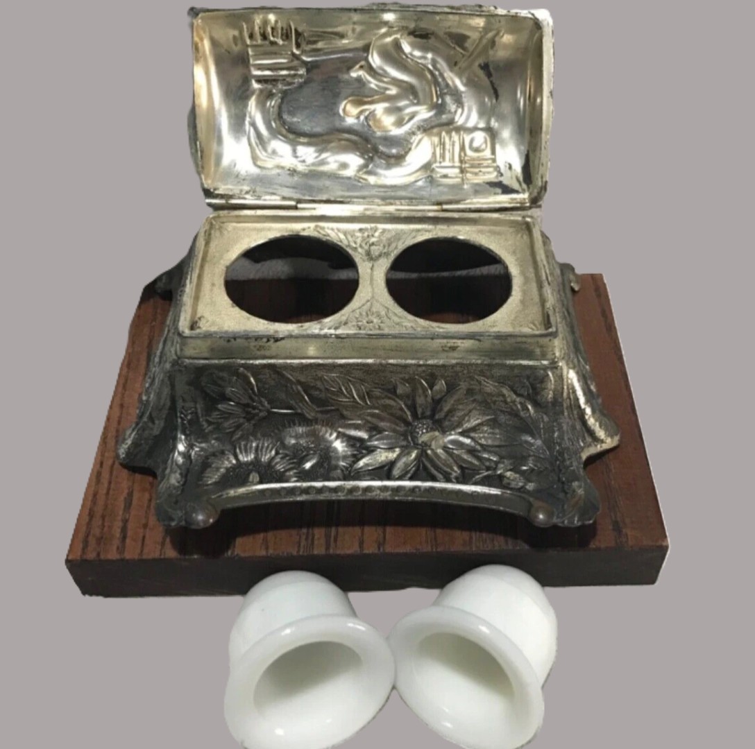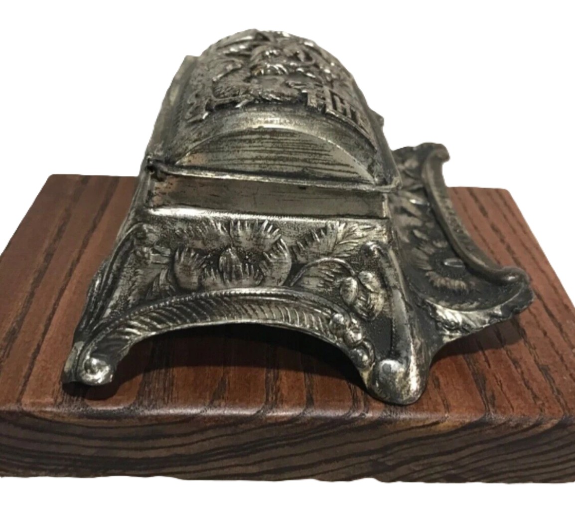 This silver-toned metal inkstand is a mid-20th-century Japanese creation that blends traditional East Asian motifs with a functional Western desk accessory form.