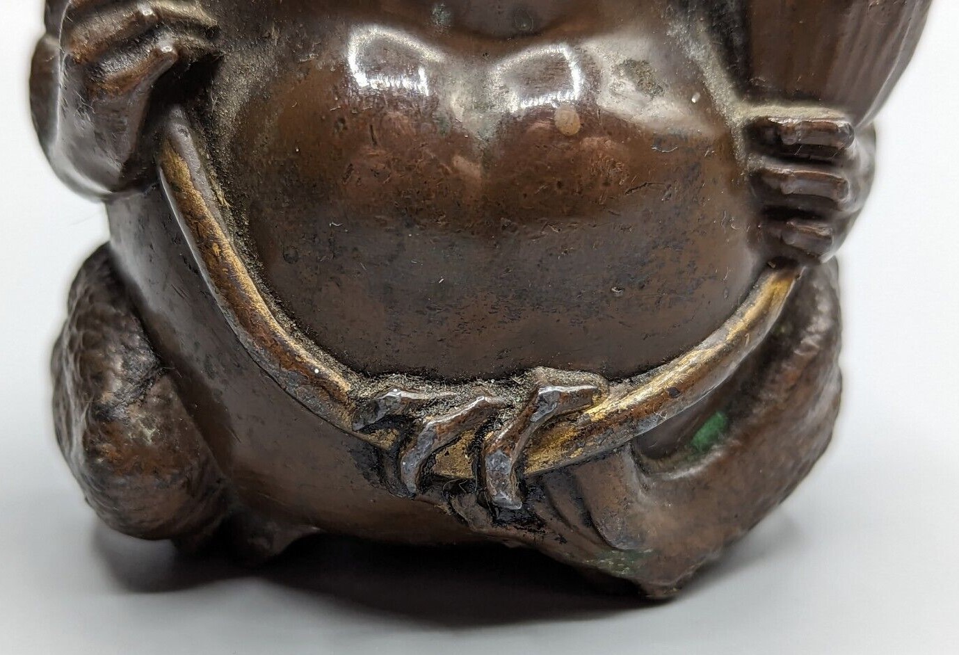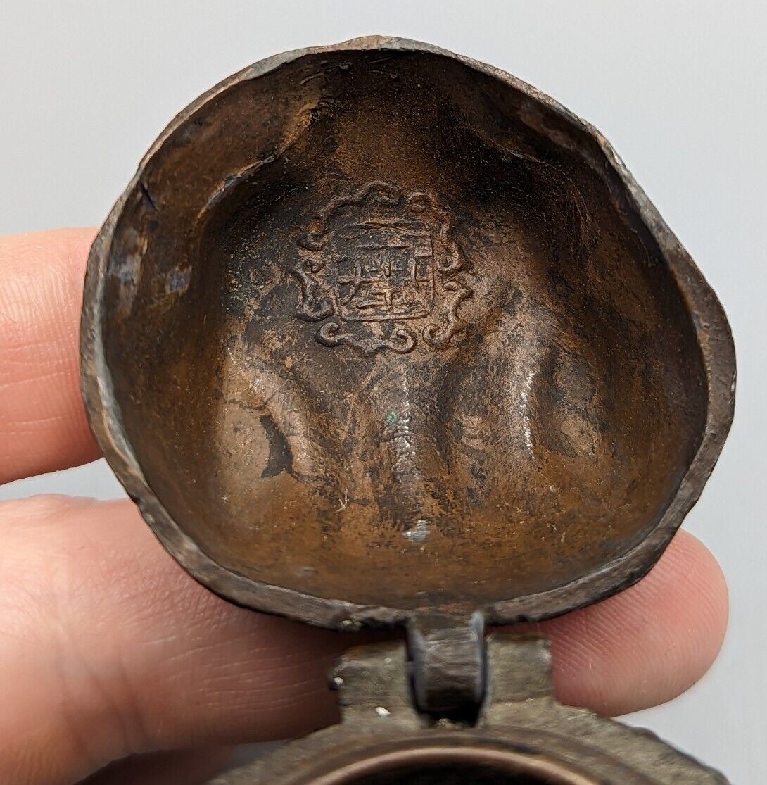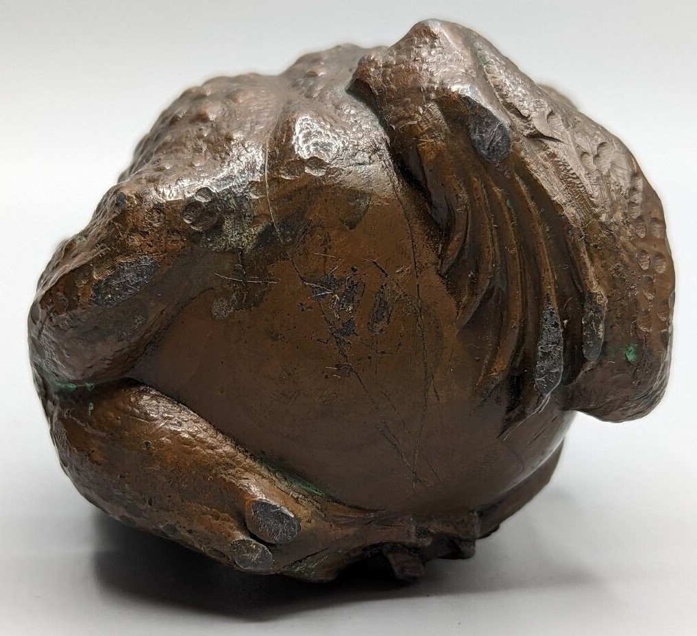This antique bronze Okimono is marked on the inside of the clasp lid, indicating its authenticity, and further enhancing its value”.