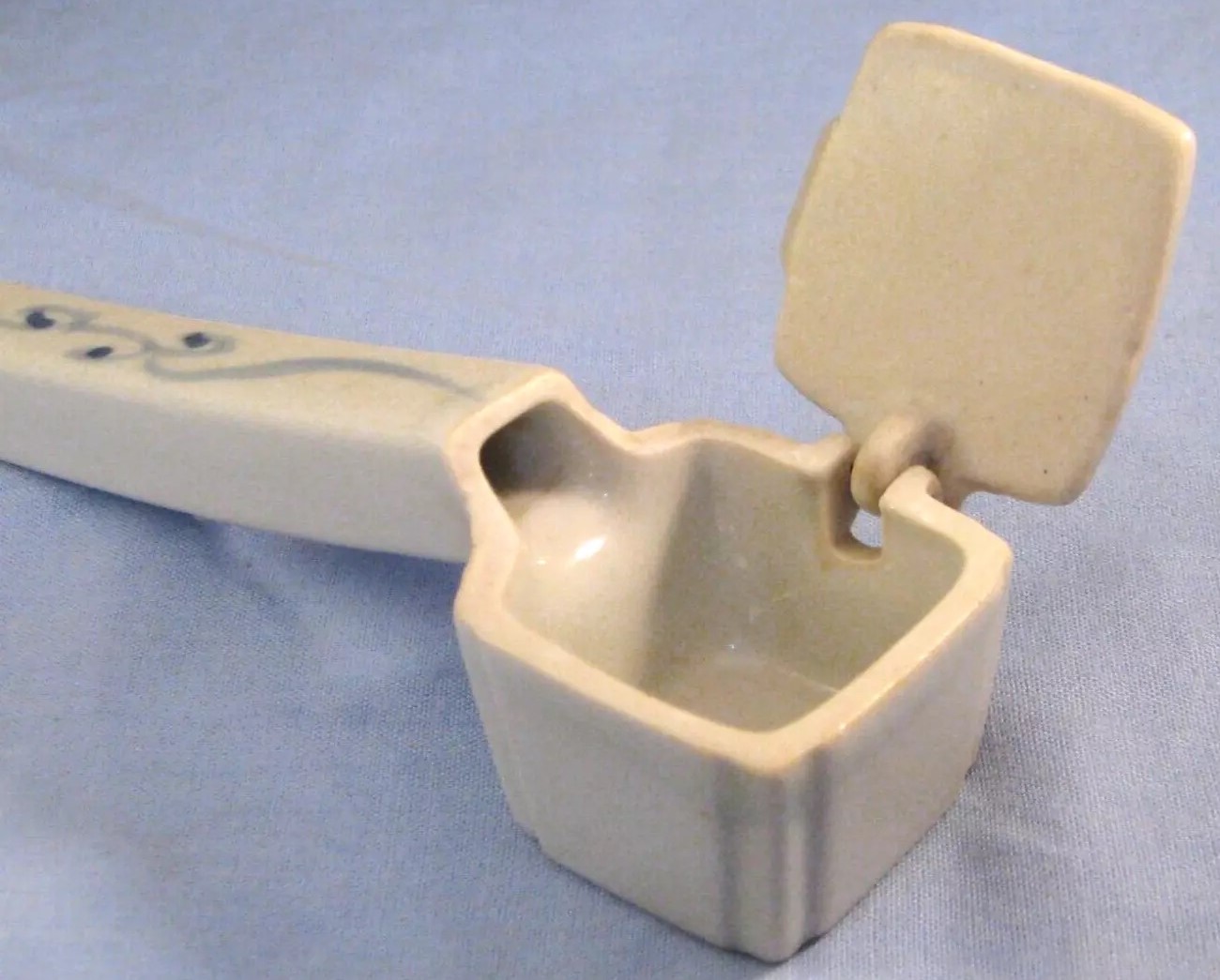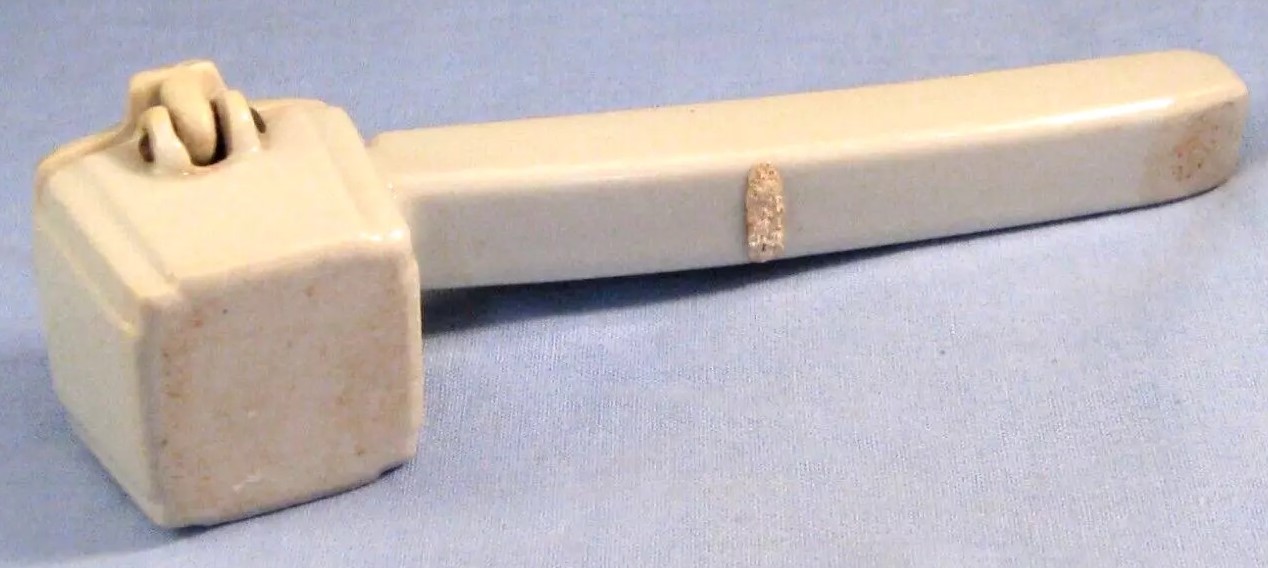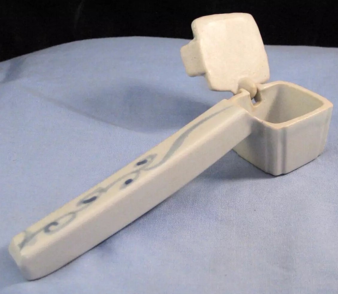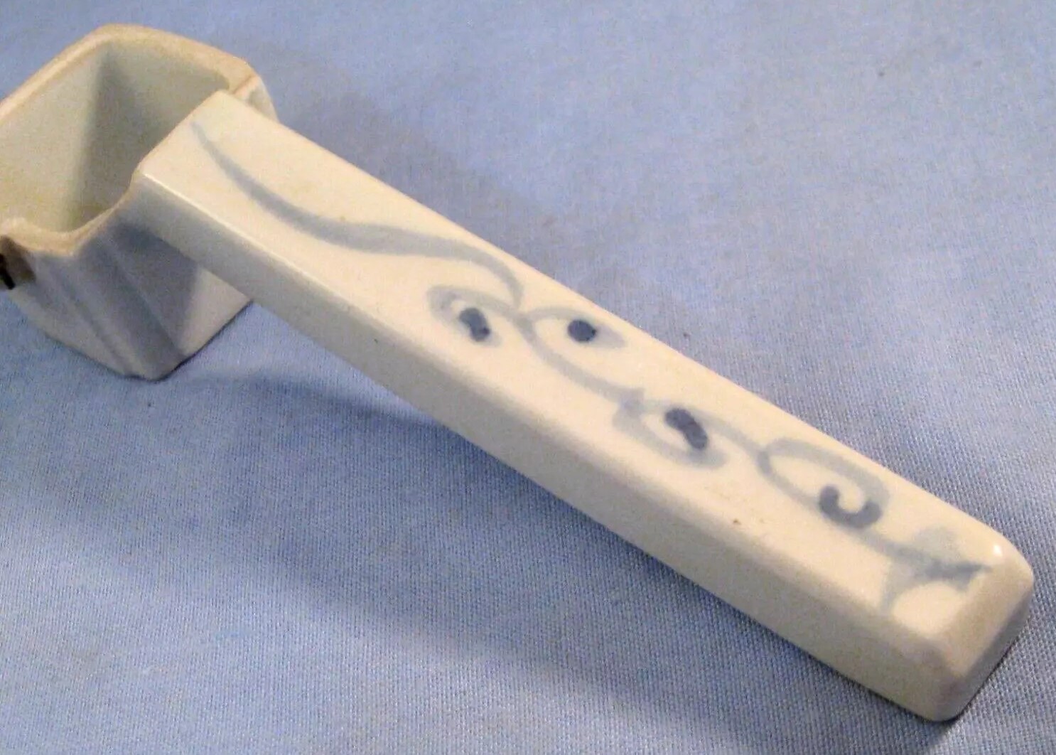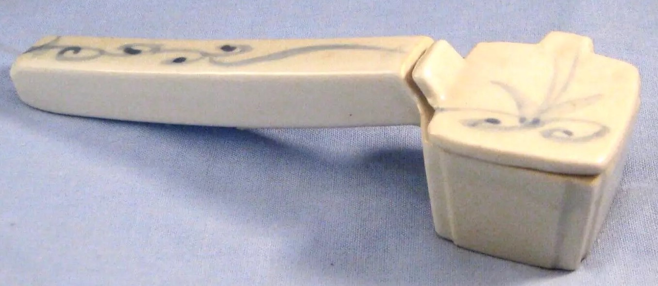 This is a Japanese glazed porcelain Yatate from the mid-1800s. The Yatate was a traveling scribe’s or artist’s case, with an inkwell at one end and a long shaft for holding writing tools and brushes. The white porcelain has a simple blue decoration along the top of the shaft and on top of the inkwell. Under the shaft one sees where the Yatate was fired and has no glaze in a small area.