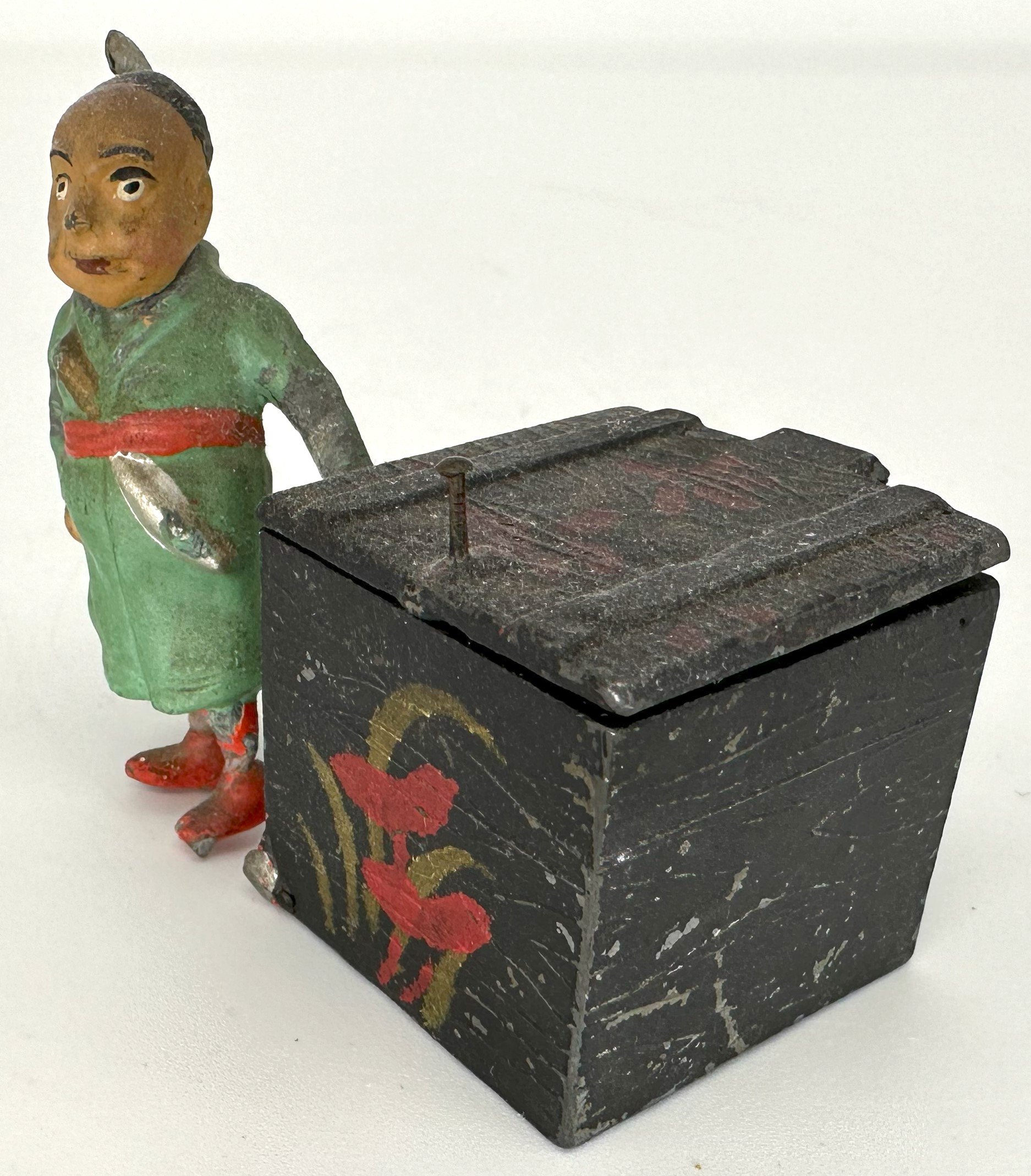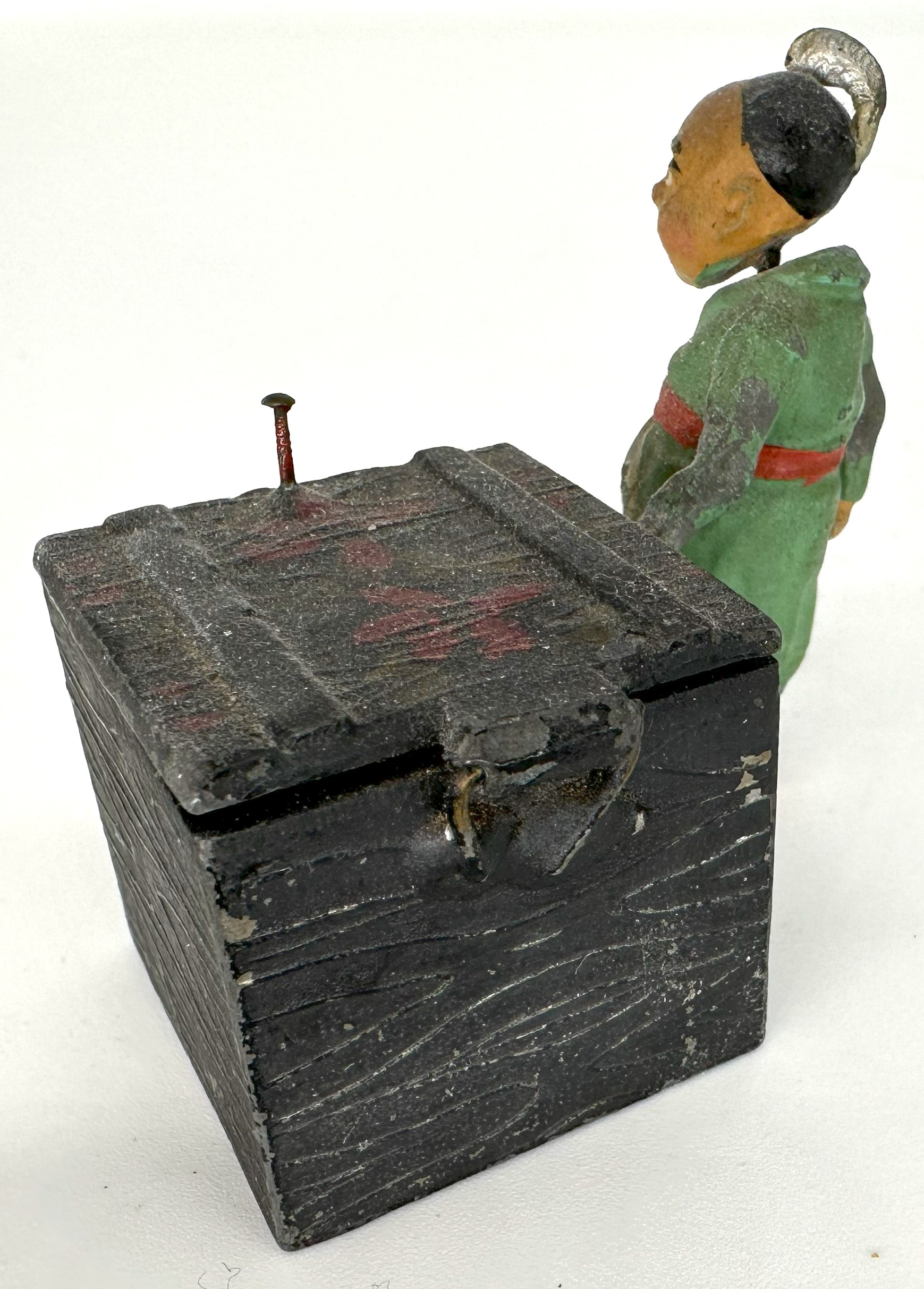 A Japanese samurai, sword in belt, stands next to an inkwell. Made of cold painted spelter, he is a “nodder” – the head bobbles.