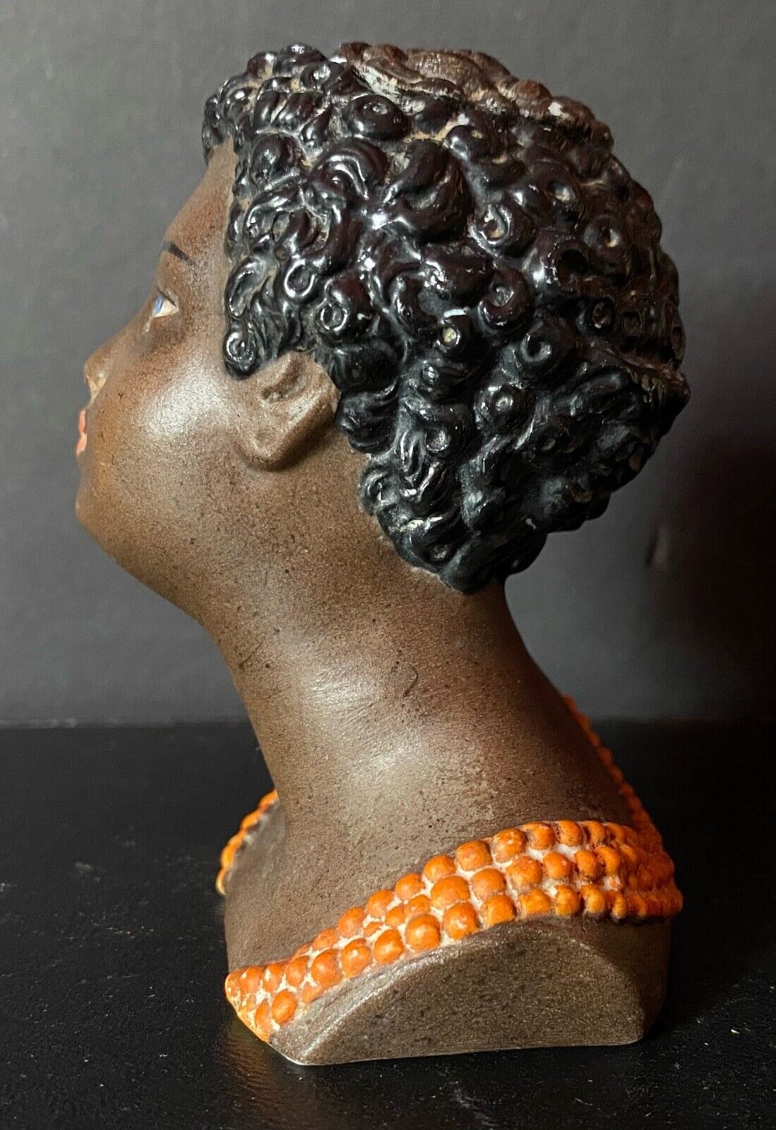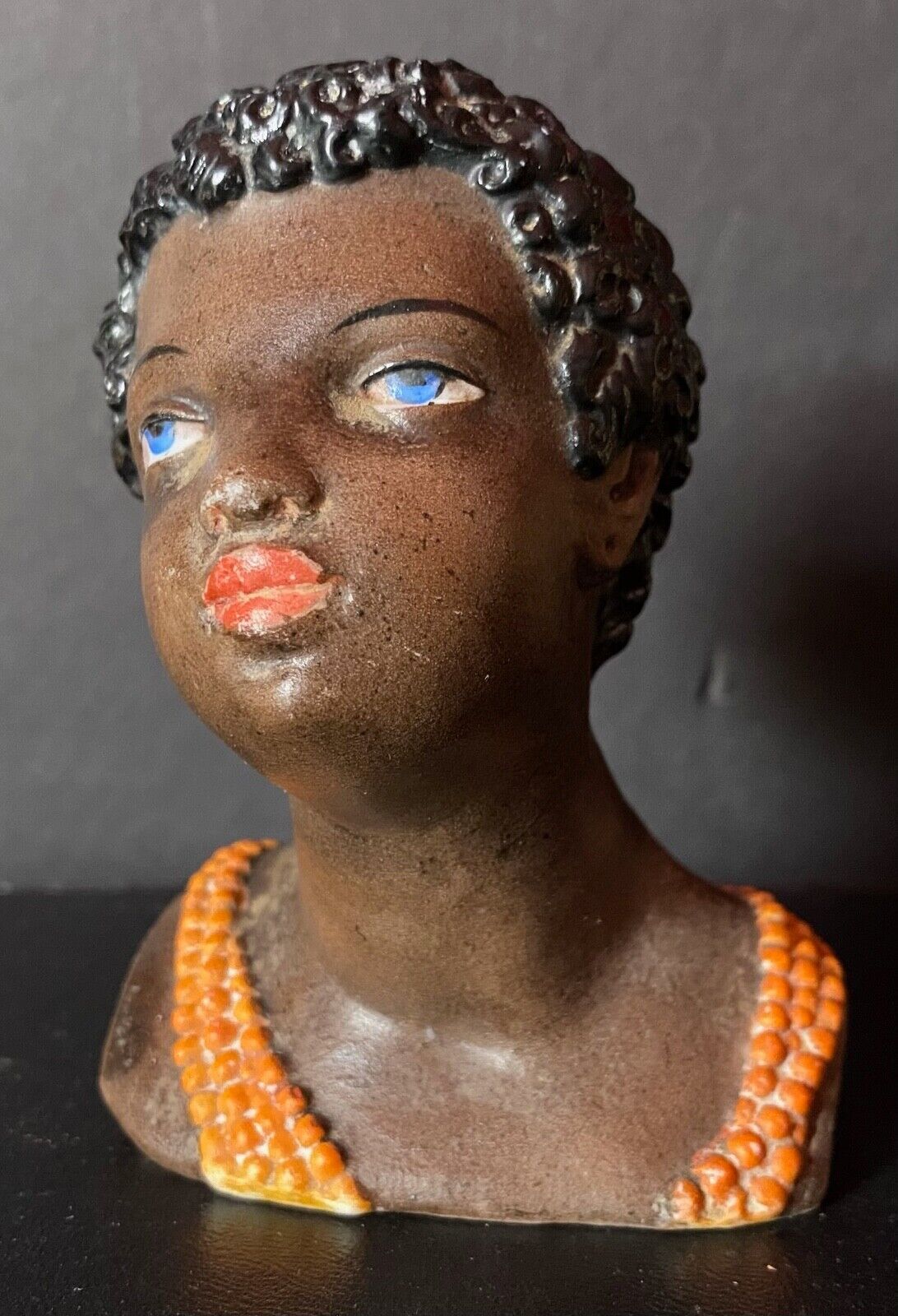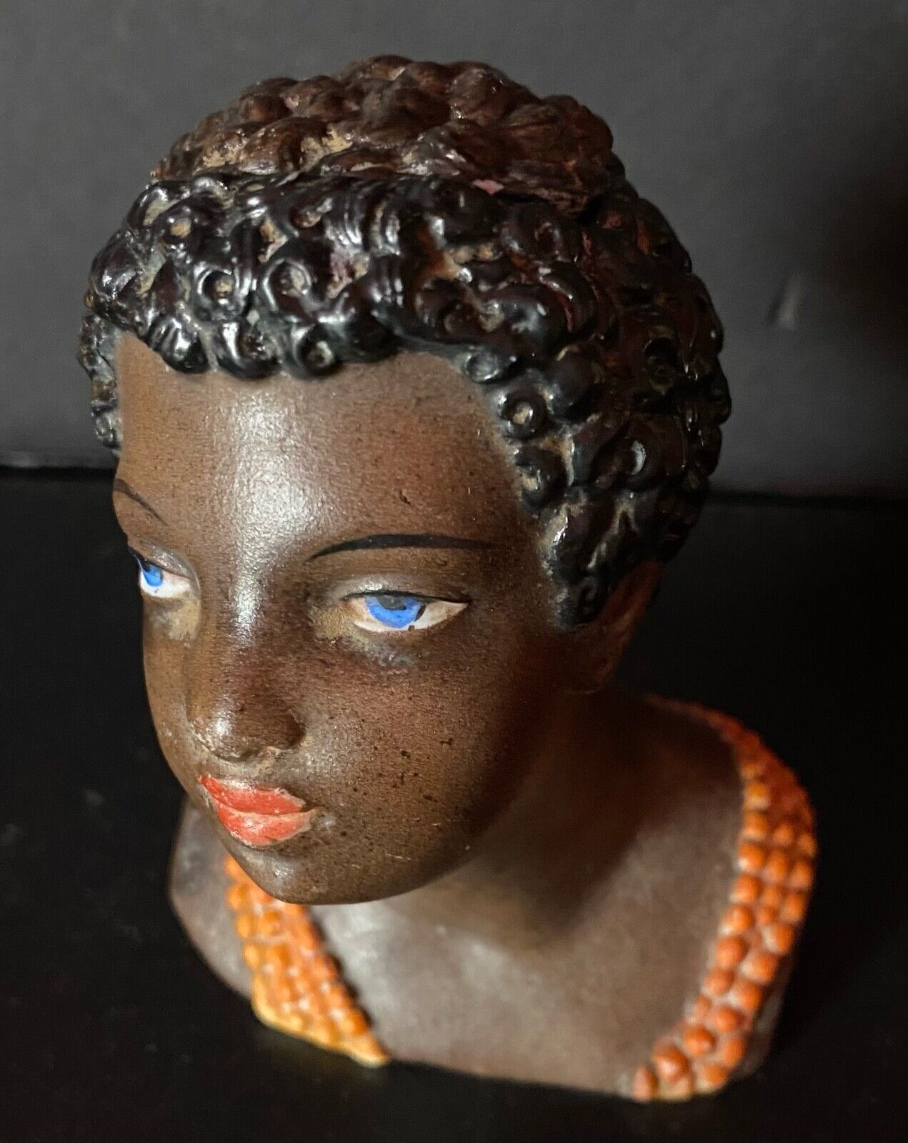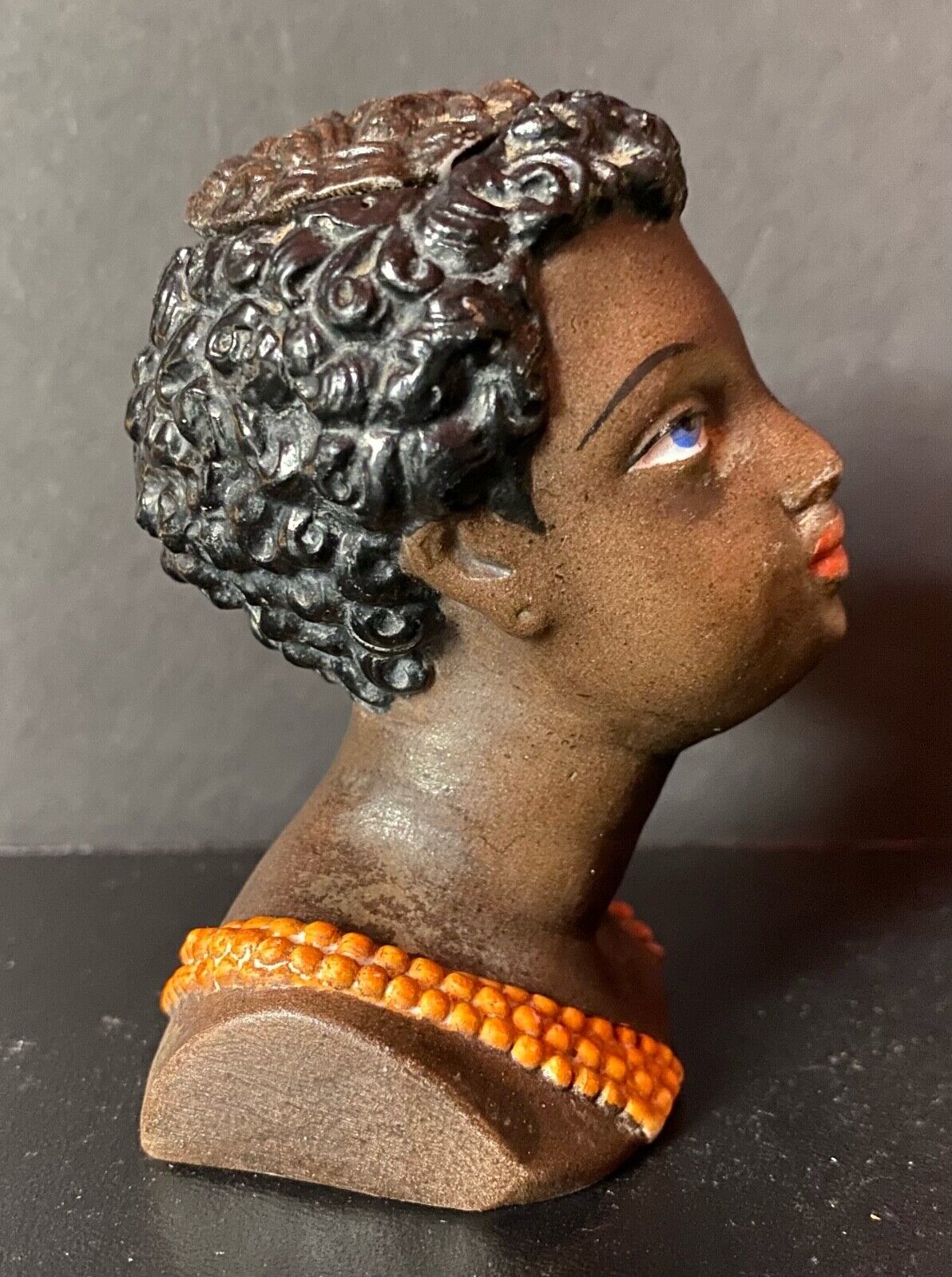 Porcelain / Pottery inkwell in the form of a bust of a dark-skinned, blue-eyed person. A portion of her hair lifts to access the well. With her beautiful orange necklace, she has the look of a jazz singer.