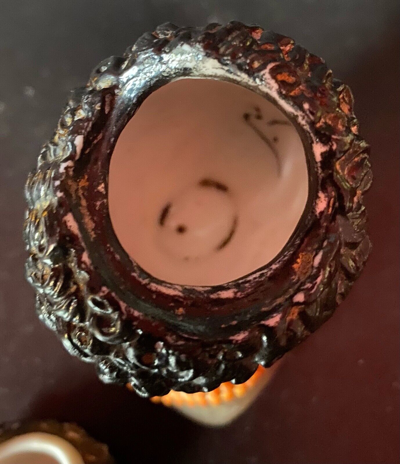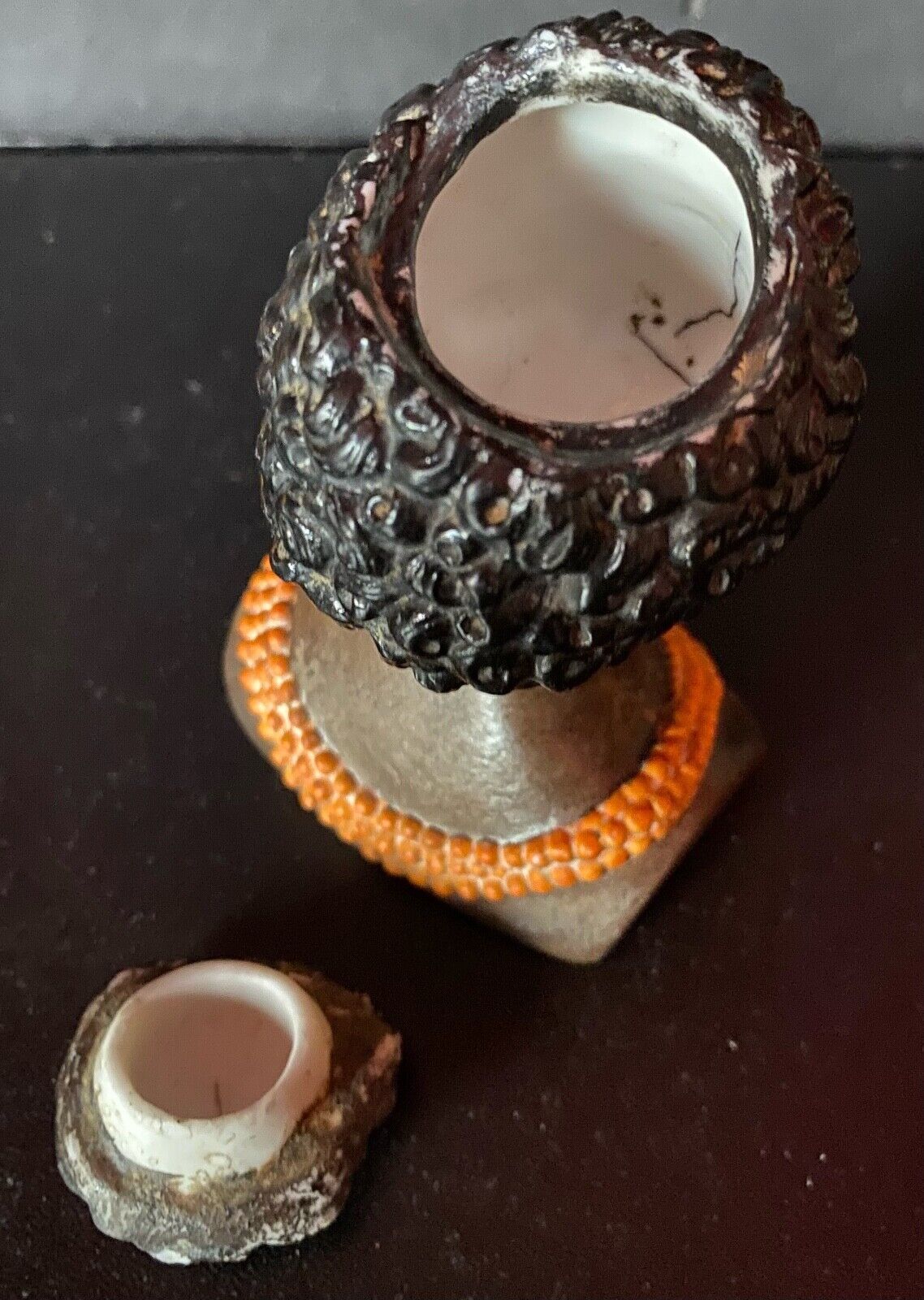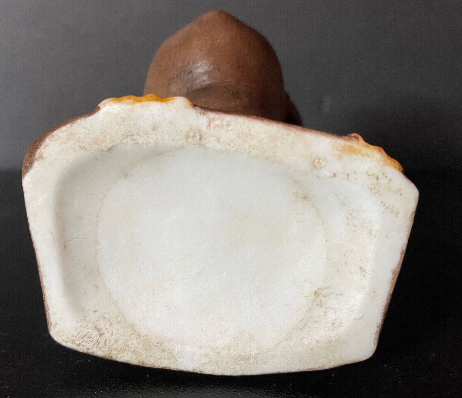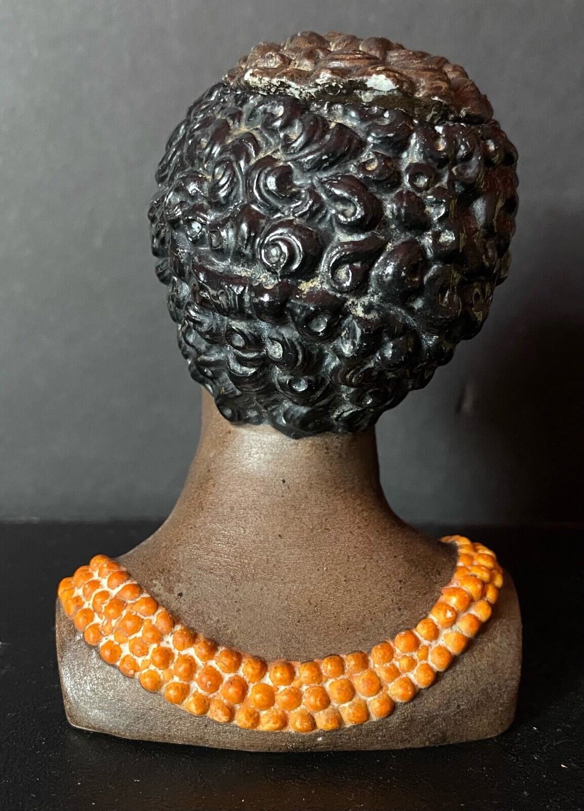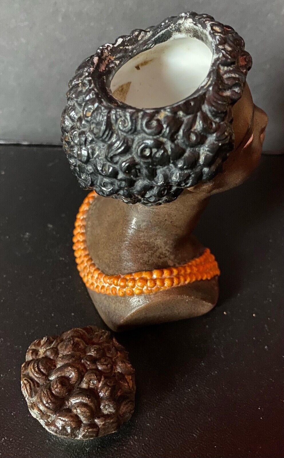 Porcelain / Pottery inkwell in the form of a bust of a dark-skinned, blue-eyed person. A portion of her hair lifts to access the well. With her beautiful orange necklace, she has the look of a jazz singer.