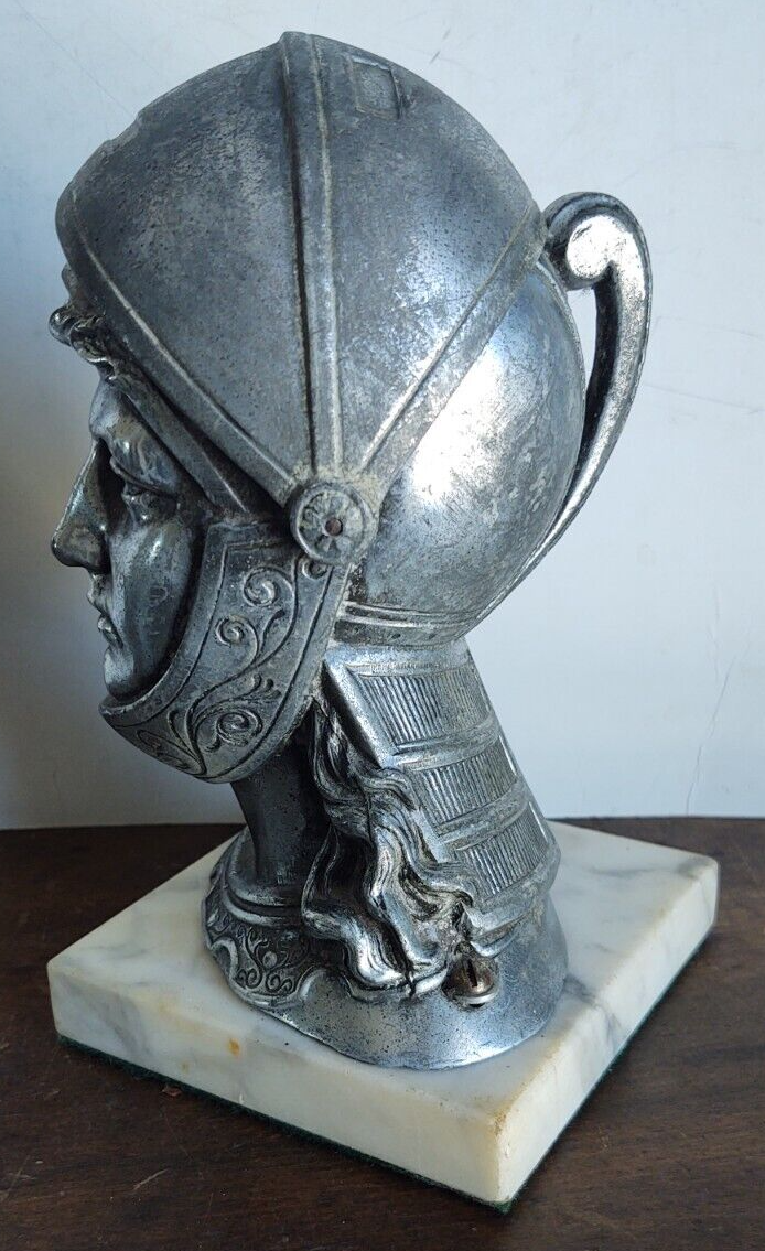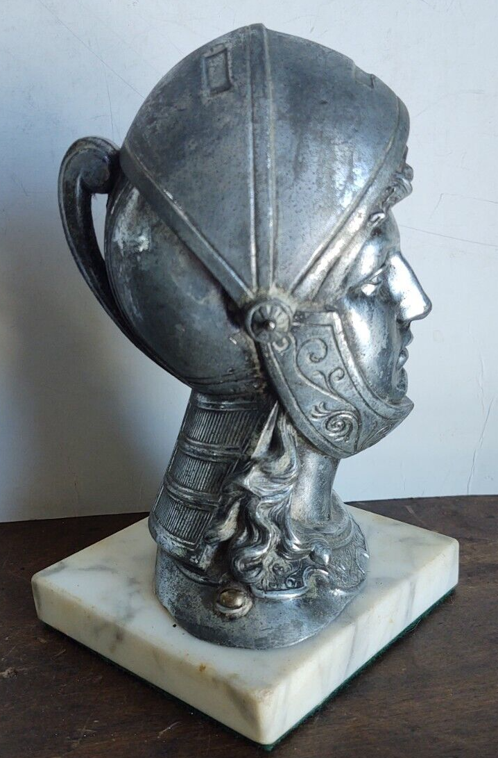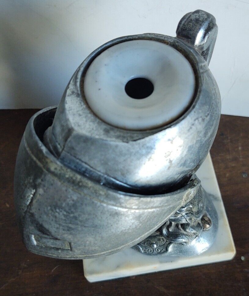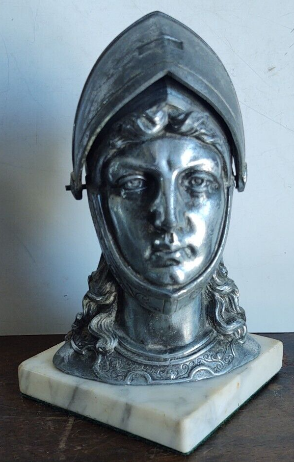 Pictures of a second version added 4/17/25: a bust of Joan of Arc that features an ornate helmet with decorative engravings and articulated cheek guards. The hinged top of the helmet lifts to reveal the original glass inkwell insert, securely fitted inside. The figure’s armor is highlighted with hand-painted gold and green details, contrasting with the metallic surface. A curved element at the back of the helmet adds to its sculptural appeal.