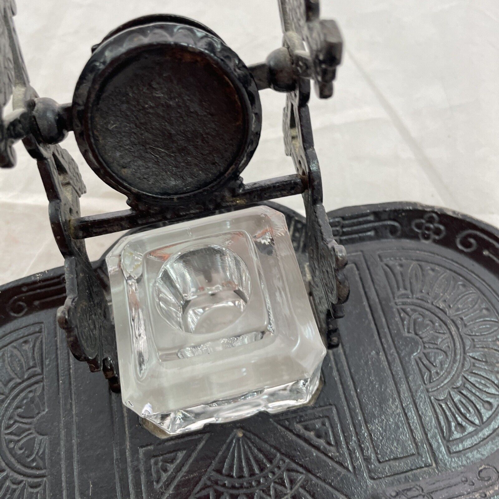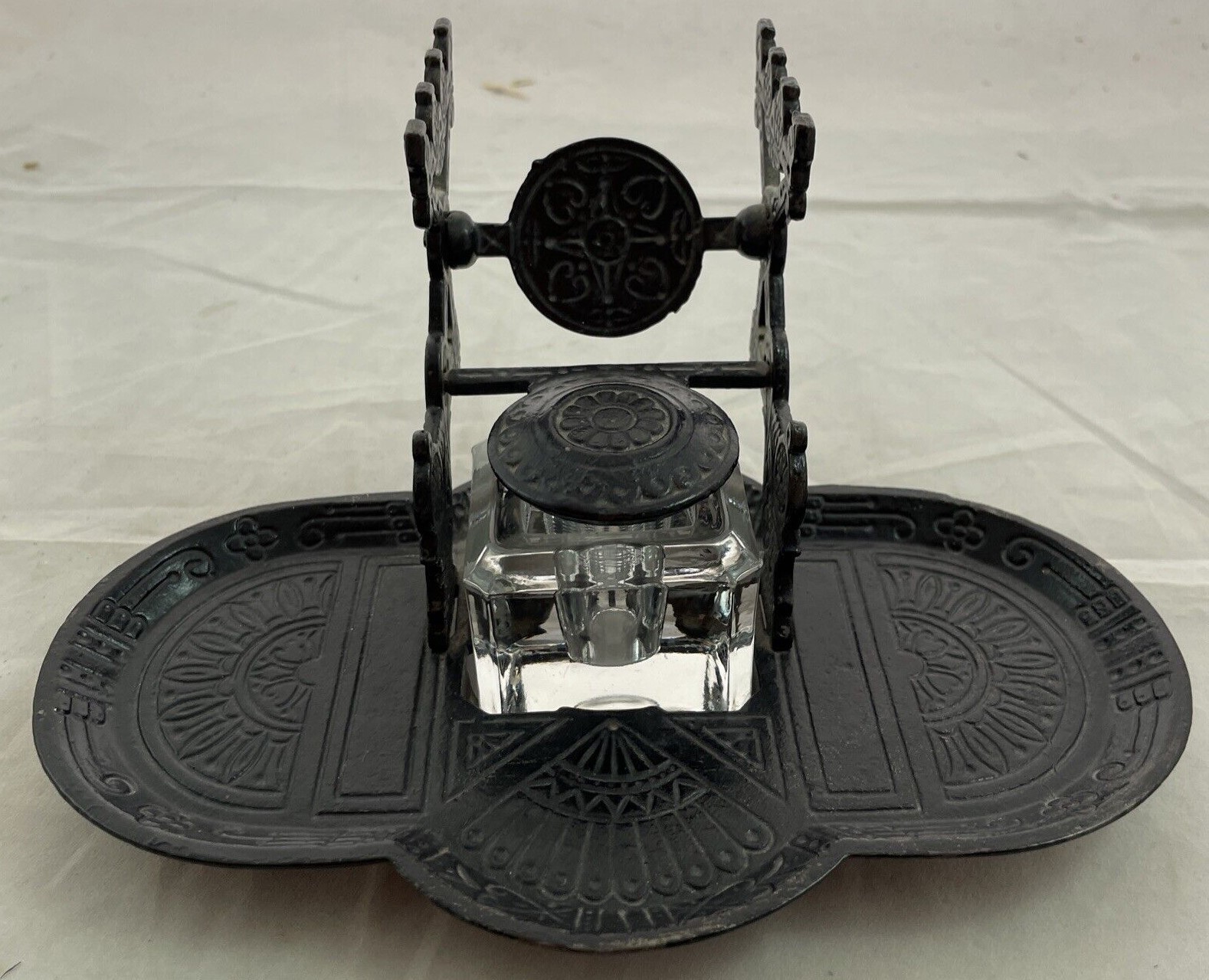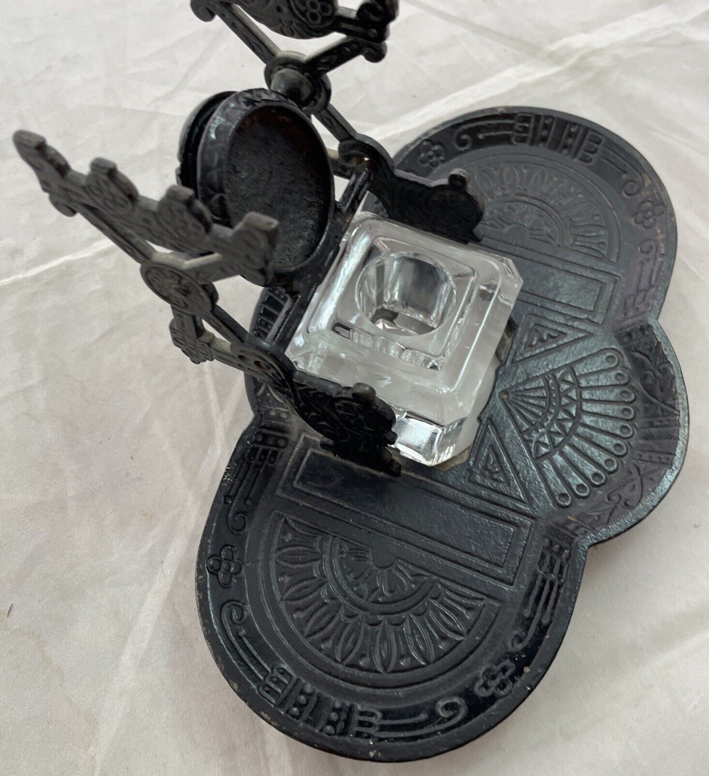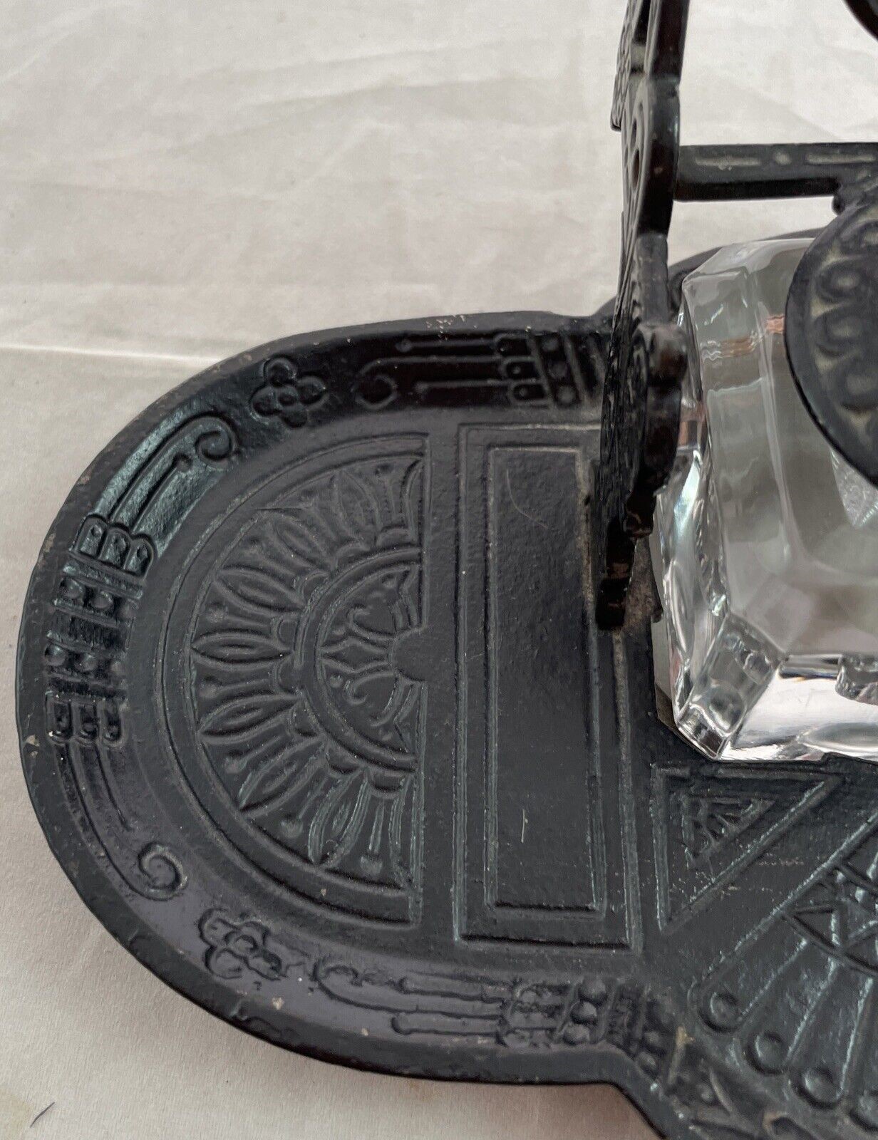 The pressed glass inkwell is held in a cast iron inkstand. The lid is attached to a bar on the frame and, when in use, lifts upright, resting on a disc. On top is a pen rack that can hold three pens. The circular shell base can hold writing implements.