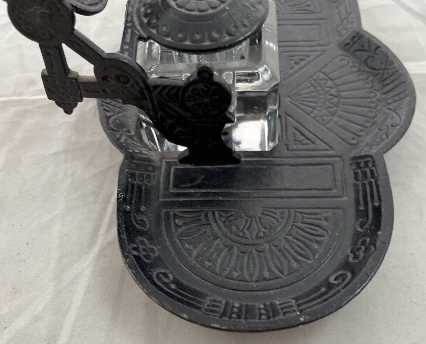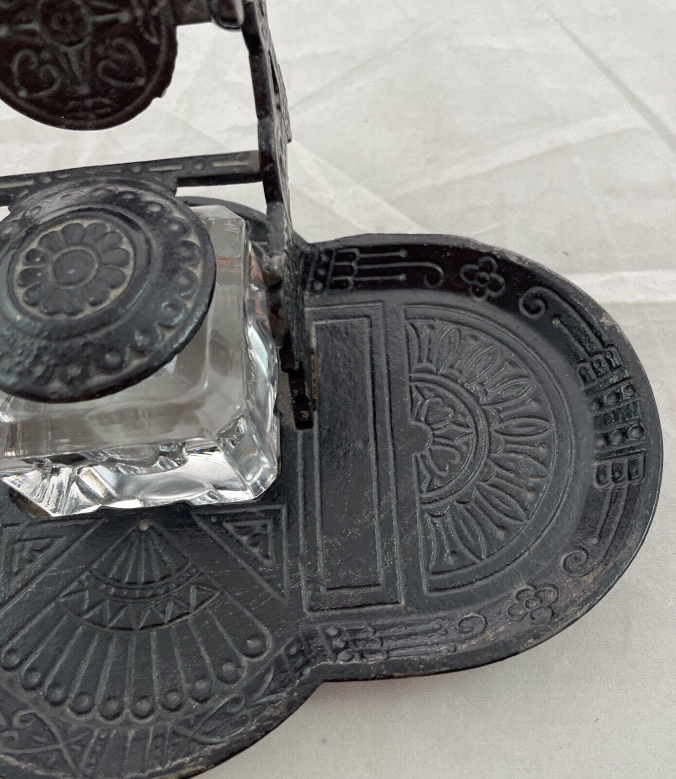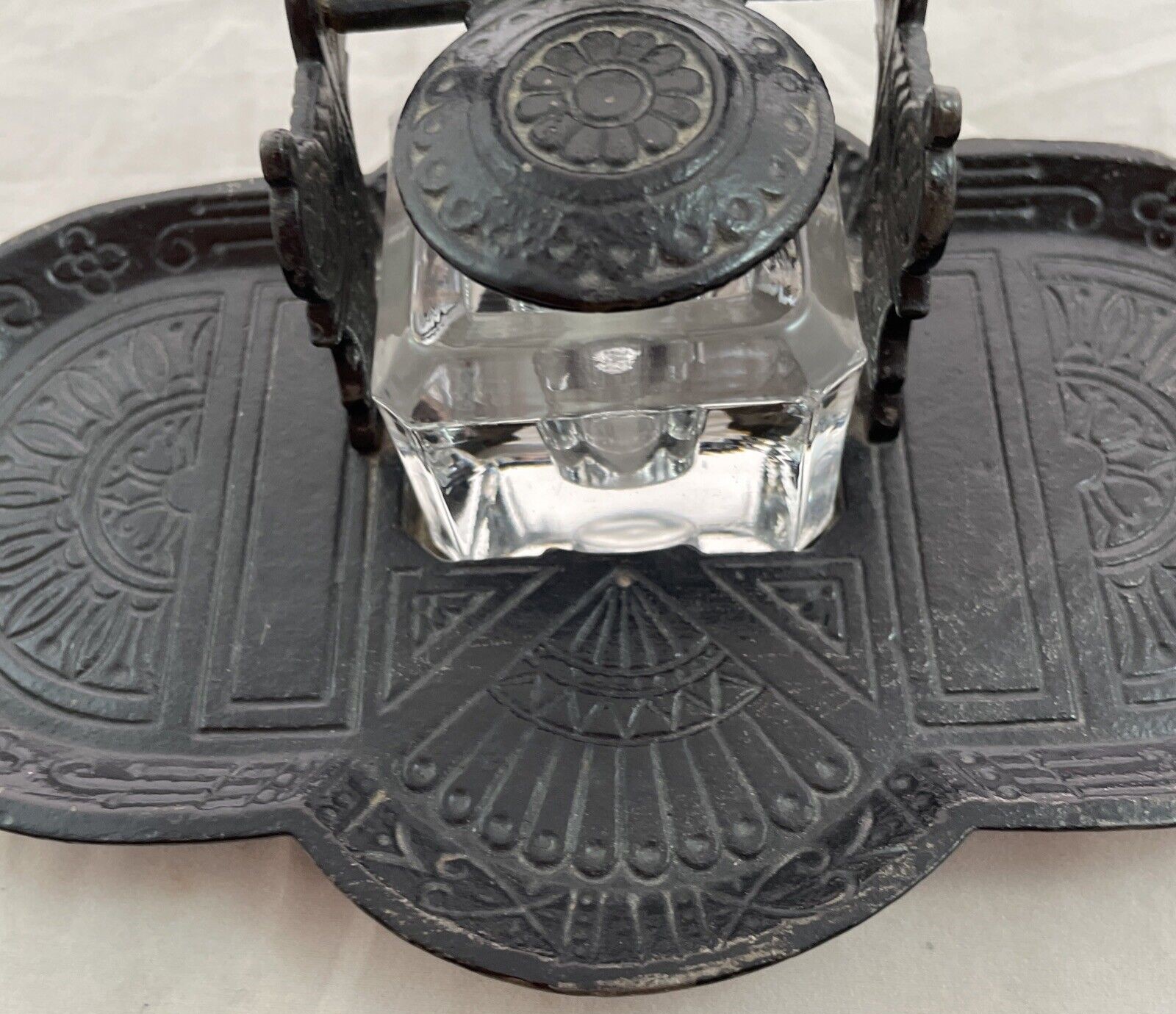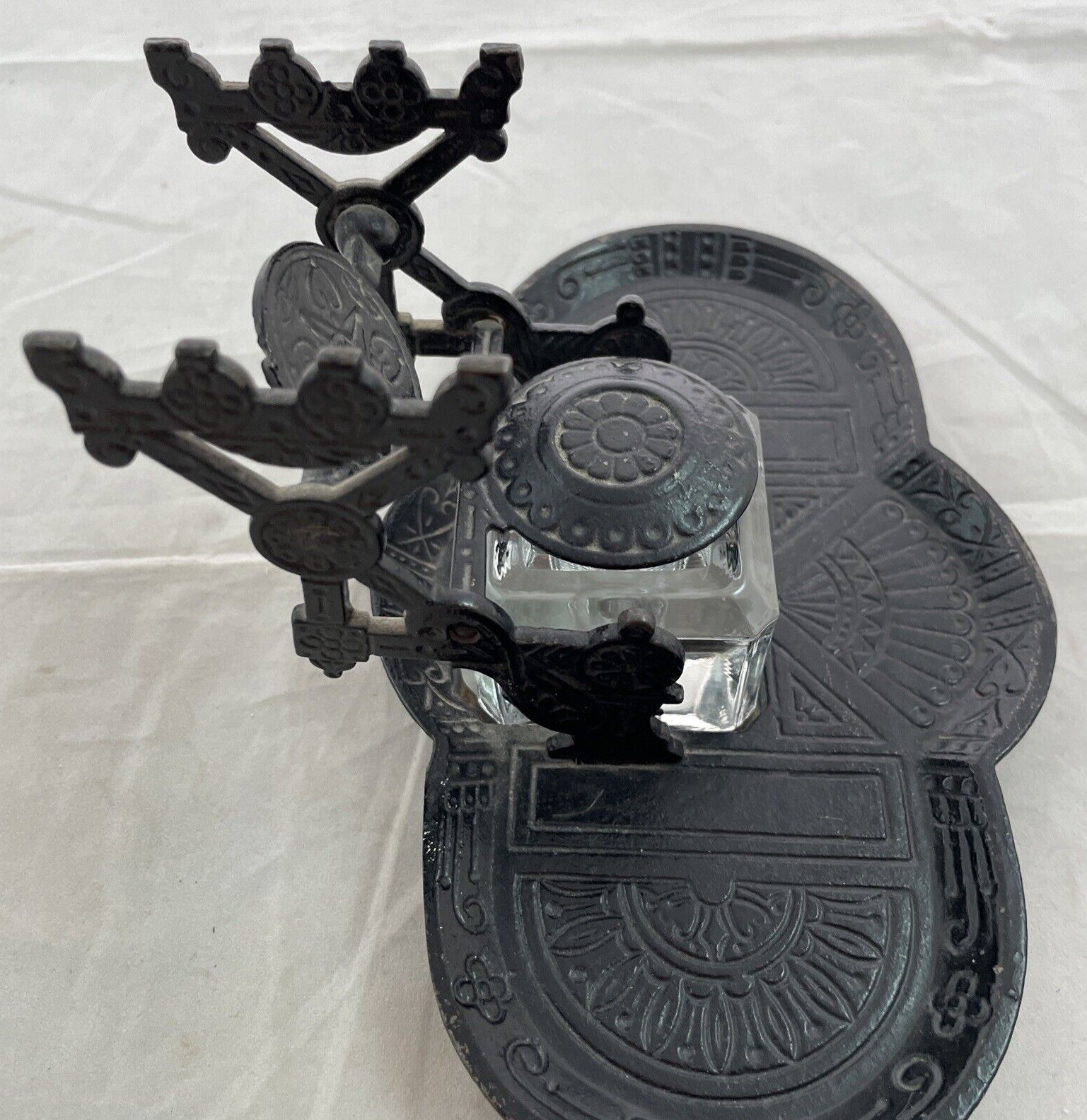 The pressed glass inkwell is held in a cast iron inkstand. The lid is attached to a bar on the frame and, when in use, lifts upright, resting on a disc. On top is a pen rack that can hold three pens. The circular shell base can hold writing implements.